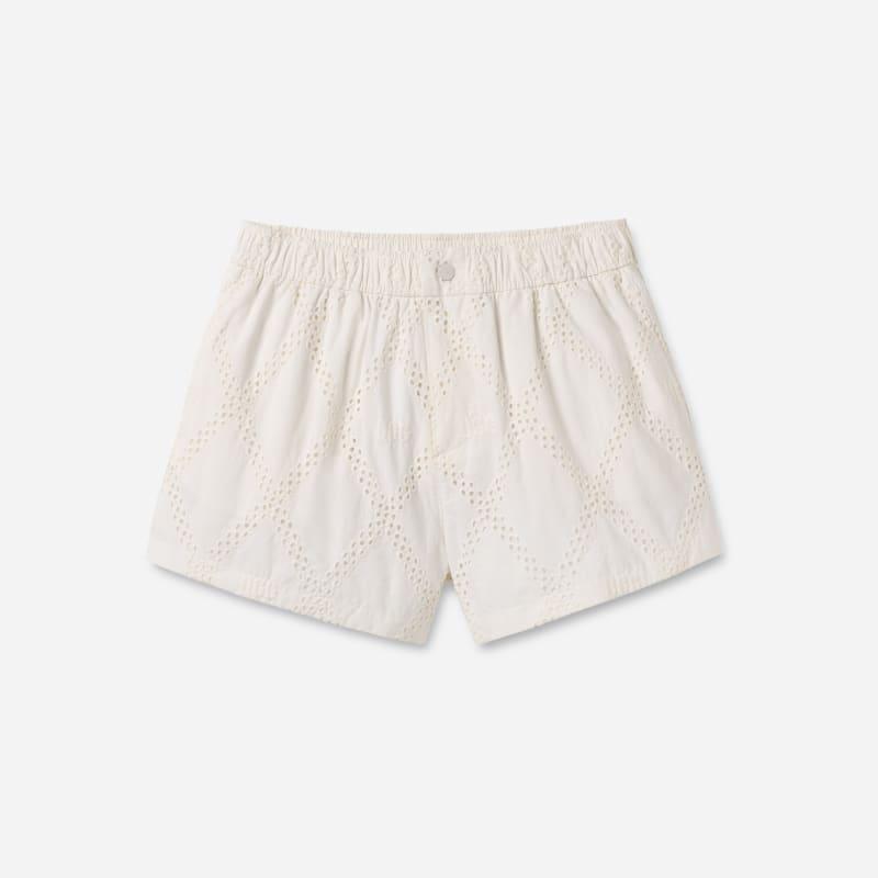 The Kellan Short UGGEyelet is short in length-but not in style. Allover eyelet with our Graphic UGG Font creates an iconic pattern on these lightweight shorts. Designed for the warmest of days with Responsible Cotton and an easy pull-on waist. It pairs perfectly with our Jessamine Pullover. Eyelet short. Self - 100% Cotton. Made from Responsible Cotton. Lining - 100% Cotton. Elastic waistband. Nylon coil zip fly with The UGG Logo snap closure. Side seam pockets. Back patch pocket on wearers right side. All over embroidered The Graphic UGG font. 3 inch Inseam [Size S]. Imported. UGG Womens Kellan Short UGGEyelet Cotton Shorts in Nimbus, Size XS