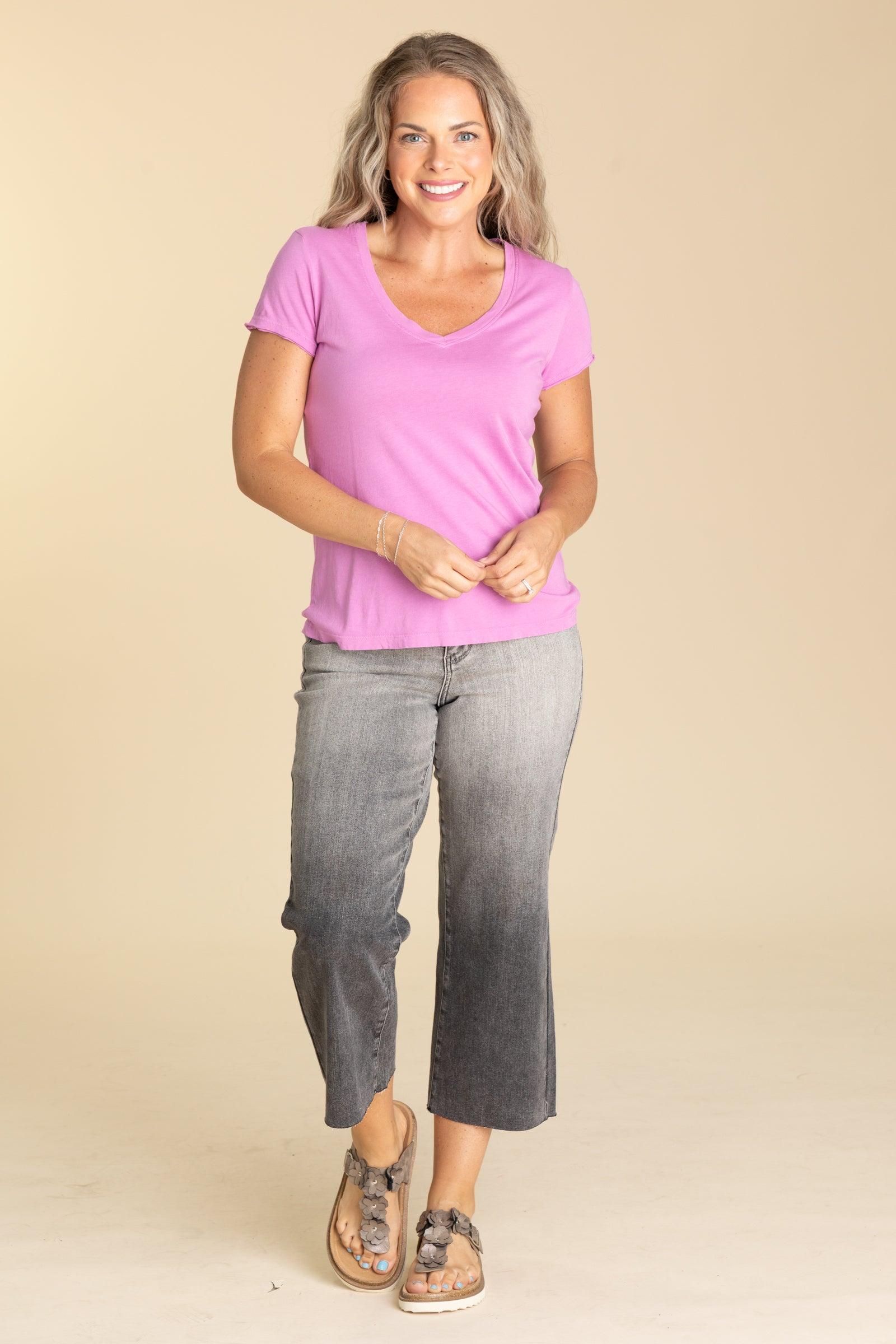 Product Details Colors: Berry/ Caramel/ Charcoal/ Aqua/ Yellow Print: Solid Neckline: V-Neck Sleeve: Short Sleeve Hemline: Straight Brand: Be Cool Material and Care 50% Cotton 50% Rayon Hand Wash Cold Hang/Line Dry Size and Fit Small: Bust 36" Waist 34" Length 24.5" Medium: Bust 38" Waist 36" Length 25" Large: Bust 40" Waist 38" Length 25.5" Erica is 5’7” and wearing her true size small