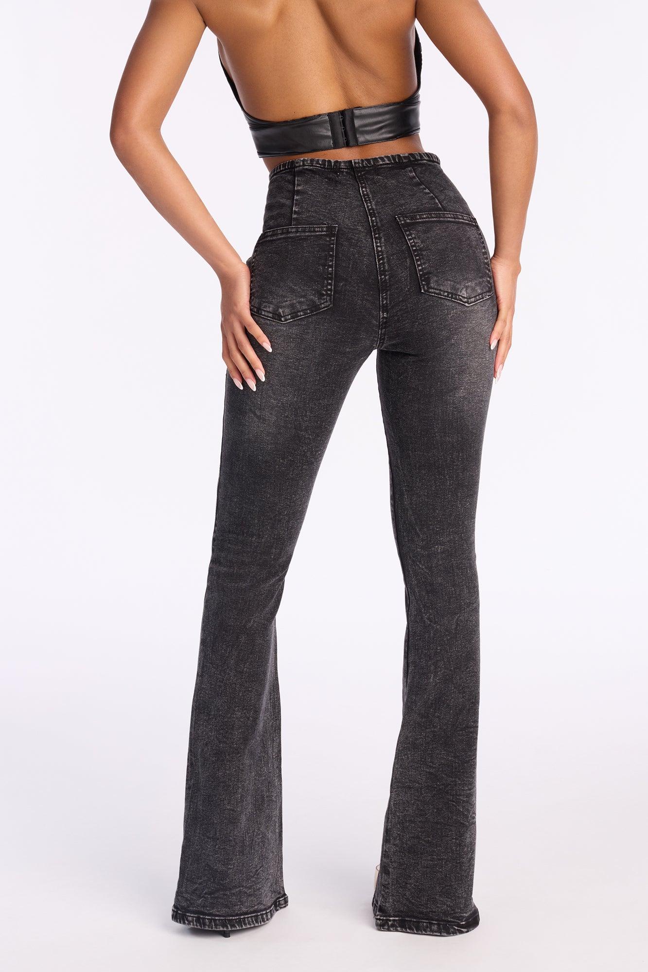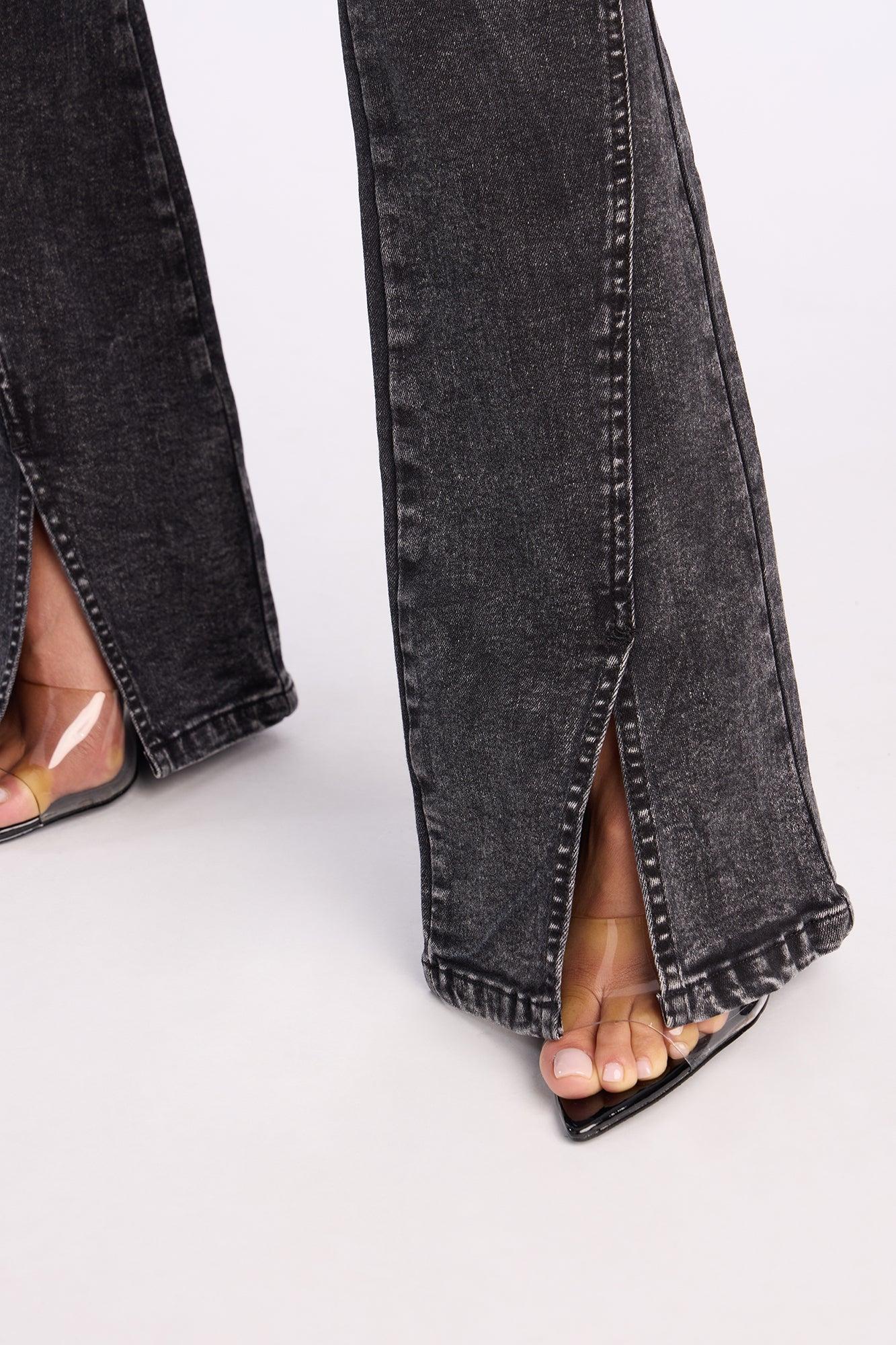 Available In Acid Wash Black. Flare Leg Jean Non Functional Front Pockets Back Pockets Button Fly Cut Off Waistband Split Hem 10" Rise 34" Inseam Medium Stretch Disclaimer: Due To The Specialized Wash Process, Each Garment Is Unique. Self: 66% Cotton 25% Polyester 8% Rayon 1% Elastane Imported California Proposition 65WARNING: Cancer and Reproductive Harm - www.P65Warnings.ca.gov.