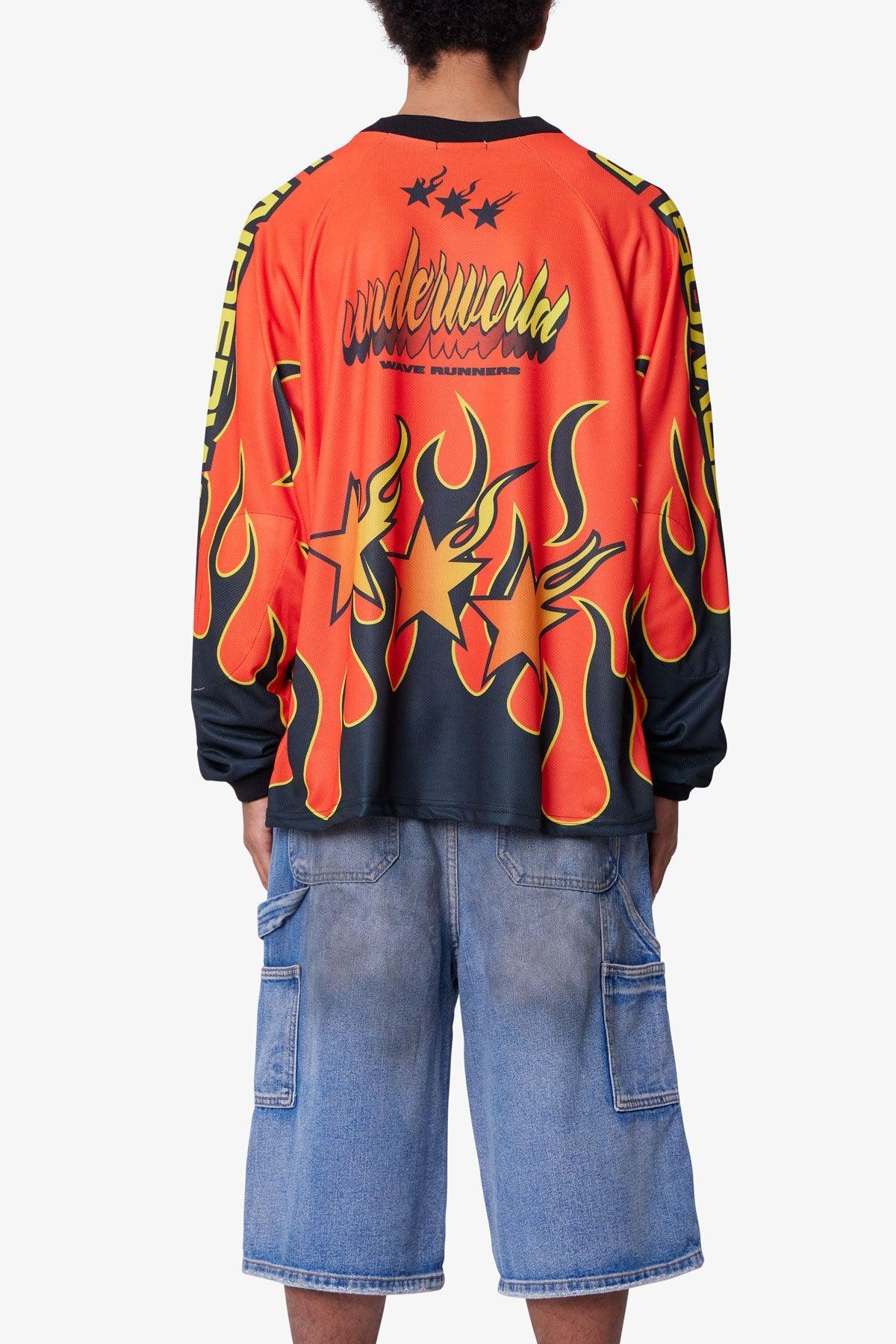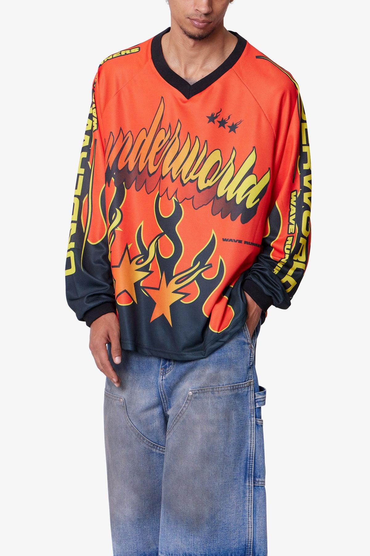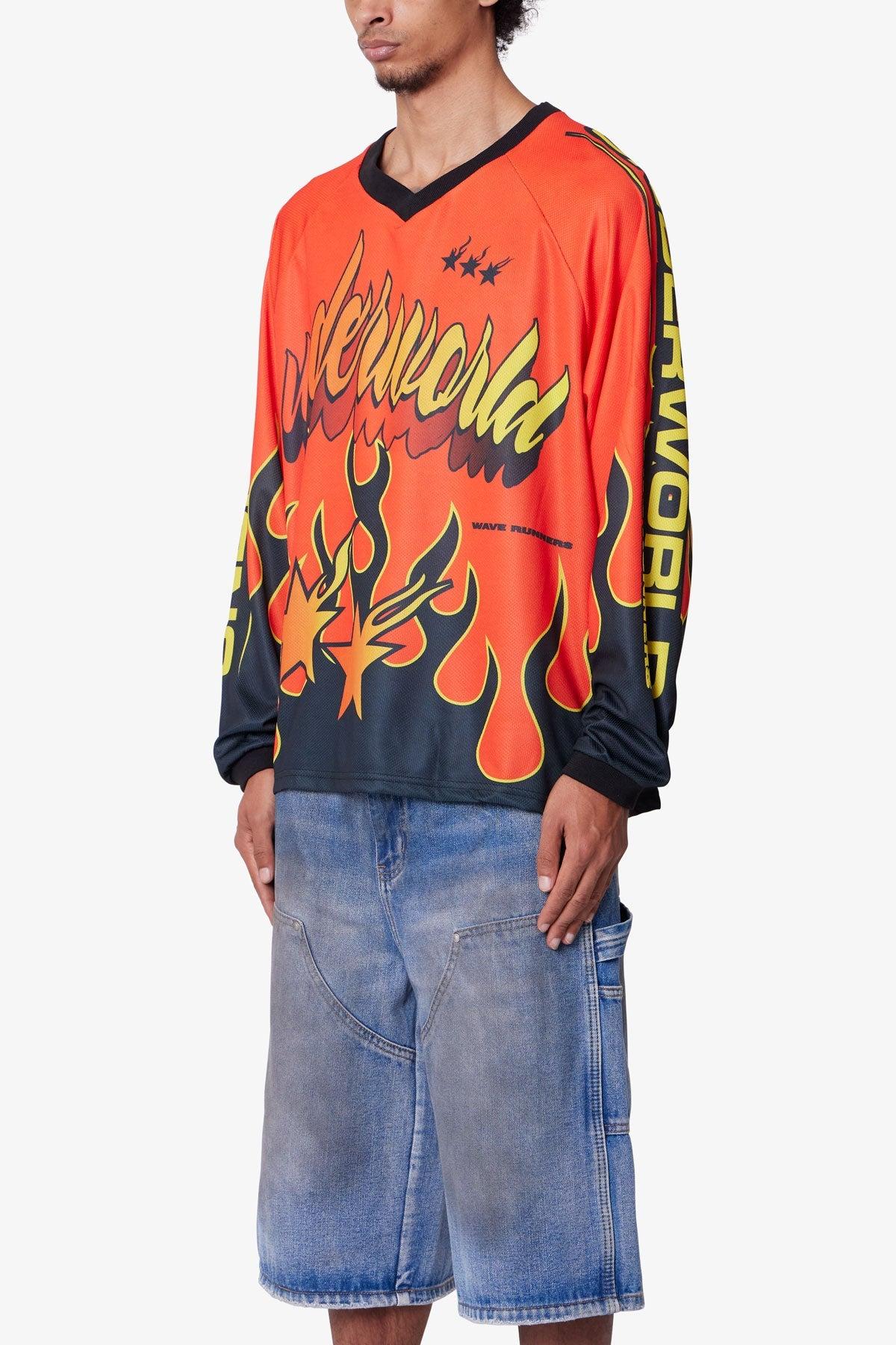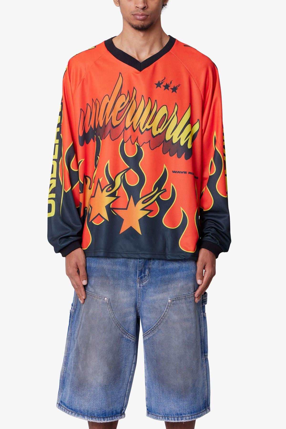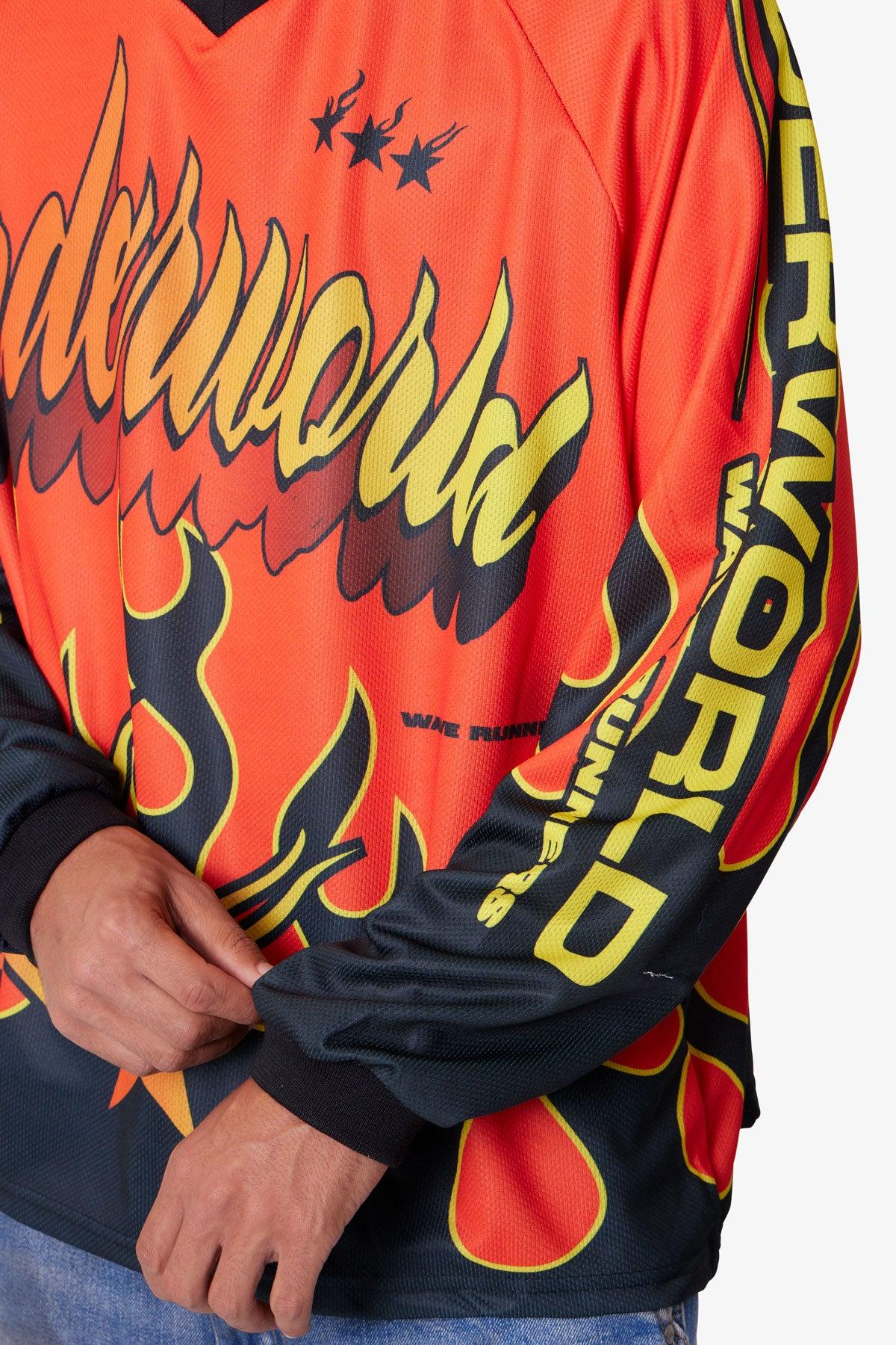 Constructed from lightweight 100% polyester, this motocross-style jersey features a roll-printed flame graphic with Underworld text across the front. Designed with a standard fit, it includes a ribbed v-neck, raglan sleeves, and ribbed cuffs for added structure and shape. details Standard fit 100% polyester constructio