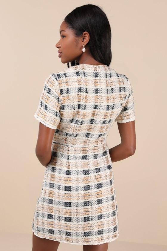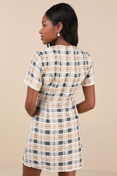 The compliments will be flowing wherever you go in the Lulus Uniquely Posh Beige Tweed Sequin Lurex Short Sleeve Mini Dress! Midweight woven tweed boasts tinsel-like orange Lurex threading, shiny sequins, and navy blue threading throughout as it shapes short sleeves and a crew neckline. Bodice has a functional button placket at front, which features cutout gold buttons with faux pearl accents. Fitted waist tops a figure-skimming skirt that has two decorative welt pockets (with matching buttons) and a mini hem. Lace trim accents the sleeves and hem. Hidden zipper/clasp at back.