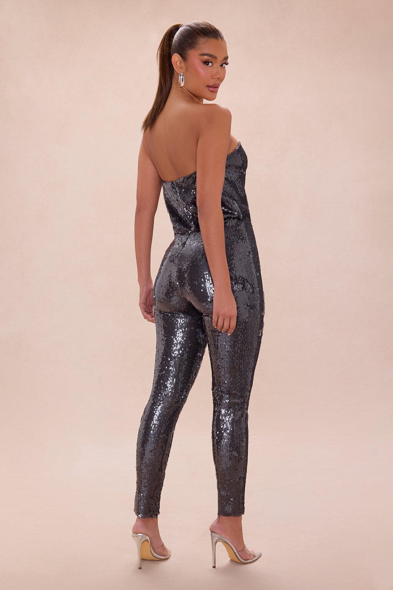 Available In Gunmetal And Wine. Sequin Jumpsuit Strapless Deep V- Neckline U- Wire Grip Tape Hidden Back Zipper Closure Lined Stretch Shell: 95% Polyester 5% Spandex Lining: 100% Polyester Imported California Proposition 65WARNING: Cancer and Reproductive Harm - www.P65Warnings.ca.gov.