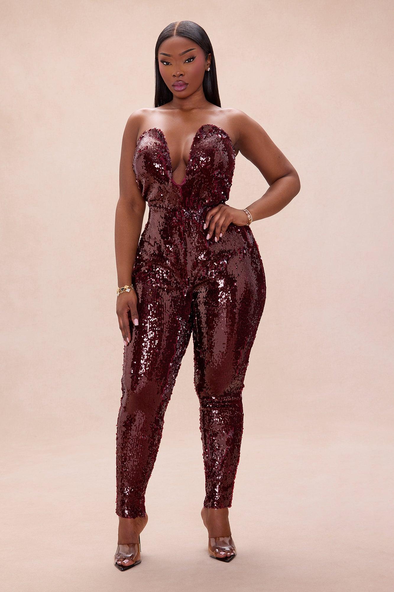 Available In Gunmetal And Wine. Sequin Jumpsuit Strapless Deep V- Neckline U- Wire Grip Tape Hidden Back Zipper Closure Lined Stretch Shell: 95% Polyester 5% Spandex Lining: 100% Polyester Imported California Proposition 65WARNING: Cancer and Reproductive Harm - www.P65Warnings.ca.gov.