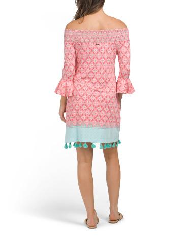 Upf 50 Sun Protection, Smocked Neckline, Printed Design, Bell Sleeve, Fabric Provides Stretch, Tasseled Hem, Off The Shoulder, Straight Neck, Mini Dress, 36In Long, Taken From Size S, Pull On, Nylon/spandex, Imported | UPF 50 Tides Smocked Mini Dress for Women