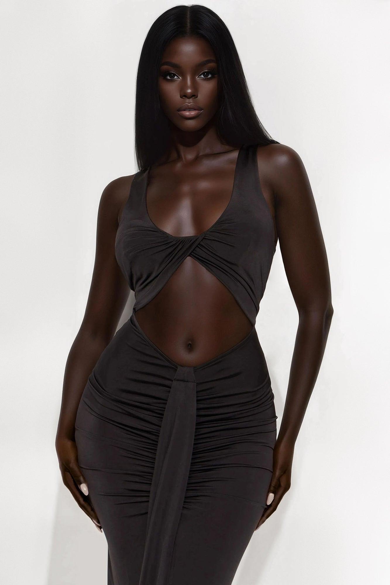Available In Black And Royal. Maxi Dress Sleeveless Scoop Neckline Cut Out Ruched Drape Hidden Back Zipper Closure Stretch Self:95%Polyester 5%Spandex Imported California Proposition 65WARNING: Cancer and Reproductive Harm - www.P65Warnings.ca.gov.