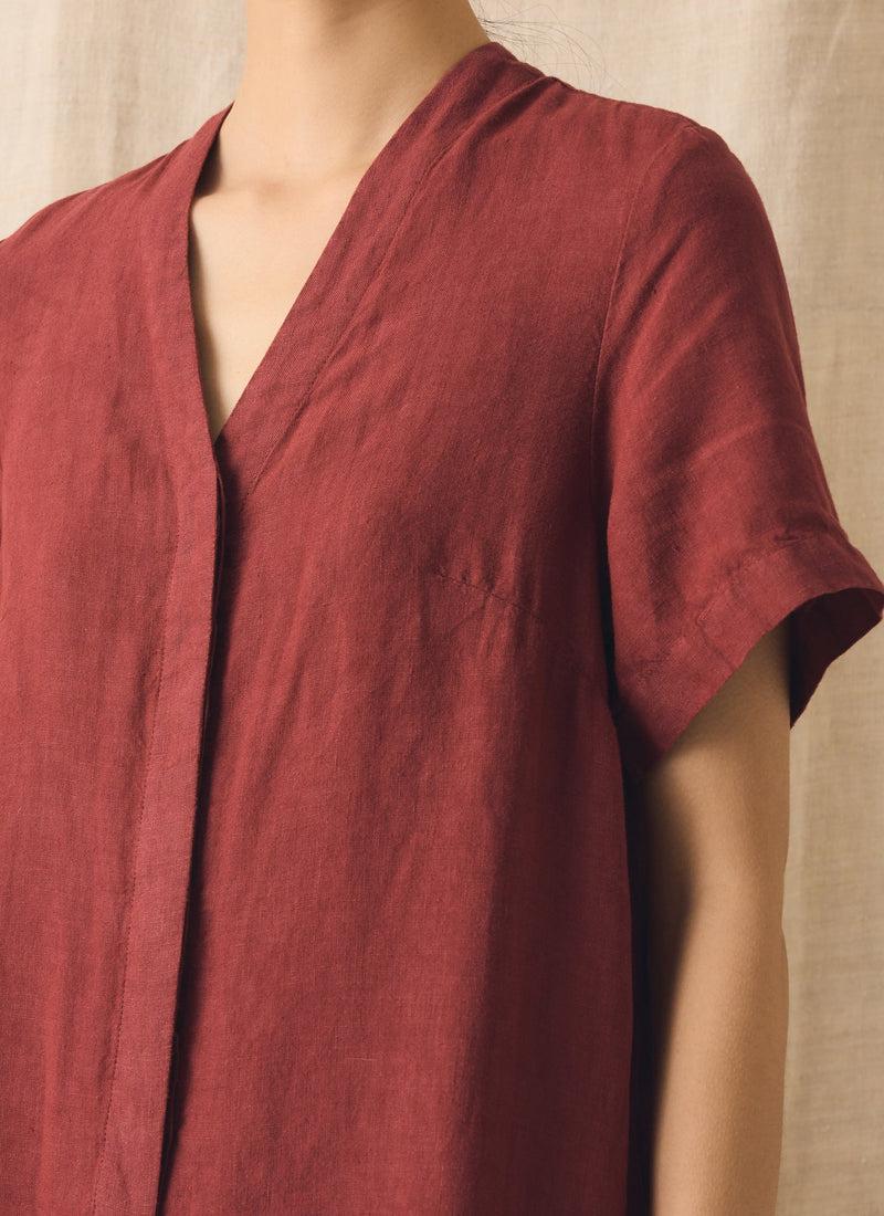 Linen. Easy fit. V-neck. Short sleeves. Side seam pockets. Back patch pocket. Wide legs. Lower-calf length. Internal herringbone hanging loop. Concealed corozo-buttoned placket.