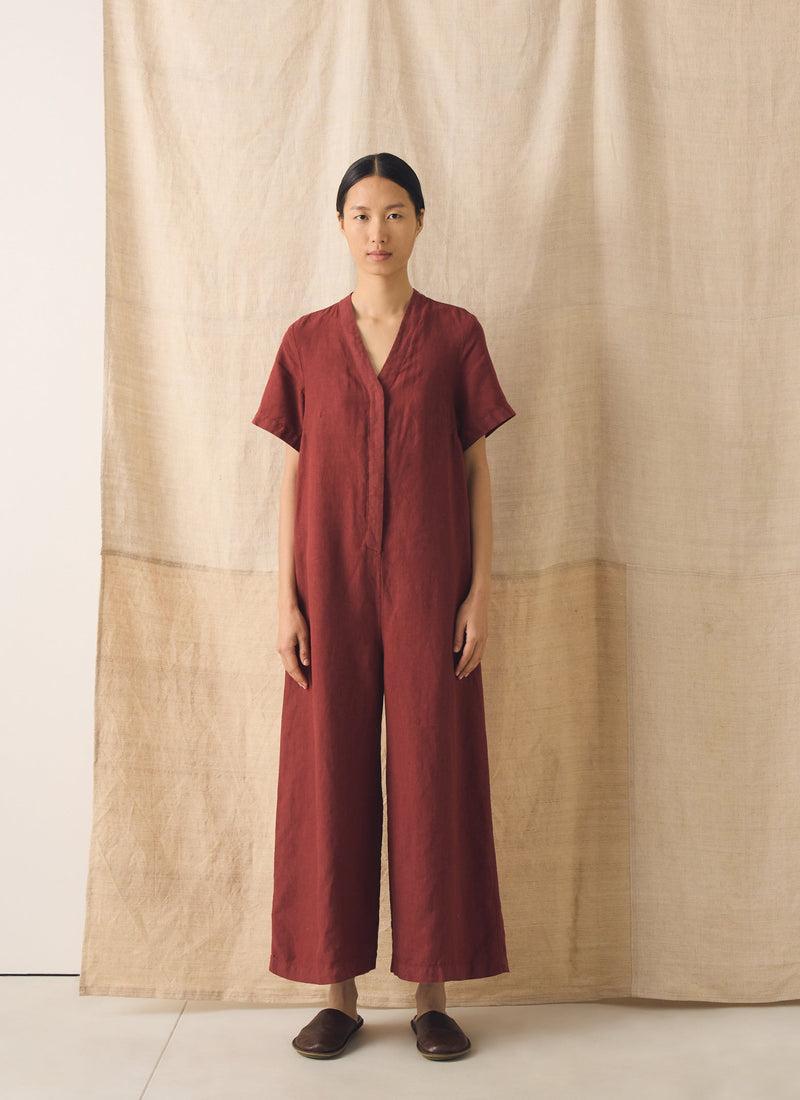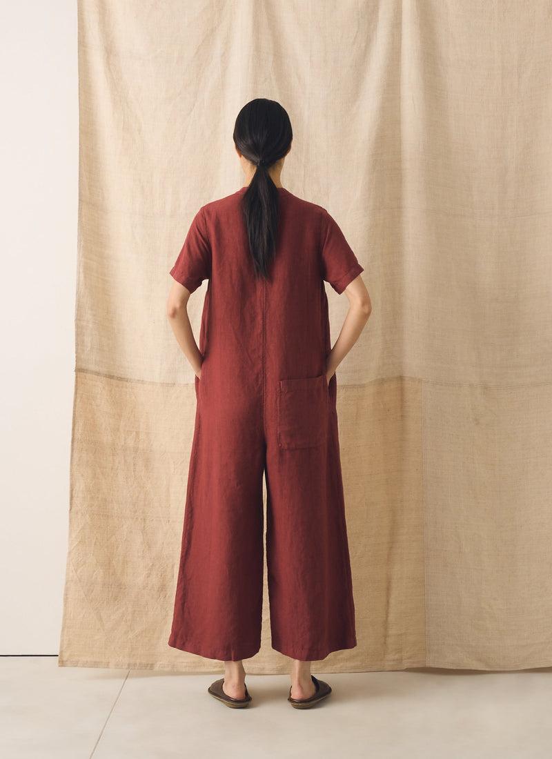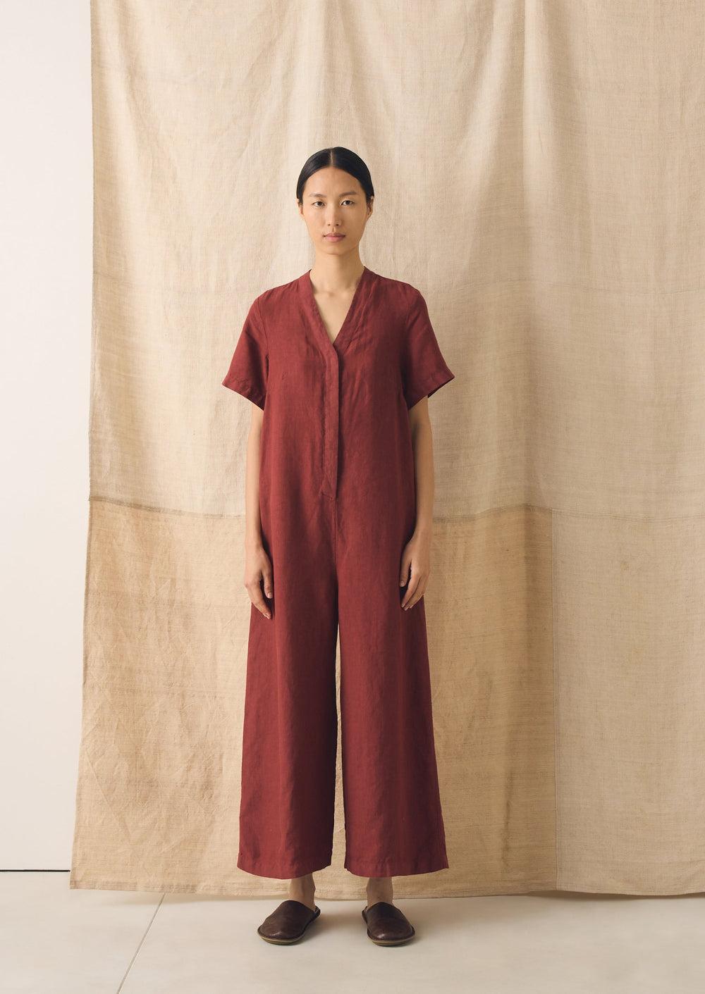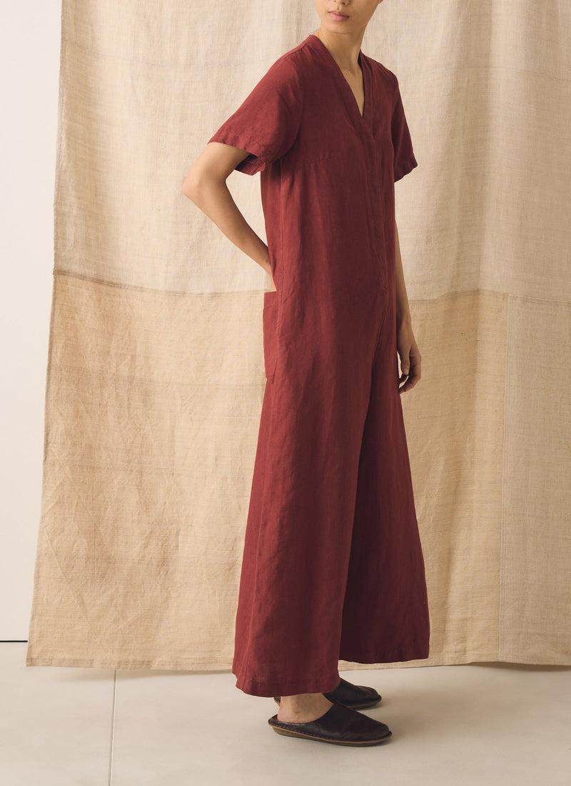 Wide legs bring easy movement to our linen jumpsuit. Shaped with a V-neck and short sleeves, punctuated by a back patch pocket, then garment-dyed for rich depth of colour.