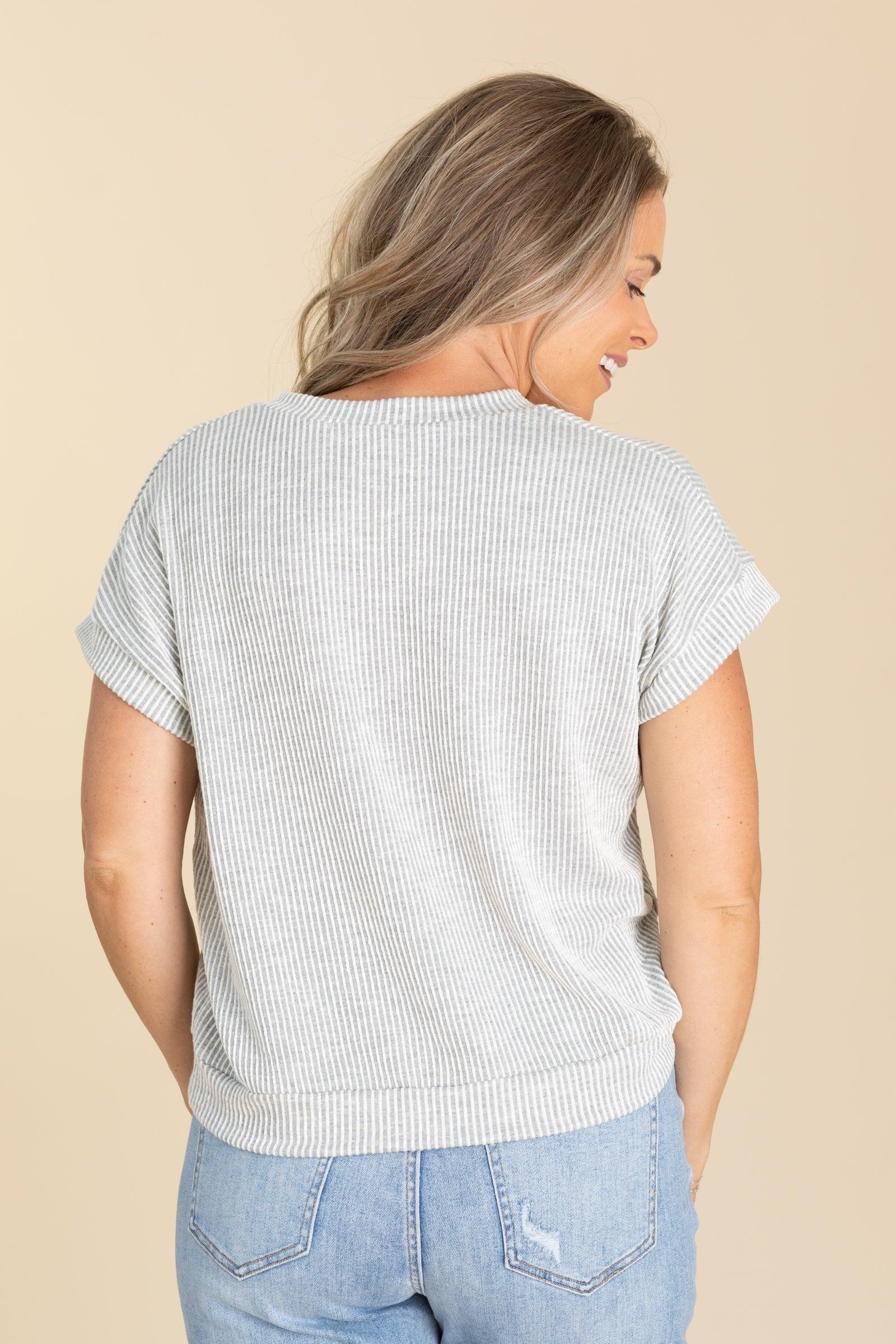 Product Details Colors: Mocha/ Grey Print: Solid Neckline: V-Neck Sleeve: Short Sleeve Hemline: Straight Brand: Lovely Melody Material and Care 53.5% Rayon 44.5% Polyester 2% Spandex Machine Wash Cold Tumble Dry Low Made in the USA Size and Fit Small: Bust 44" Waist 44" Length 21.5" Medium: Bust 46" Waist 46" Length 22" Large: Bust 48" Waist 48" Length 22.5" X Large: Bust 50" Waist 50" Length 23" Erica is 5’7” and wearing her true size small