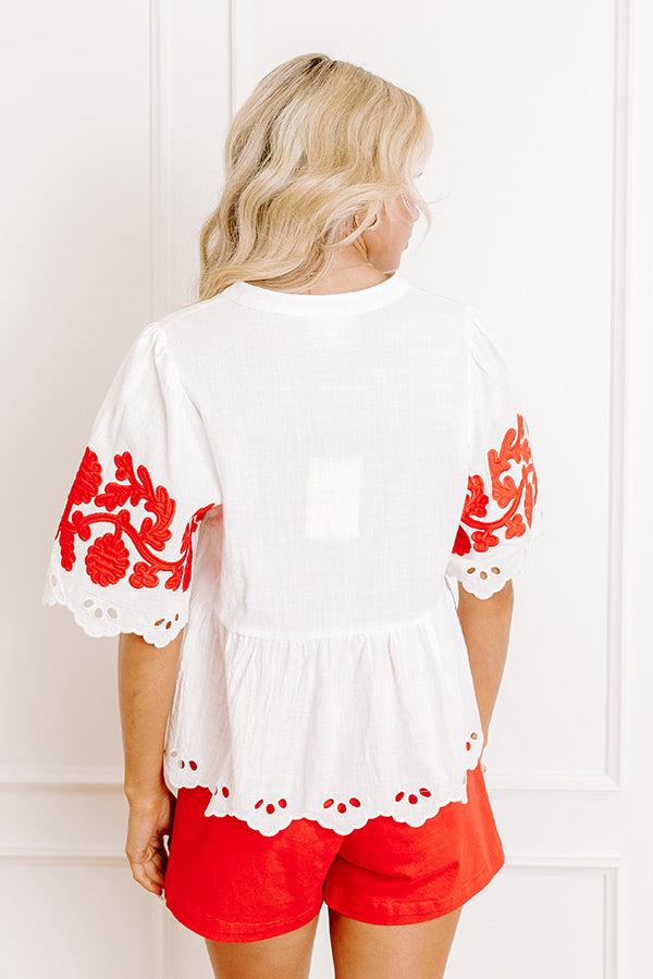 - Flirty and feminine! This eyelet top brings all the charm with its peplum design and delicate floral embroidery. Perfect for adding a stylish touch to your everyday look, it's the kind of piece that makes any outfit feel effortlessly pretty. - Unlined material - A v-cut neckline - Short, loose sleeves with floral embroidery, eyelet accents, and scalloped cuffs - A relaxed silhouette that ends in a scalloped peplum hemline with eyelet accents