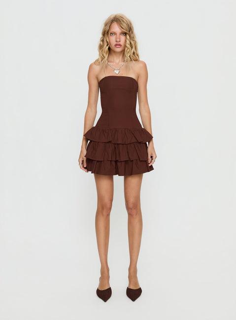 Solid chocolate brown mini dress with tiered ruffle detailing throughout