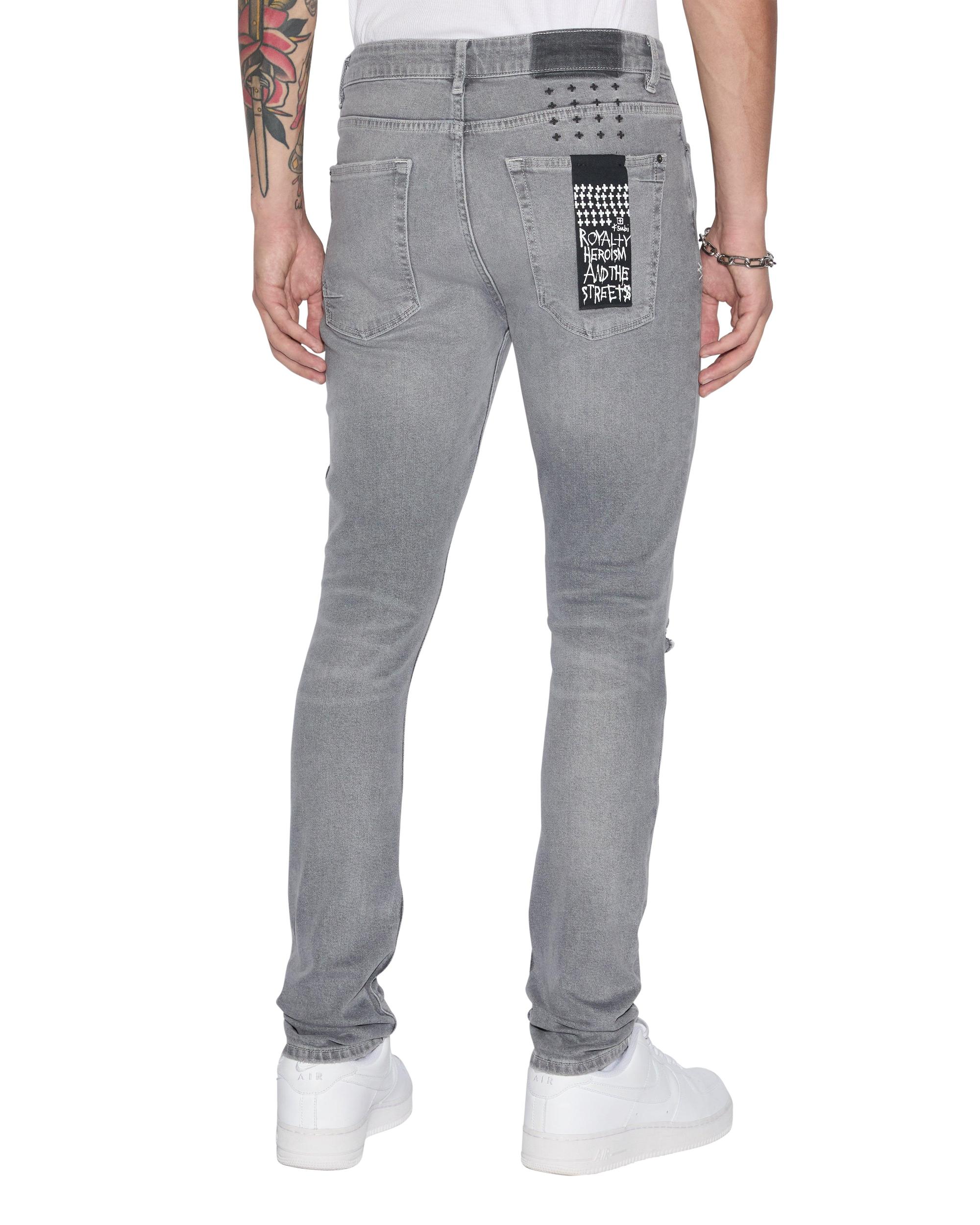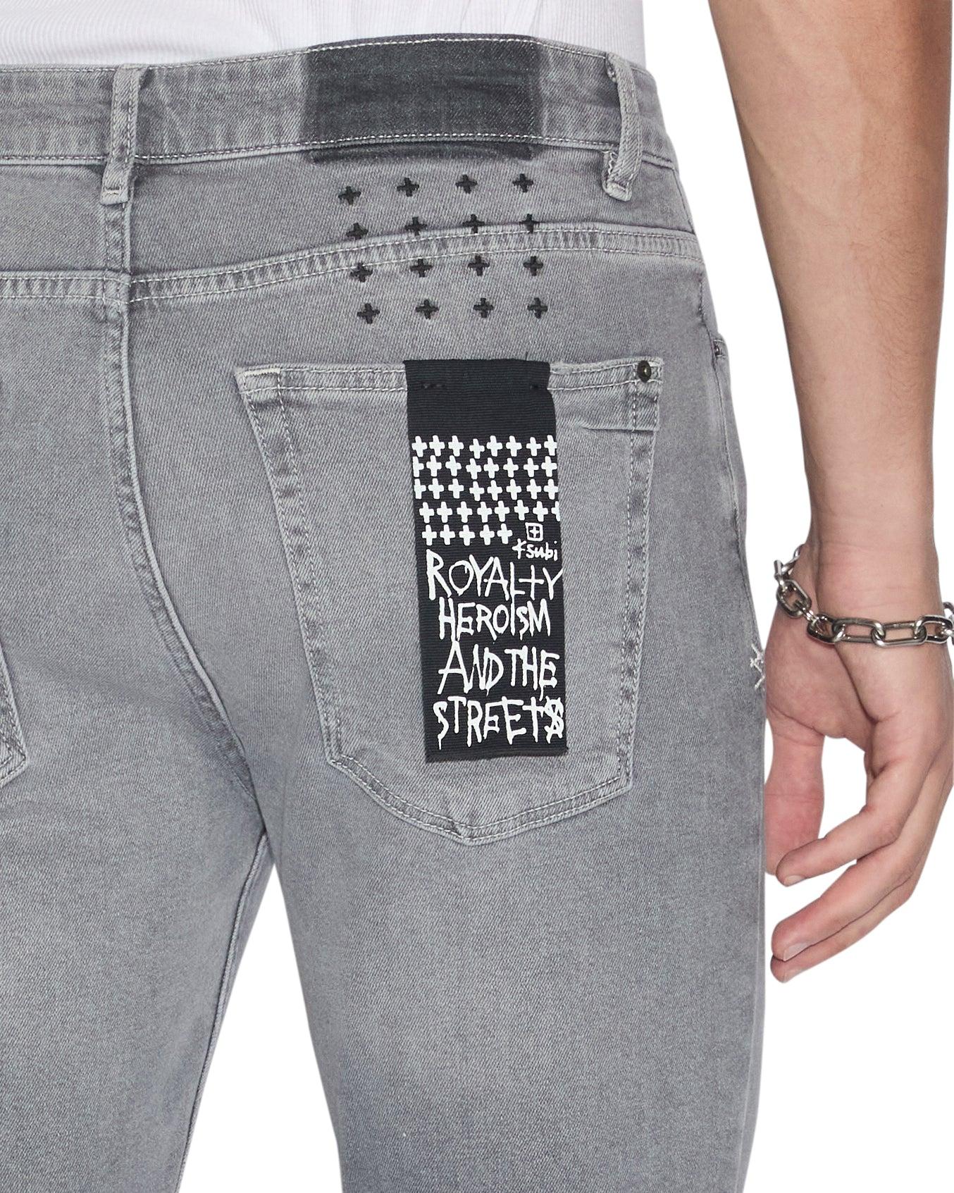 The Van Winkle Thrifted is a full length skinny jean, made from a premium comfort stretch denim in a faded grey colourway. This mid-rise jean is detailed with knee deconstruction and the Ksubi 1999 Logo featured on the left knee. Finished with t-box and 4x4 embroidery, a unique angled belt loop and ghost patching detailing.