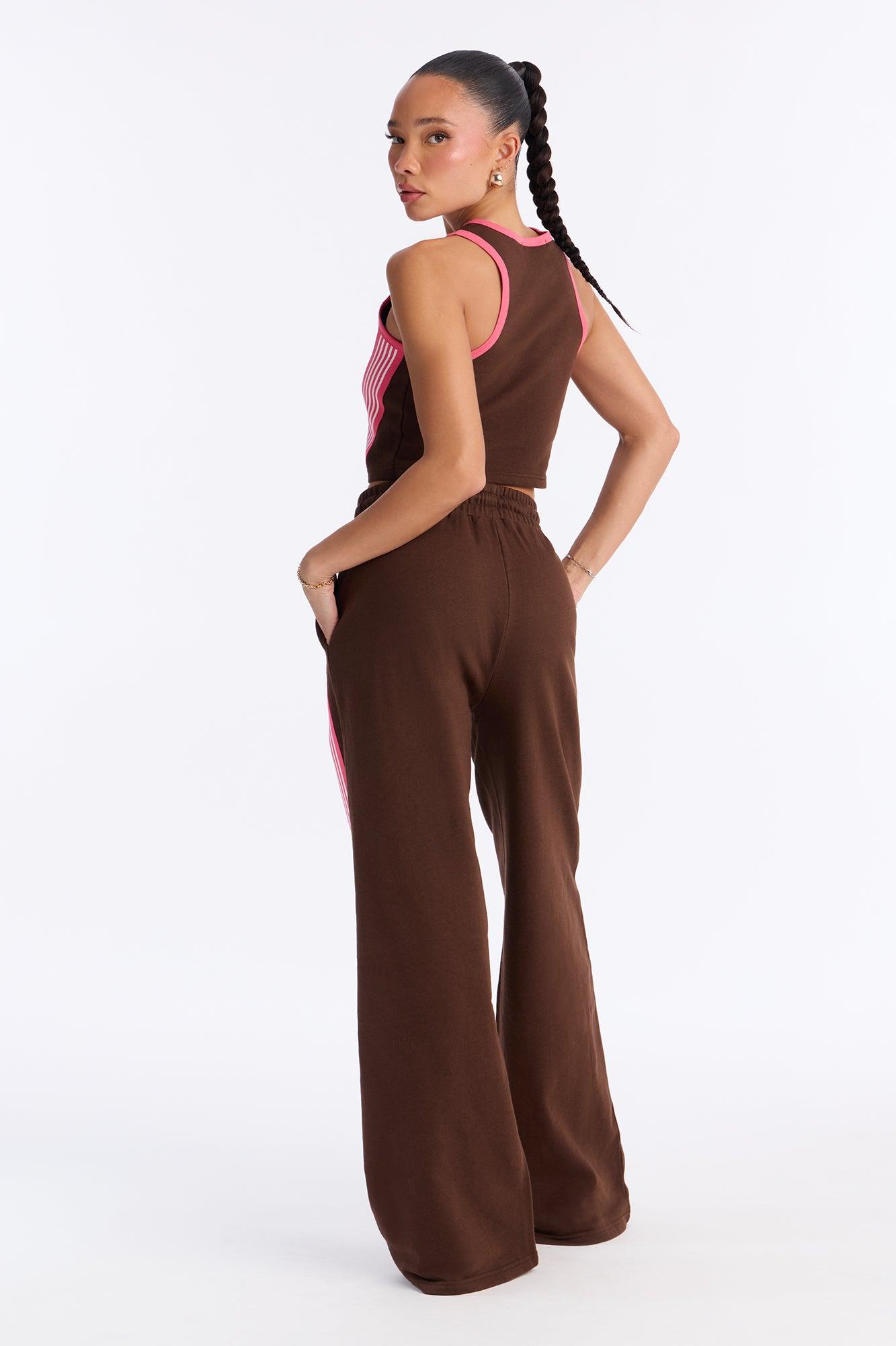 Available In Chocolate, Heathered Grey And Hunter. 2 Piece Ensemble Tank Top and Wide Leg Pant Set Stretch Regular 32" Inseam Elastic Waistband Pockets 100% Cotton Imported