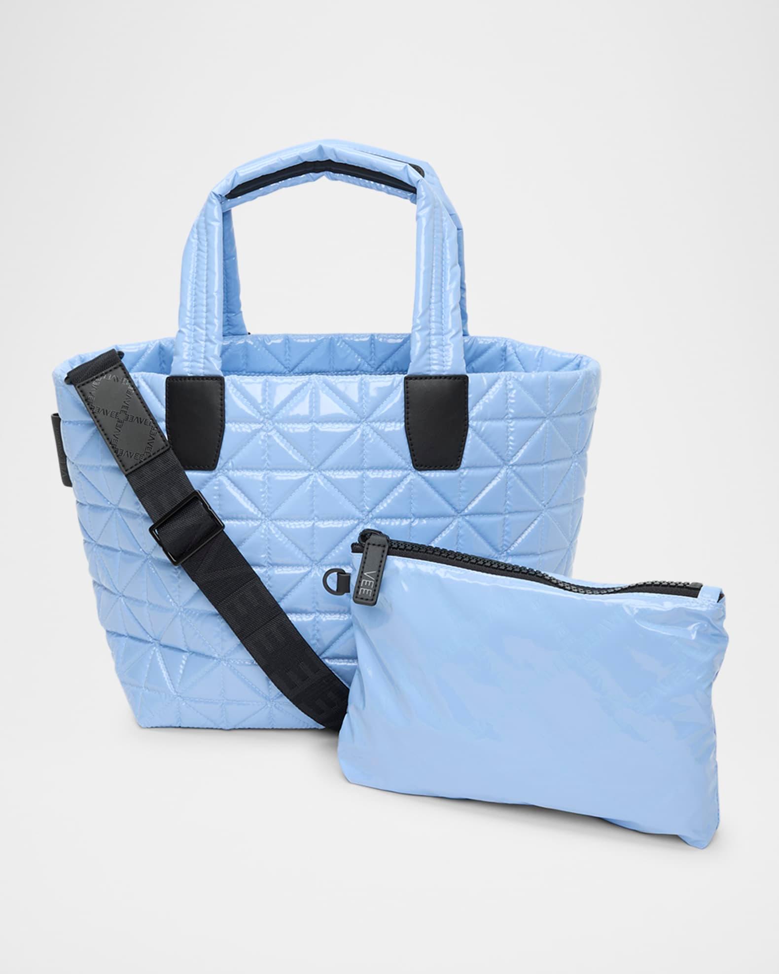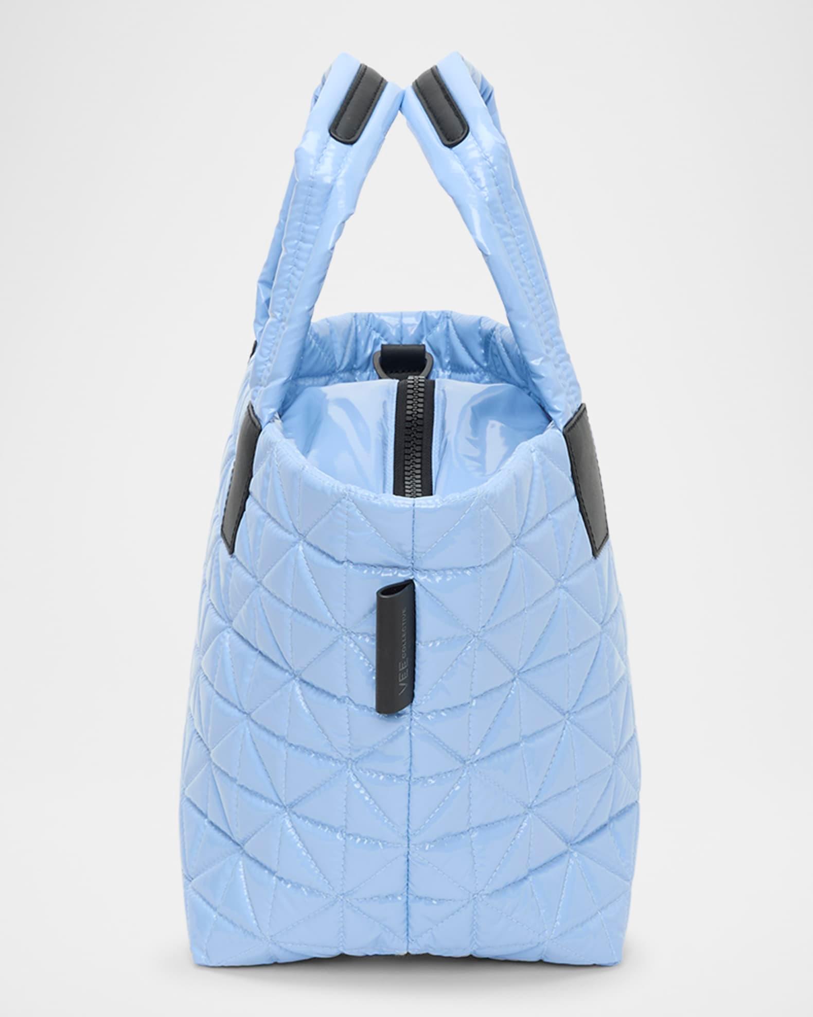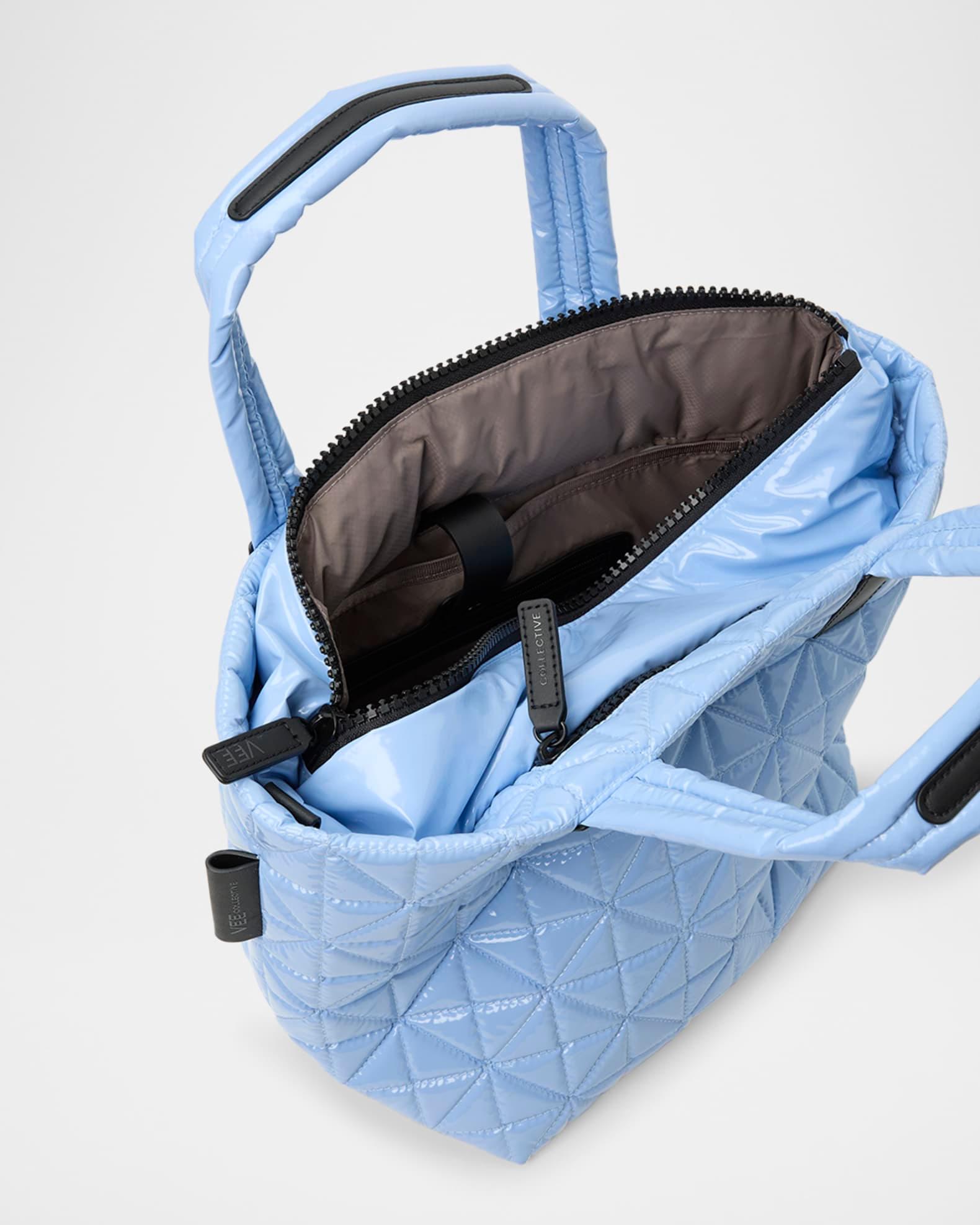 VeeCollective "Vee" lightweight, durable tote bag in water/stain-resistant and recycled vegan leather. Dual top handles Detachable, adjustable shoulder strap Top zip closure Can be worn as a crossbody or tote bag Exterior, two zip compartments Interior, one zip and two mesh interior compartments, removable nylon pouch Includes a 13'' laptop sleeve pocket Approx. 17.3"L x 8.6"W x 10.2"H Lining: recycled nylon Hand wash Imported