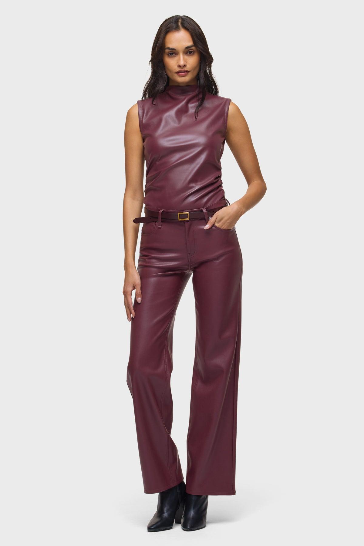 Description The Vegan Leather Top with Side Seam Ruching in Port Royal is a sleek sleeveless top that features elastic at the side seam for ruching. It is finished with a zipper at the center back for easy dressing. Product Details Body Length: 23", Chest: 33" Fit & Care Content: 100% Polyethylene (Faux Leather) Machine wash cold gentle cycle inside out Wash with like colors; do not bleach Line dry Low iron inside out if needed