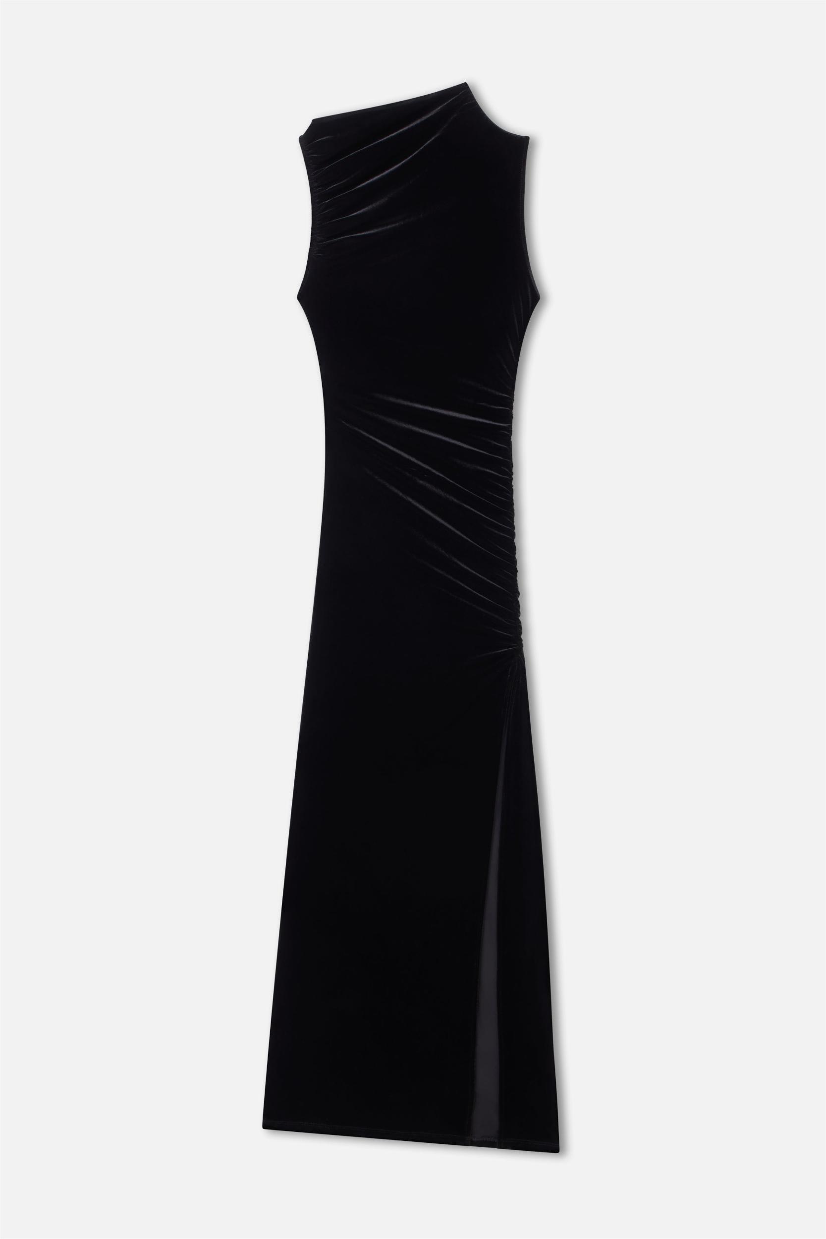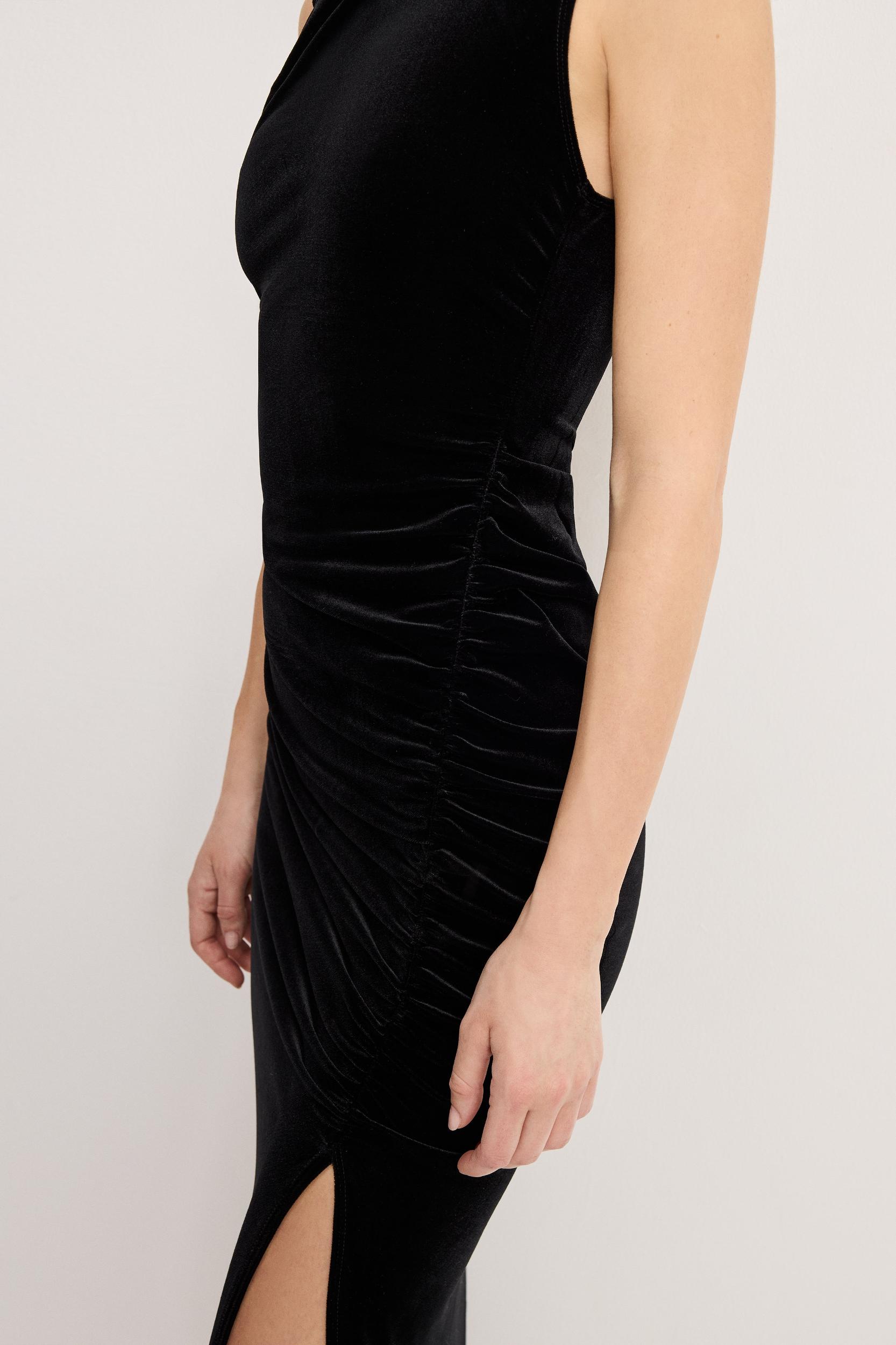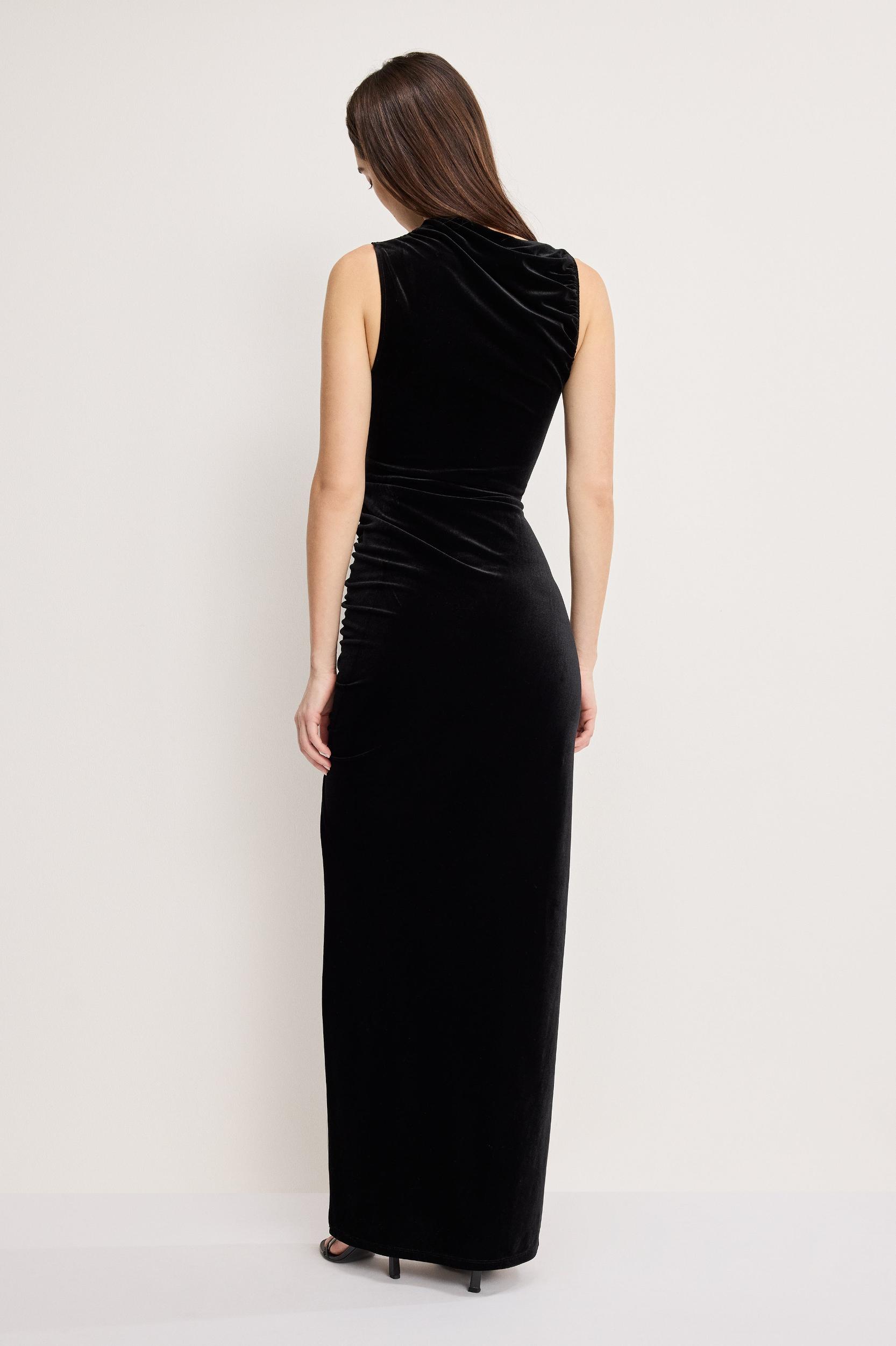Keep it simple and stylish with the Velvet High Neck Maxi Dress. Soft velvet feels comfortable and smooth, while the high neck adds a laid-back, polished touch. Ideal for when you want to look good without overdoing it. High neckline Bodycon fit Sleeveless Invisible side zipper Ruching at sides Maxi length Model is size XS, 5’9” and wearing size XS. Fabric: 92% Polyester, 8% Elastane Care: Machine wash cold with like colors. Do not bleach. Line dry. Do not iron. Dry cleanable.