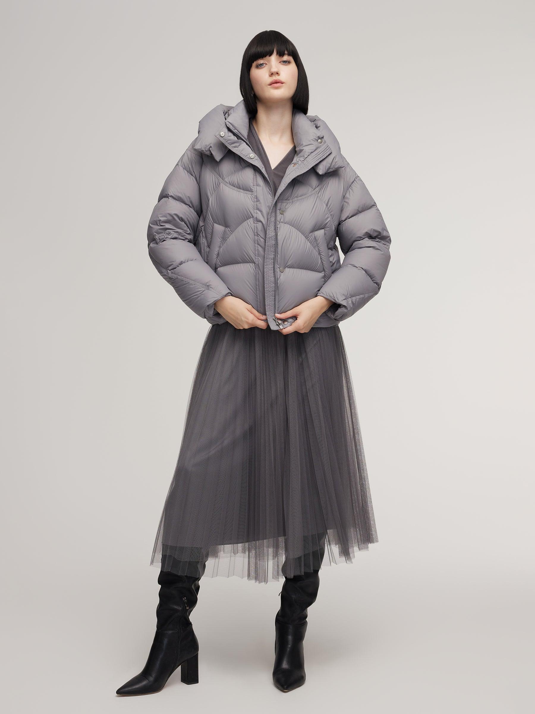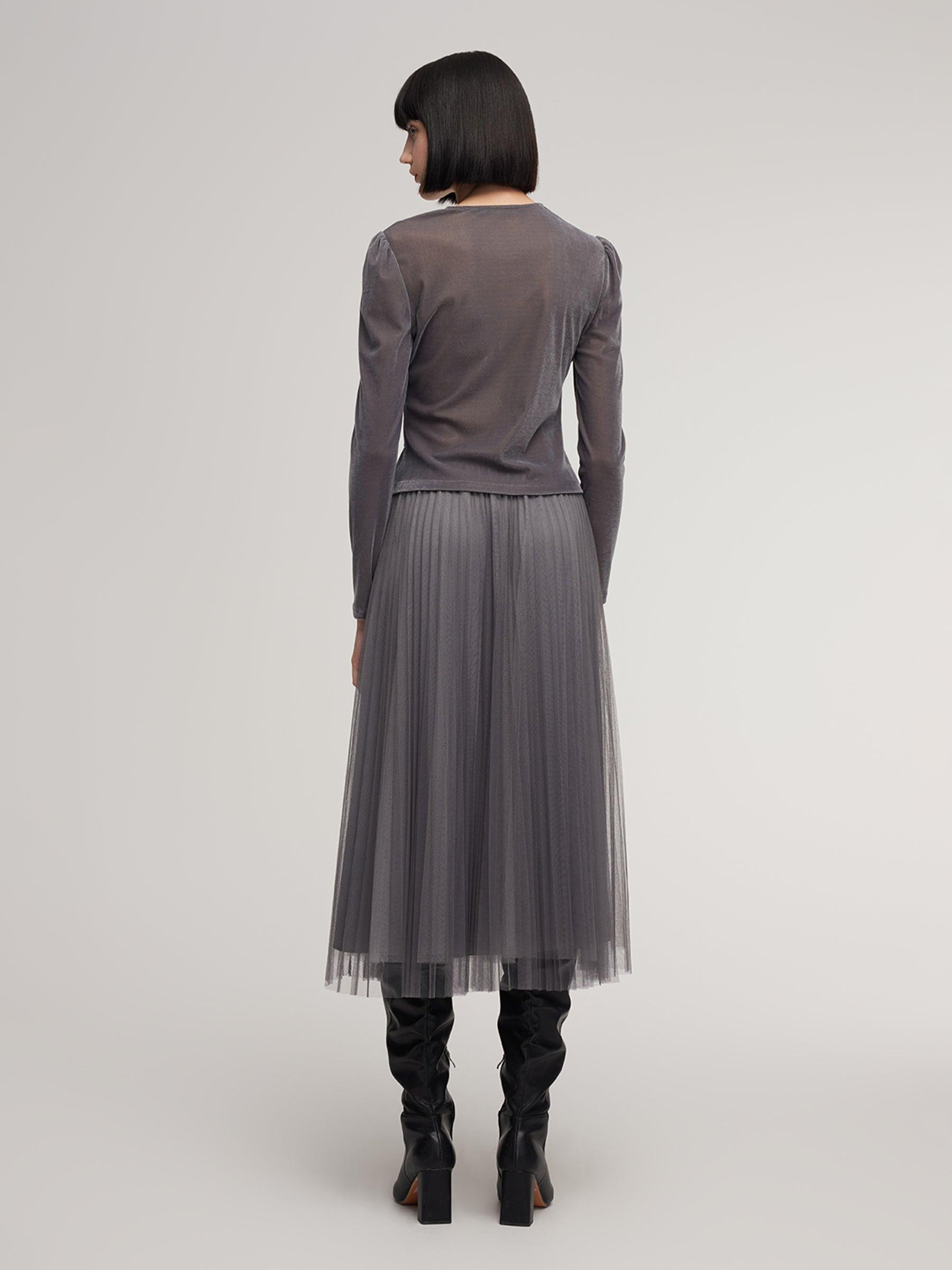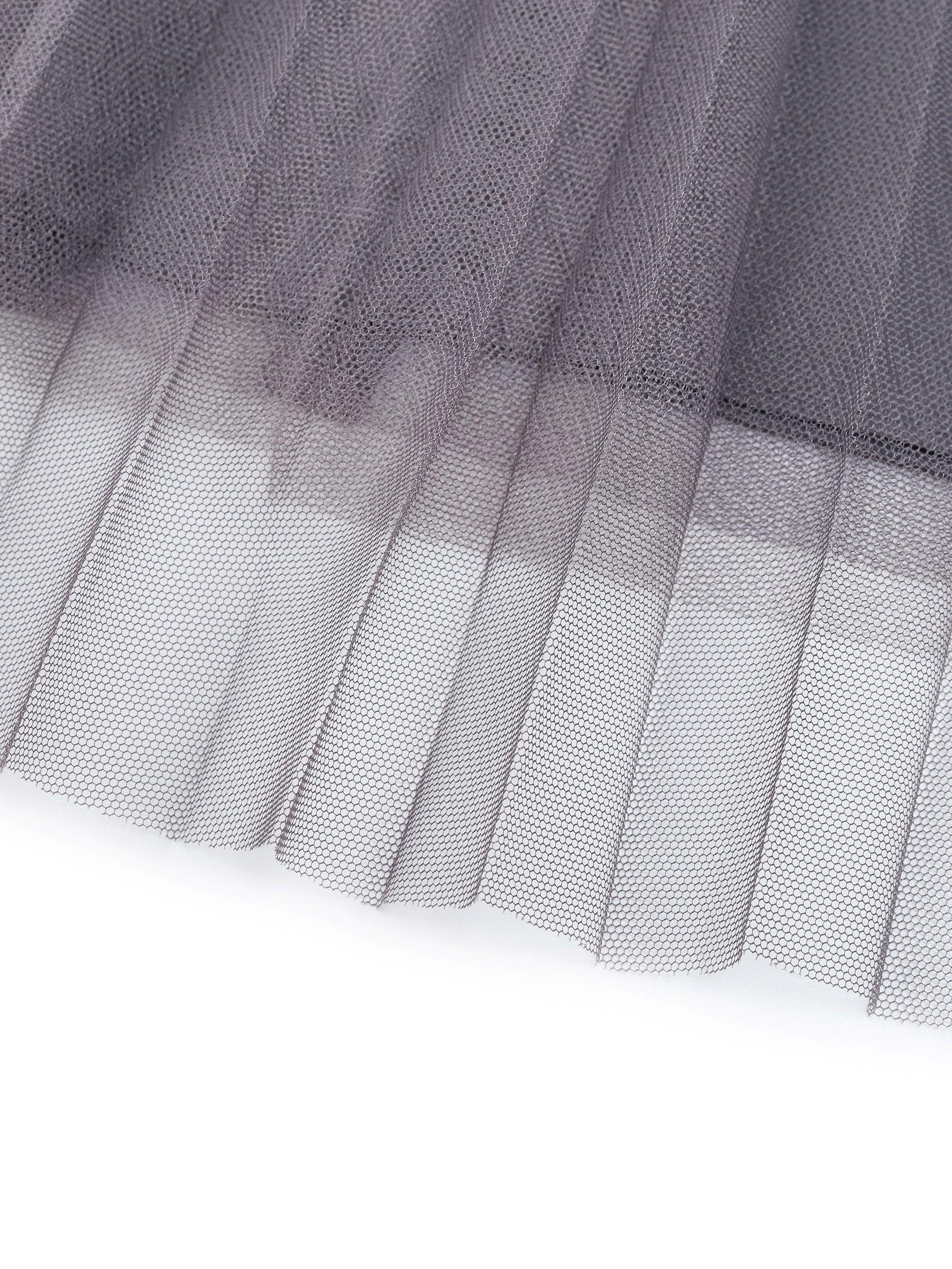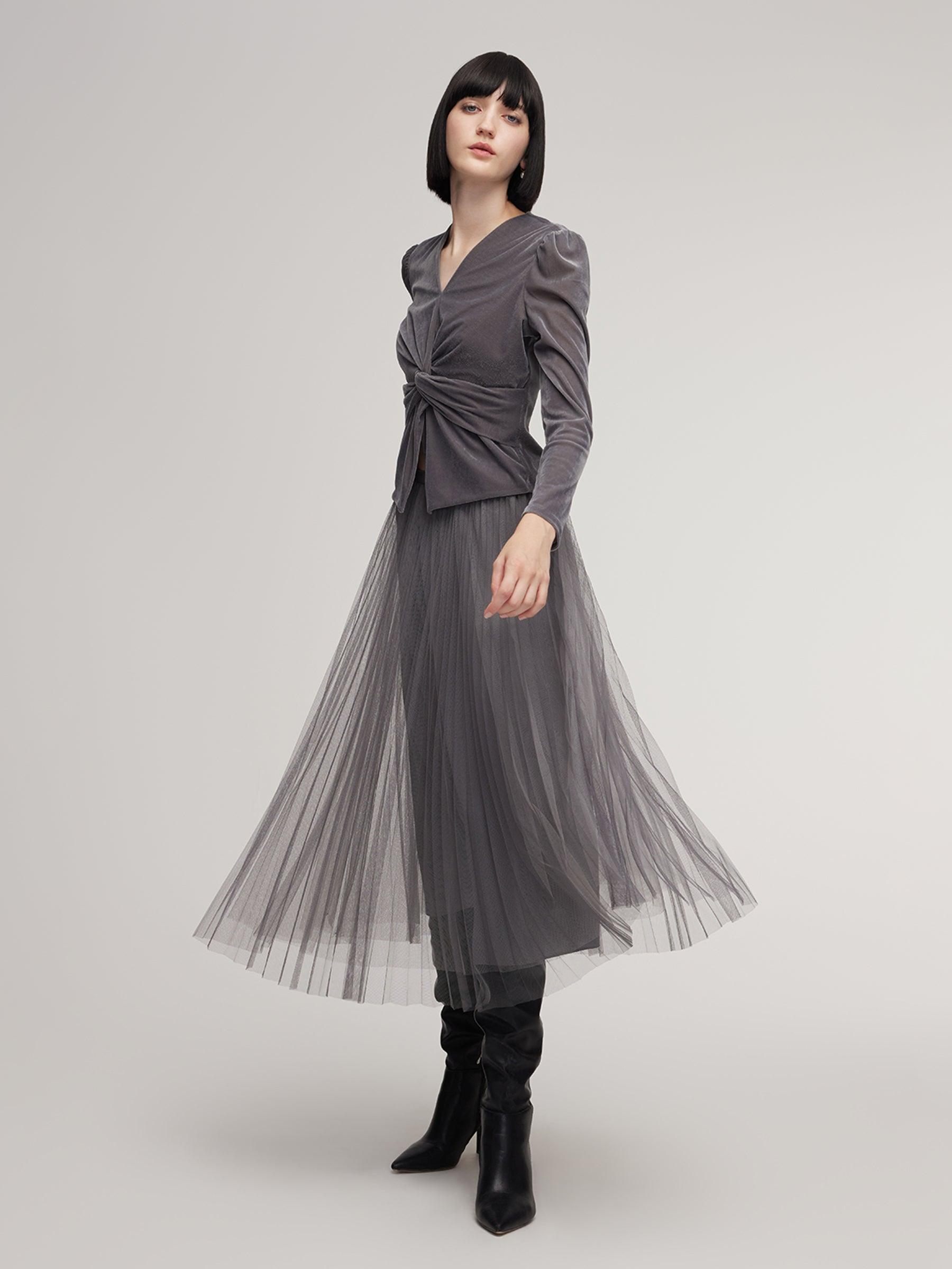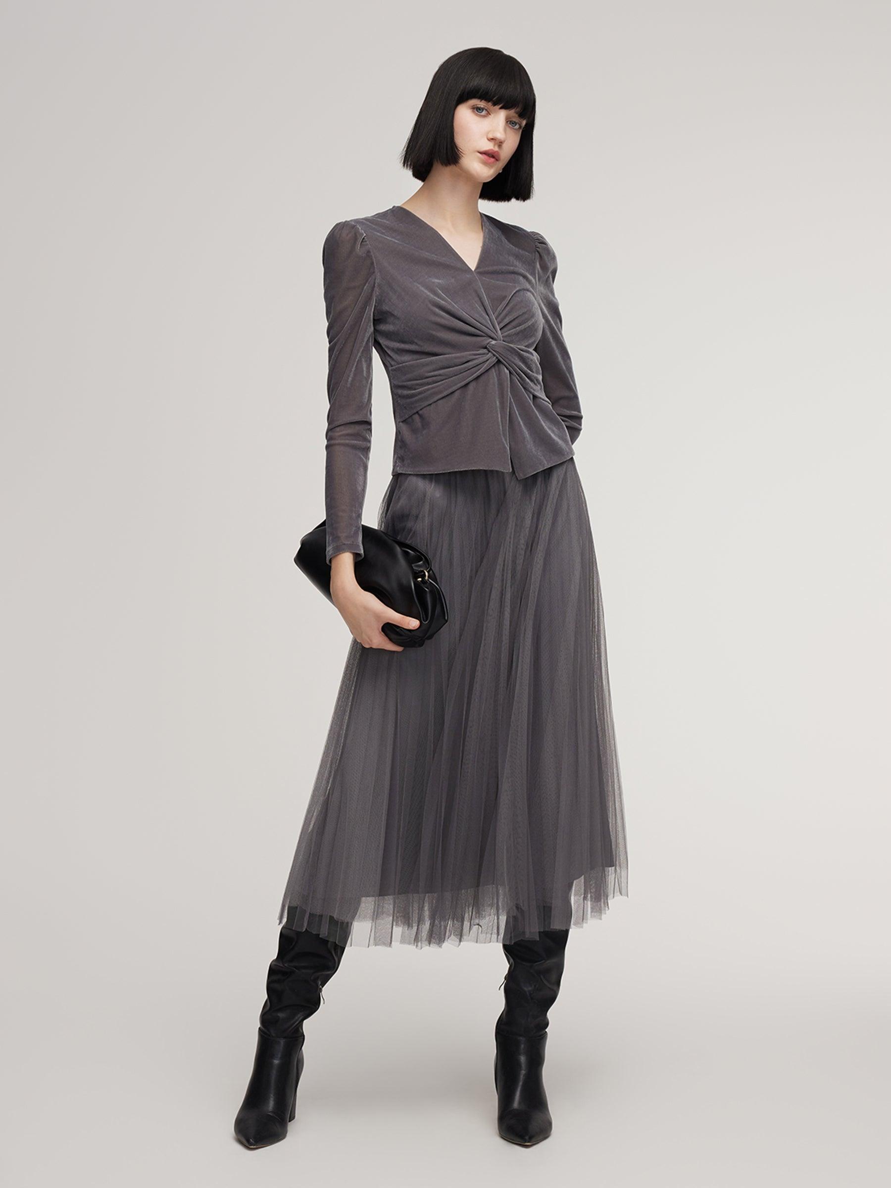 -Two-piece set -A-line skirt with elastic waistband -Soft and comfortable This two-piece set pairs a velvet twist-front top with a mesh skirt in a sophisticated grey palette. Soft, stretchy velvet offers a smooth, skin-friendly feel with subtle sheen and durability. The twist-front top cinches the waist, while the mesh