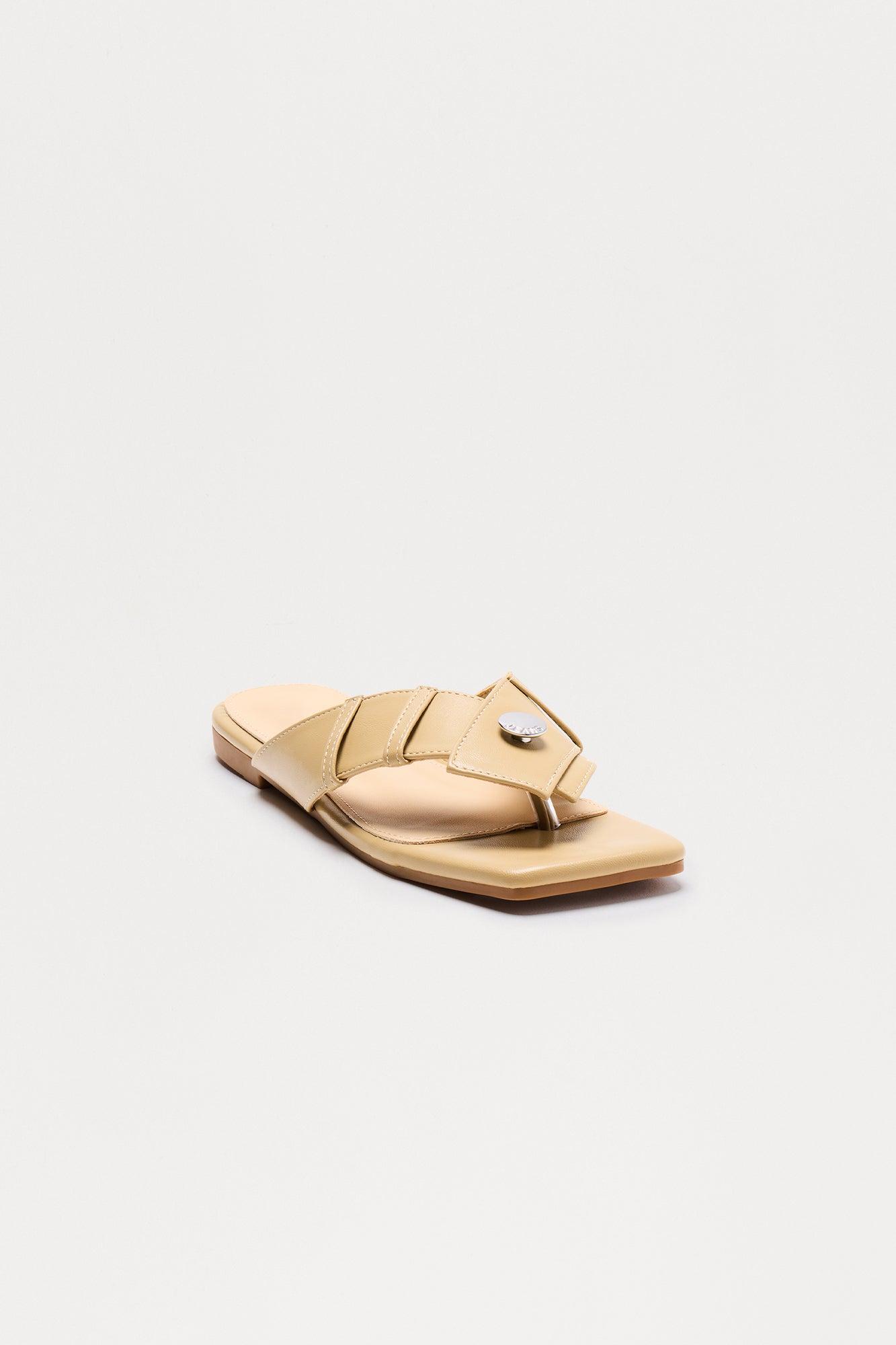 Available In Beige. Flat Sandals Flip Flops Hardware Button Detail Square Toe Flat Heel Imported
