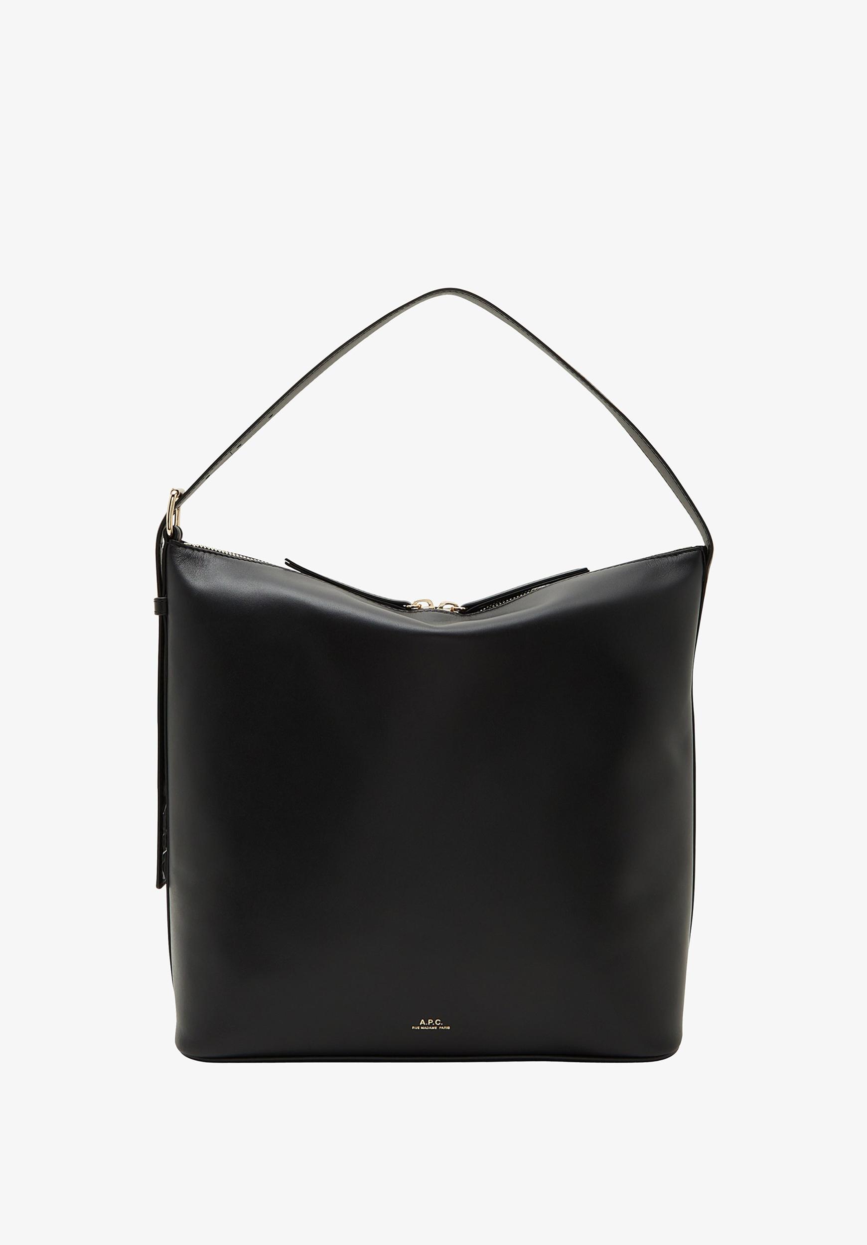 - One large shoulder strap adjusts with a goldtone metal buckle to carry the bag on the shoulder or by hand. - Large two-way zipper and leather zip pulls. - One inside pocket. - Cotton lining.