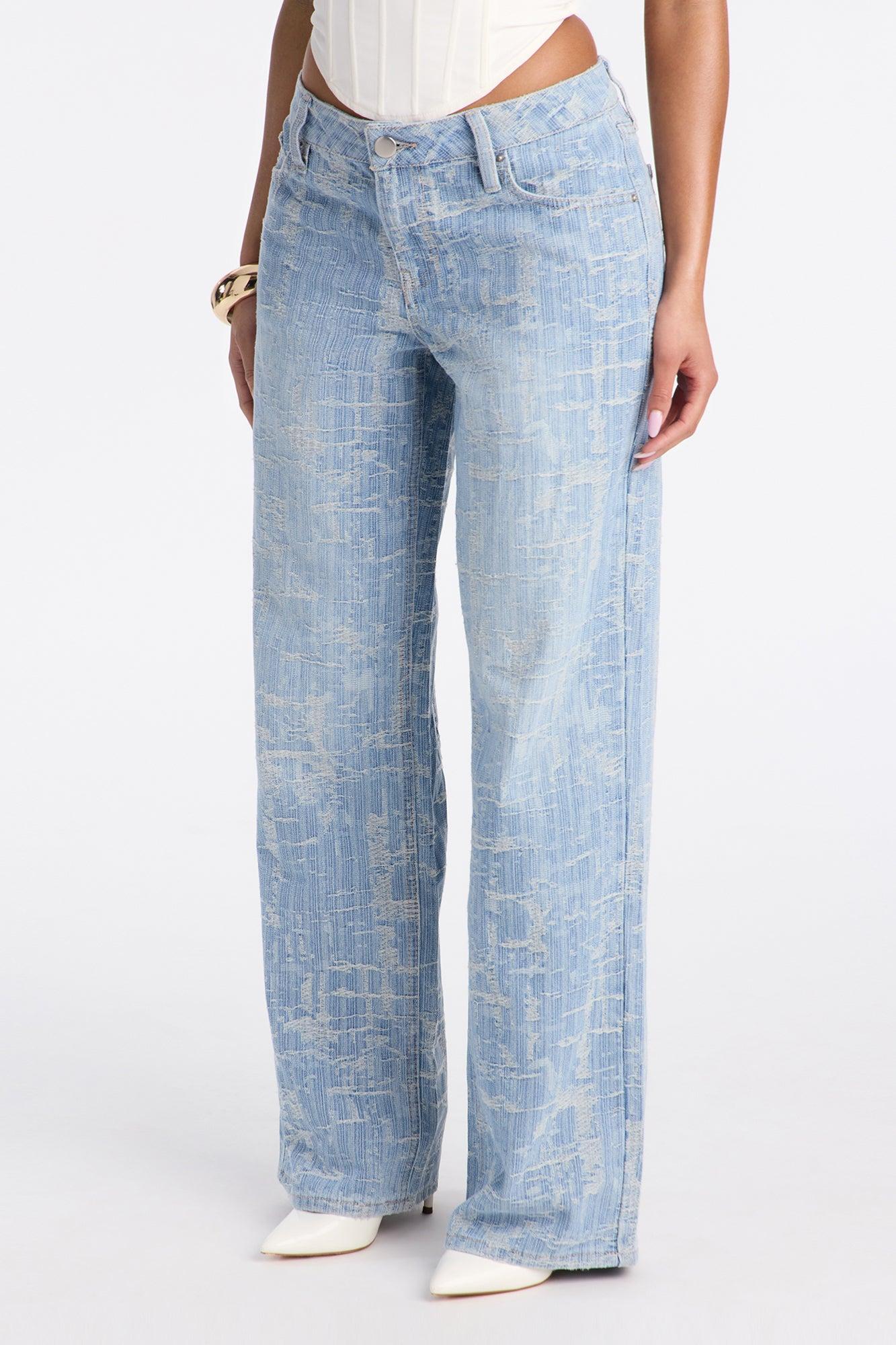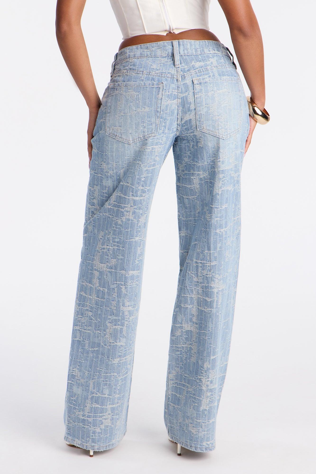 Available In Light Wash. Wide Leg Jean 5 Pocket Jacquard Pattern 9" Rise 32" Inseam Non-Stretch Self : 75% Cotton 25% Polyester Imported