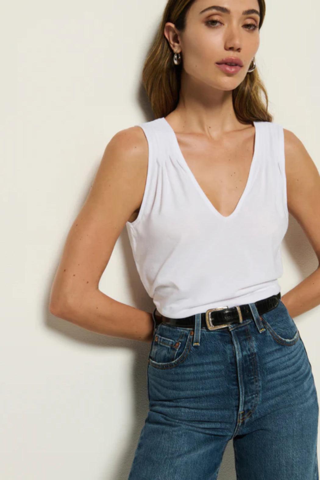 Your quintessential tank top, with a little more love. The Vikki Tank features a relaxed silhouette, v-neckline, and pintuck shoulder detailing for enhanced style. This one comes in White.