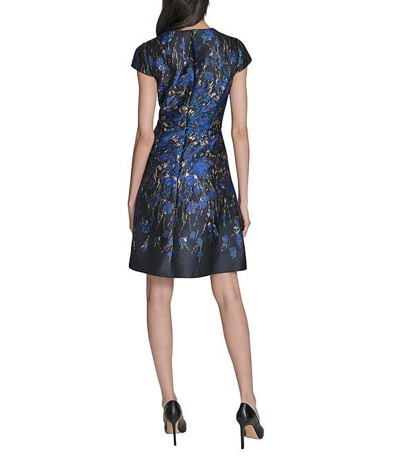 Vince Camuto Jacquard Metallic V-Neck Cap Sleeve A-Line Dress
