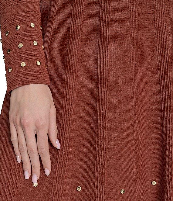 From Vince Camuto, this dress features: Knit fabrication Fit-and-flare silhouette Mock neckline Long sleeves Gold stud details Back zip closure Approx. 36" in length Vortex viscose/polyester Hand wash Imported.
