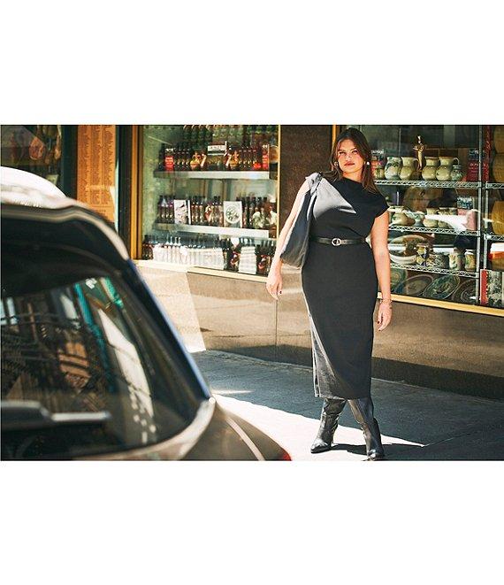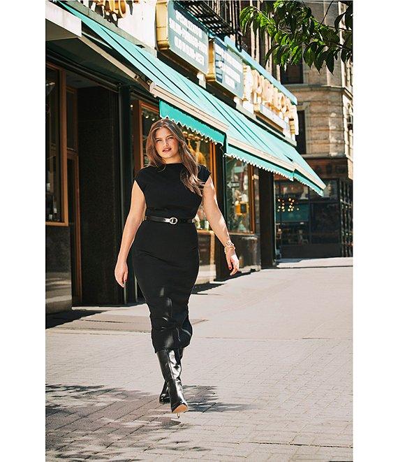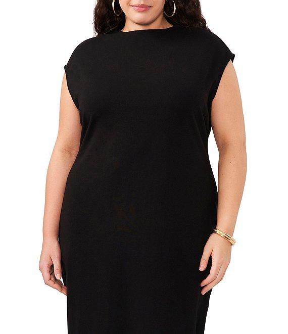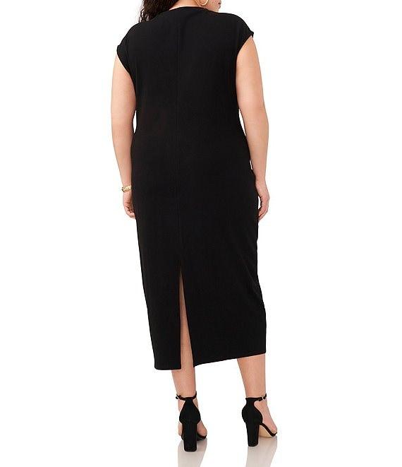 From Vince Camuto Plus, this dress features: Stretch cotton knit fabrication Boat neckline Cap sleeves with dropped shoulder Sheath silhouette Fitted Back slit detail Straight hemline Pullover construction Midi length Approx. 51" in length Cotton/spandex Machine wash/tumble dry Imported.