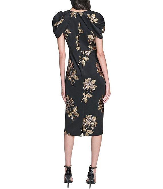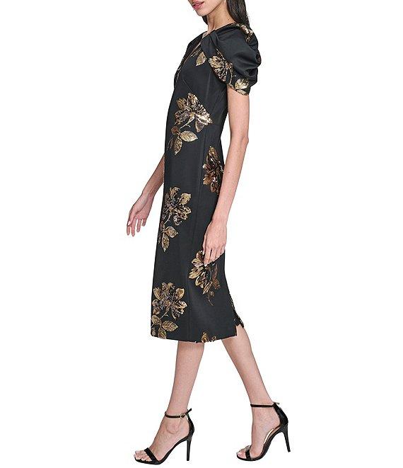 From Vince Camuto, this dress features: Woven fabrication V-neckline Short sleeves Sequin details Floral print Lined Midi length Center back zip closure Approx. 44" in length Polyester/spandex Hand wash Imported.