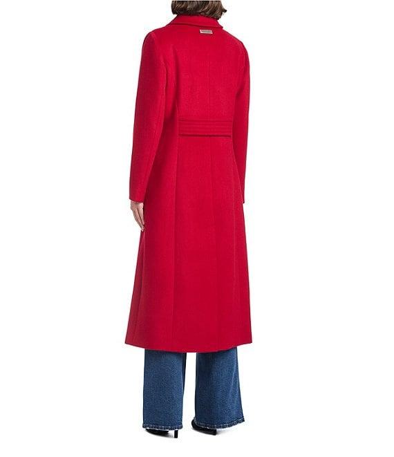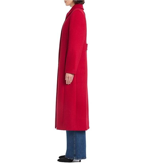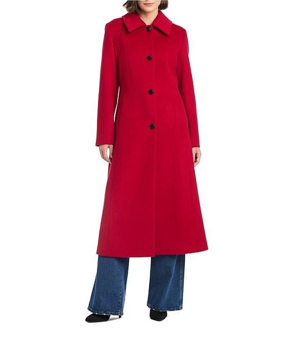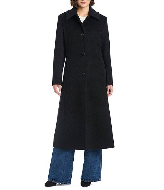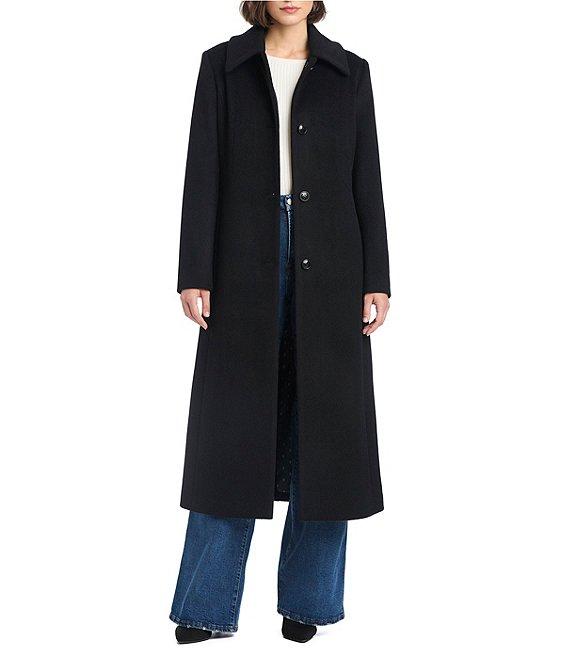 From Vince Camuto, this coat features: Wool fabrication Single breasted silhouette Banana stand collar neckline Long sleeves Side seam pockets with stitch detailing Back belt with multi stitching Printed twill lining Heavyweight Straight fit Fully lined Straight hemline Button front closure Approx. 49.5" length Wool; lining: polyester twill Dry clean Imported.