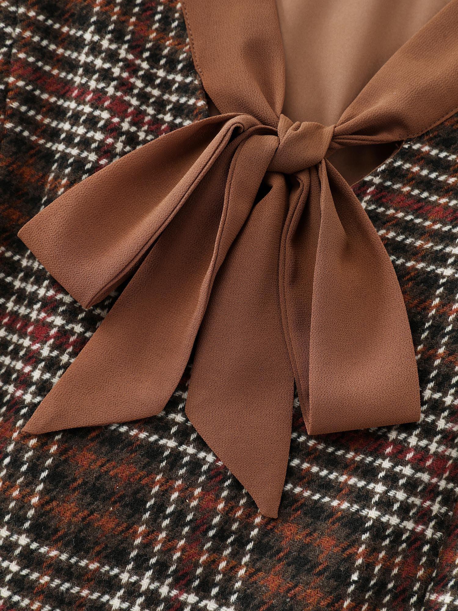 Shop Vintage Check Tweed Ribbon Collar Midi Dress now and redefine your style with confidence at BloomChic. Tailored for mid and plus-size women. This trendy Dress, sizes 10-30. You can never go wrong with BloomChic Dresses. Color:DarkBrown;Style:Timeless;Neckline:Ribbon-tied collar;Sleeve Type:Elastic cuff;Prints:Plaid;Details:Patchwork, Pleated;Pocket:Side seam pocket;Belt:No-belt;Closure Type:Non