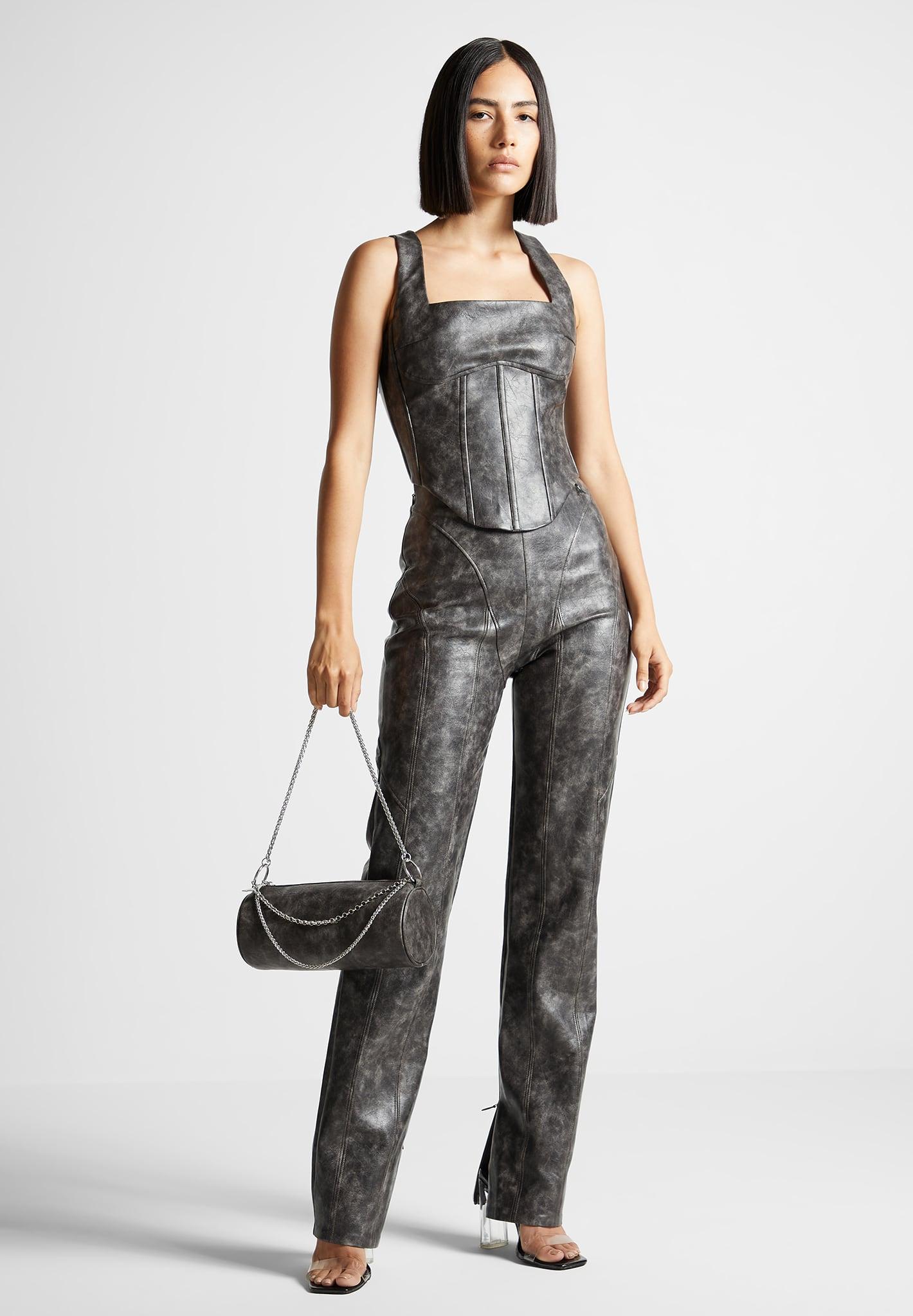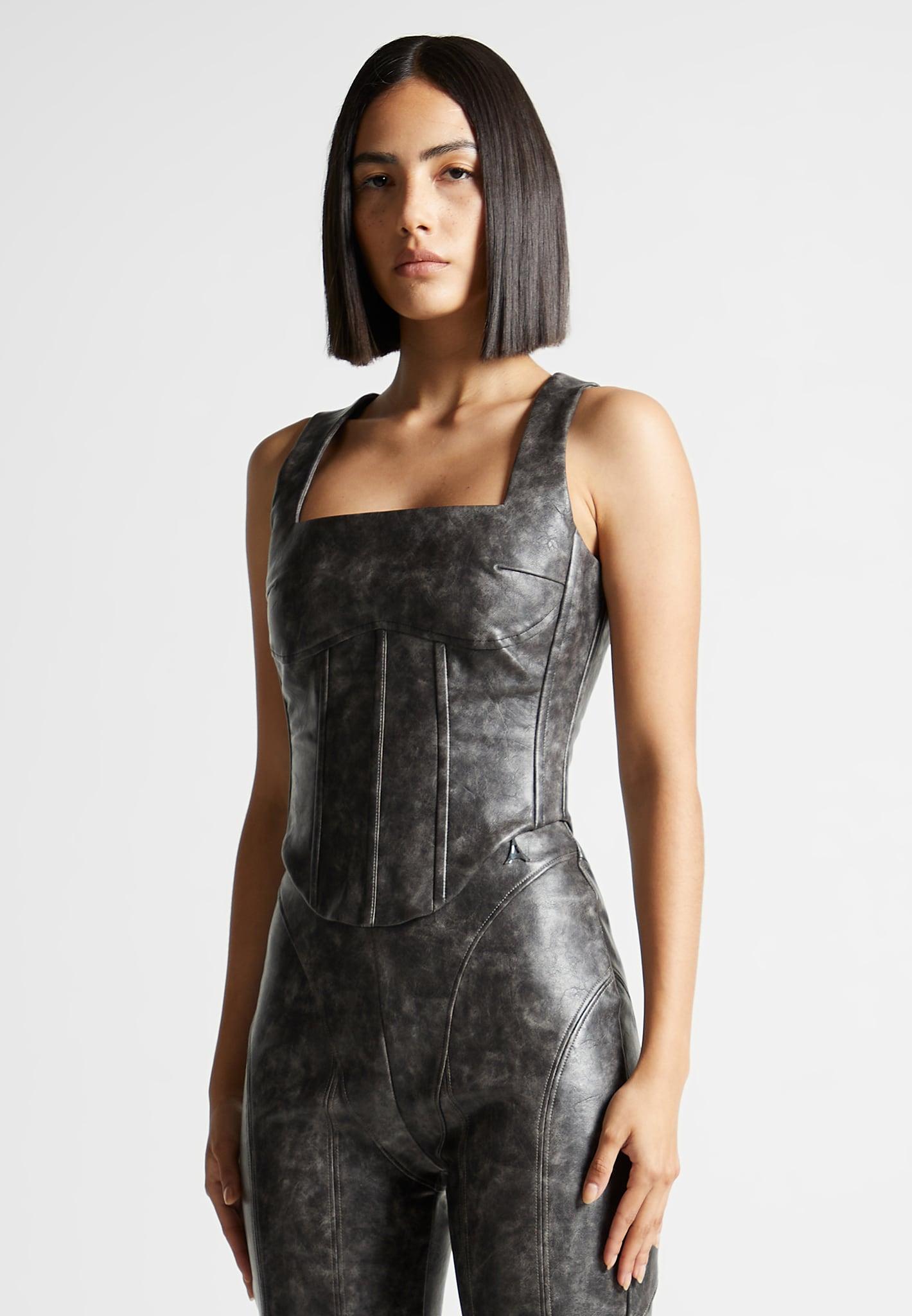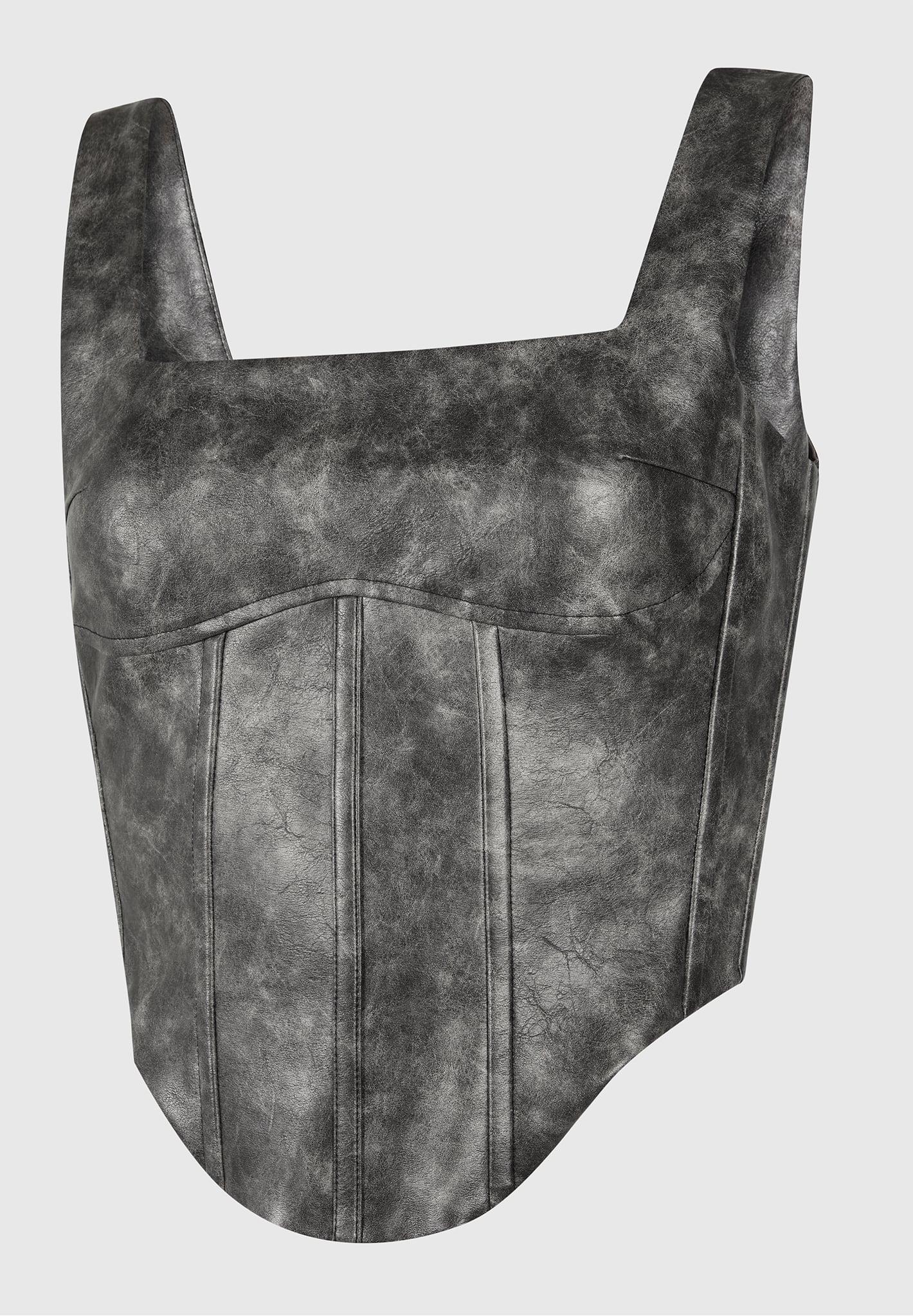 Achieve a chic, vintage-inspired look with this stunning Vegan Leather Corset Top. Featuring a flattering fit and structured design, this top will make you stand out from the crowd. Perfect for making an impression! Corset Top Silhouette Internal Boning Dipped hem Back Zip Closure Flattering Fit Silver Manière De Voir Eiffel Zip 100% PU / 95% Polyester, 5% ElastaneAlways check the care label for wash instructions.