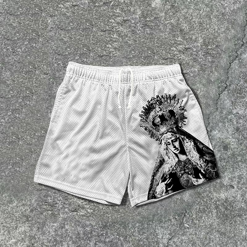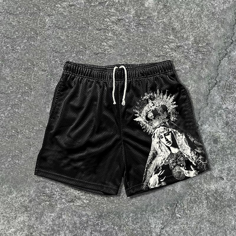 Vintage The Scriptures Of The Blessed Virgin Mary Graphics Mesh Drawstring Shorts