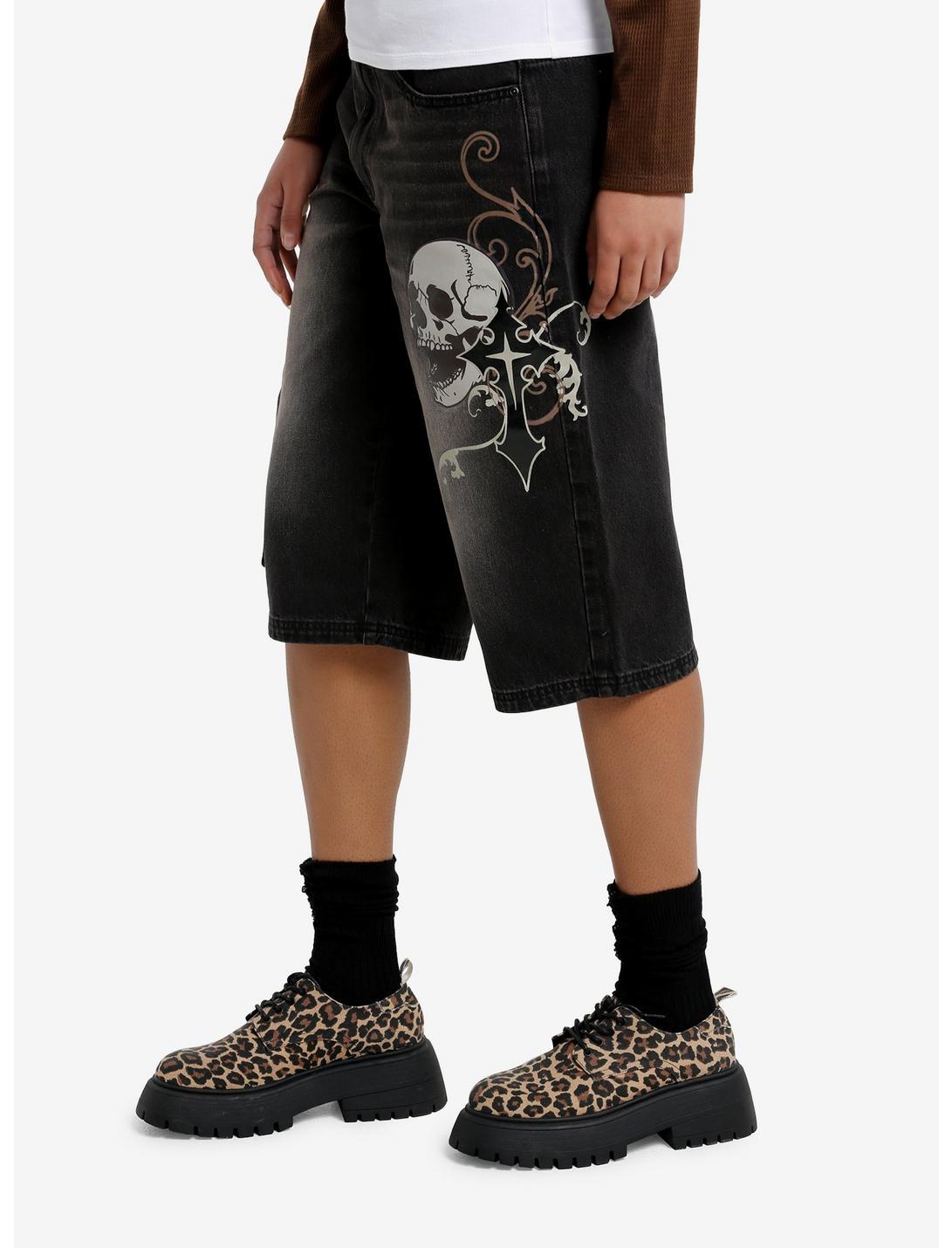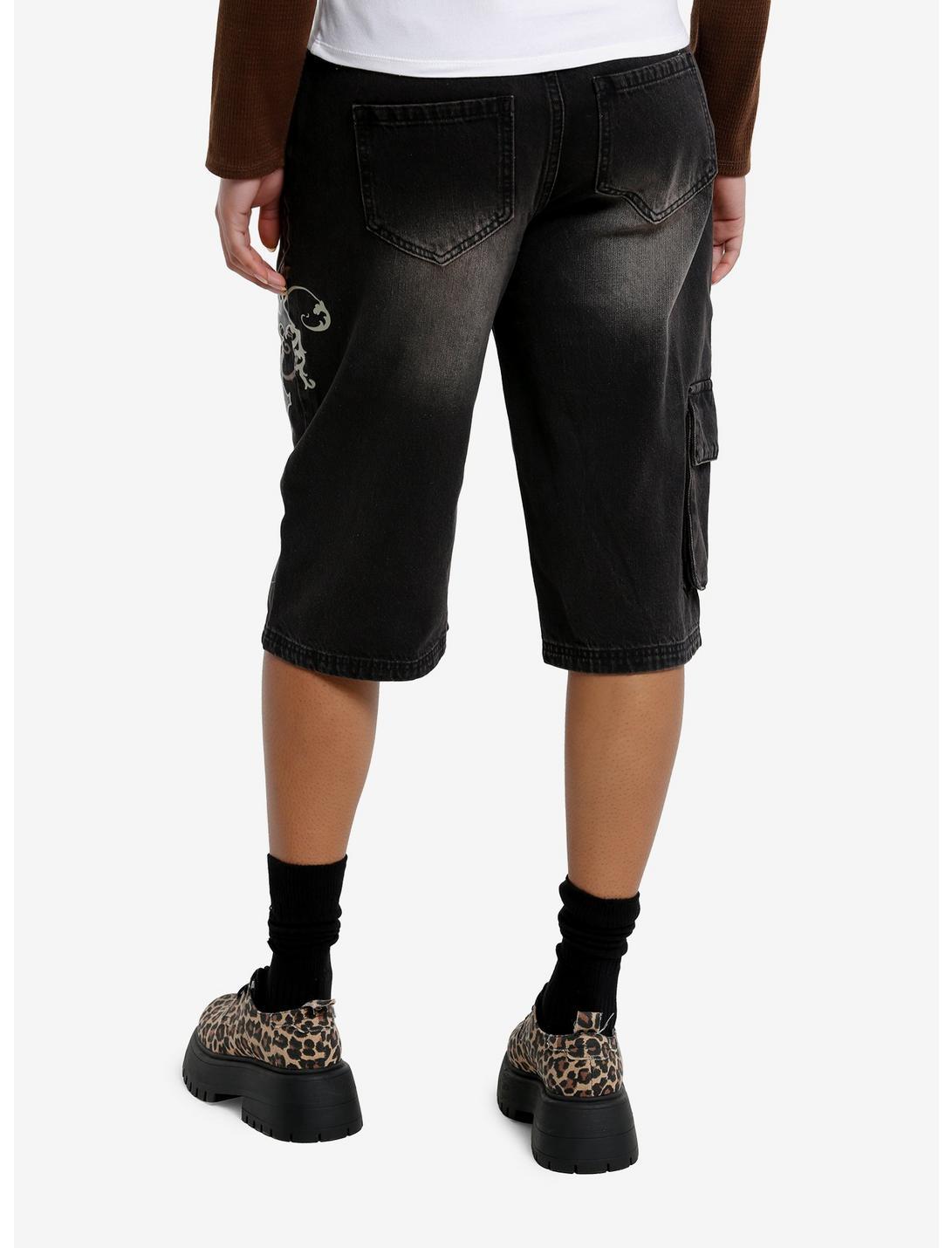 These vintage washed long shorts have a grunge vibe as well as a cargo pocket on one thigh and a large printed of screaming skull, filigree and gothic cross. They're low-rise for an added Y2K flair. No stretch.100% cottonWash cold; dry lowRise: 13"Inseam: 15"ImportedListed in junior sizesModel is 5'9"Model wears size 3