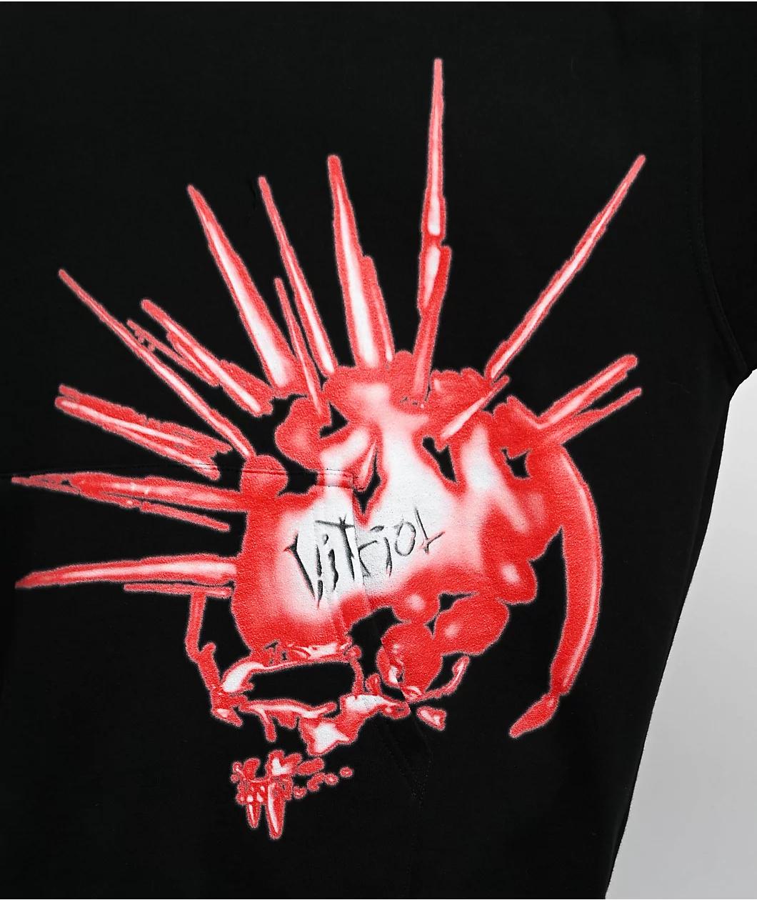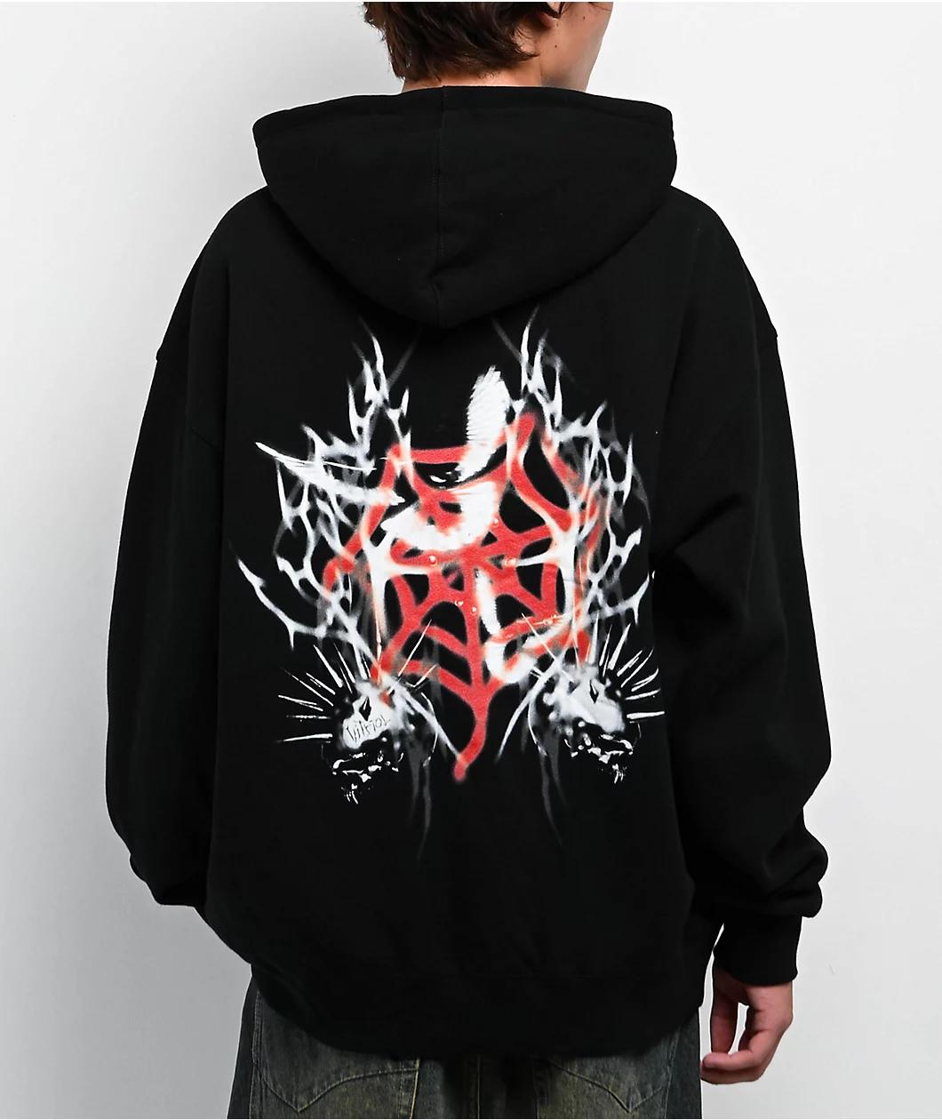 Showcase your edgy style with the Dub hoodie from Vitriol in a black colorway. An airbrushed-inspired graphic of an inverted skull with liberty spikes lays near the large kangaroo pouch pocket. The back of the sweatshirt boasts a red spider web with