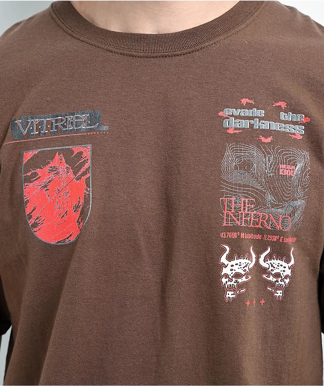 Evade The Darkness with an edgy t-shirt from Vitriol in a solid brown colorway. Showcasing grim screen printed artwork on the front and back of the tee. The front design boasts Vitriol branding complemented by "evade the darkness" with two demon grap