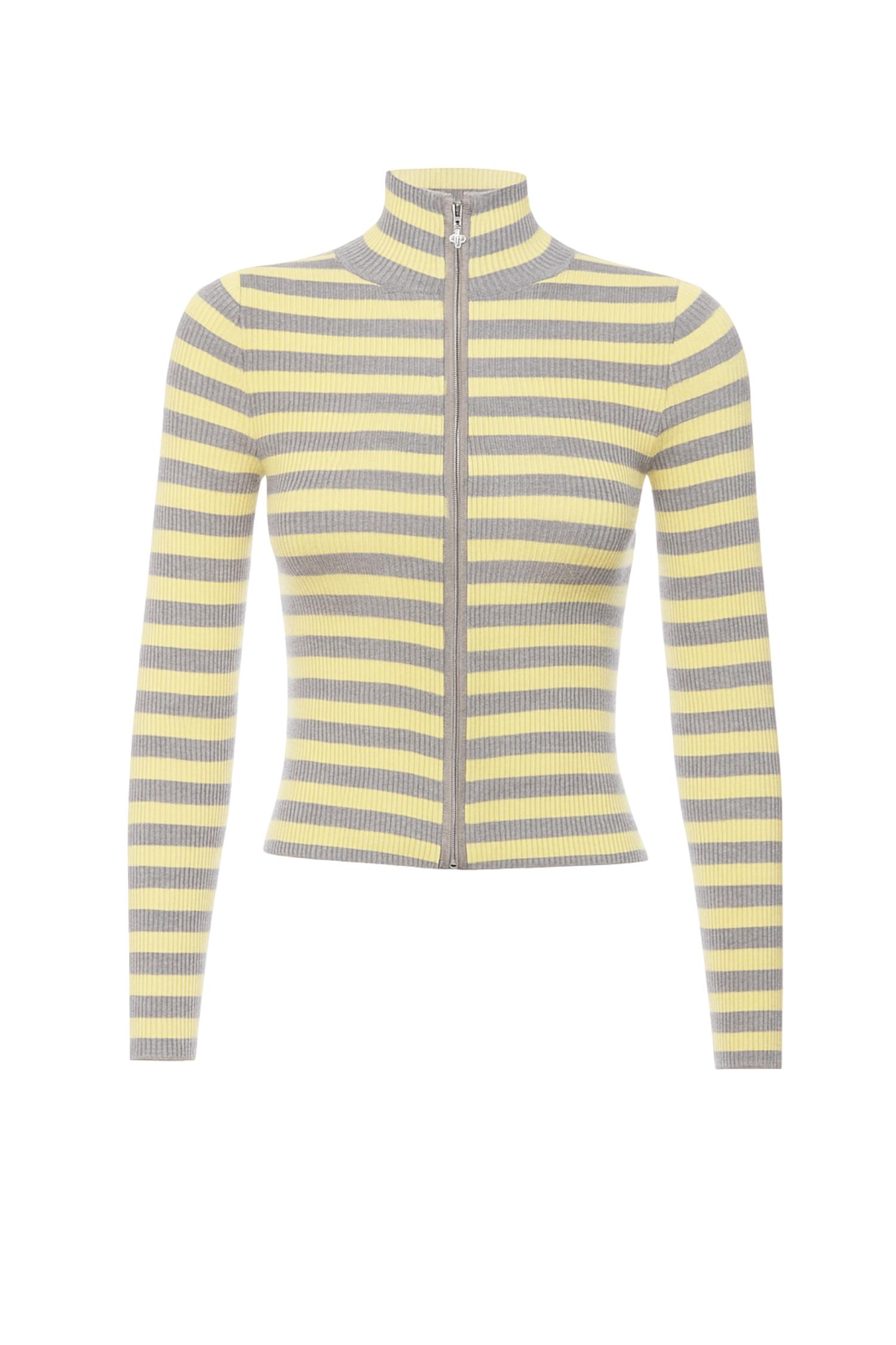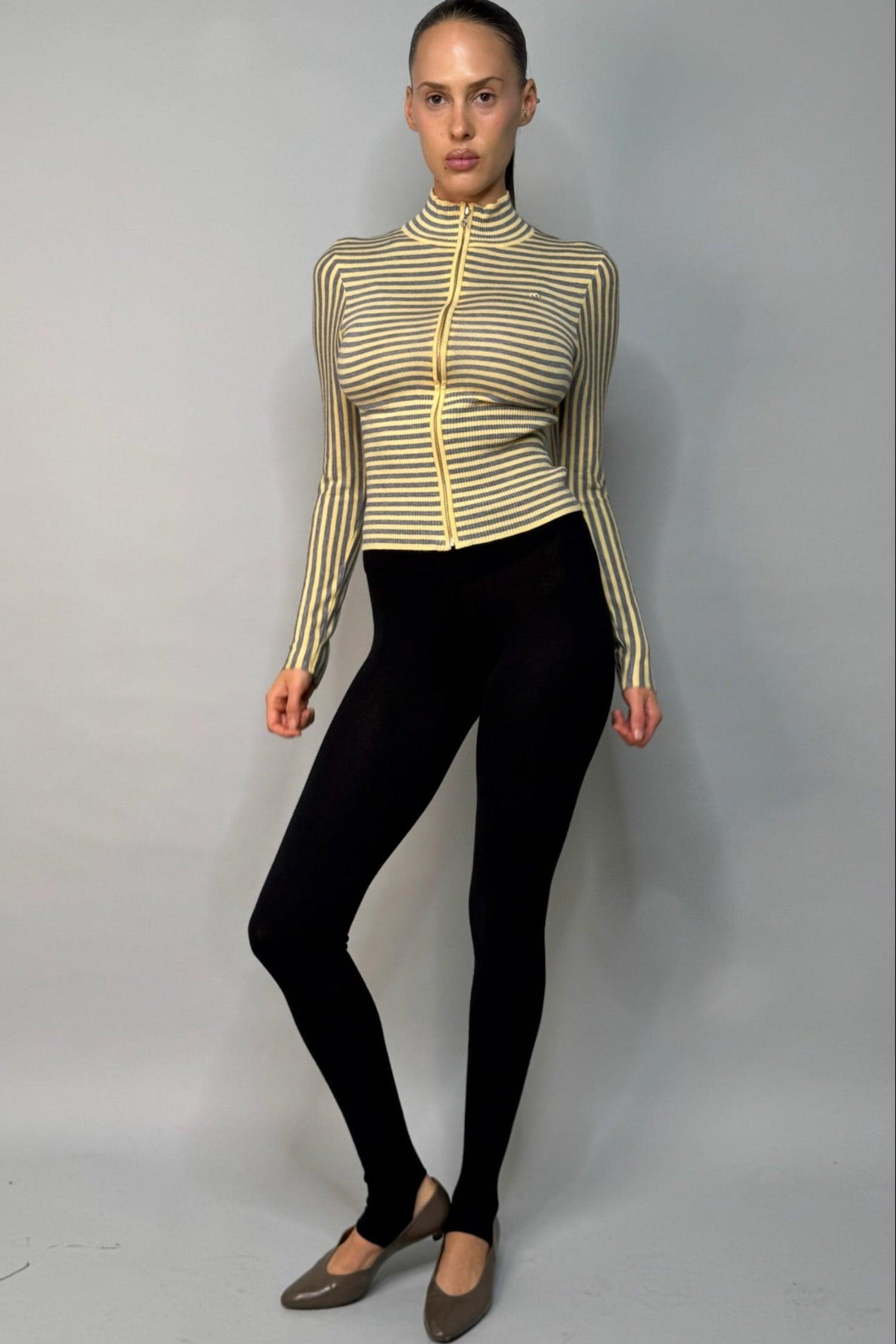 Preorder - ships in July. The Vlad Zip Up in Butter Stripe is a comfy, sensual knit for all seasons. New Miaou logo zipper pull. She's thick enough to wear as a top, but light enough to layer over a Mini Tee. Pair with our matching soft knit Colette Bodysuit.
