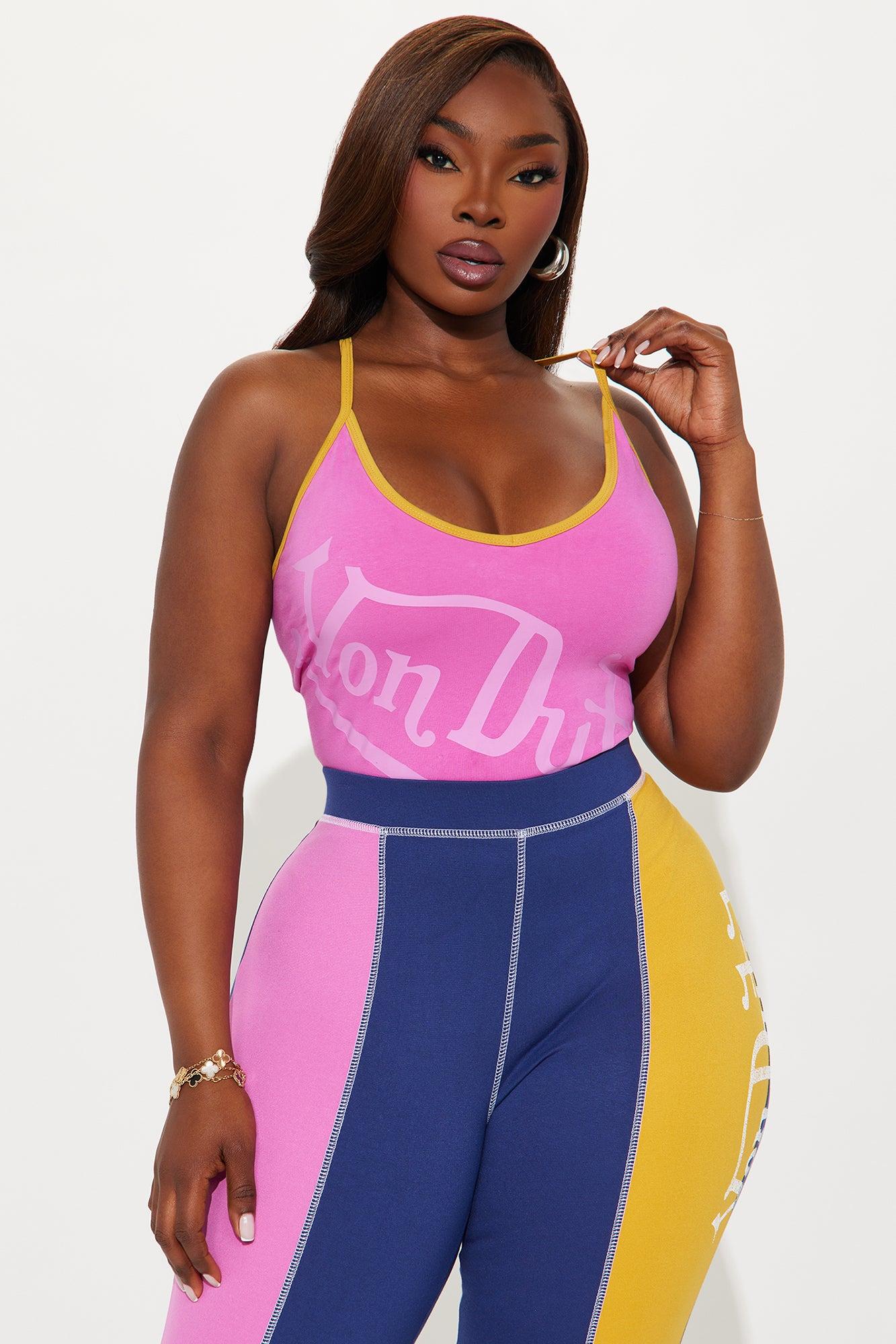 Available In Pink/combo. Bodysuit Sleeveless Von Dutch Graphic Logo Stretch Pair To "Von Dutch Rhinestone Contrast Flared Legging" Disclaimer: Due To Screen Print, A Difference In Saturation May Occur. Each Garment Is Unique. Final Sale 95% Cotton 5% Spandex Imported