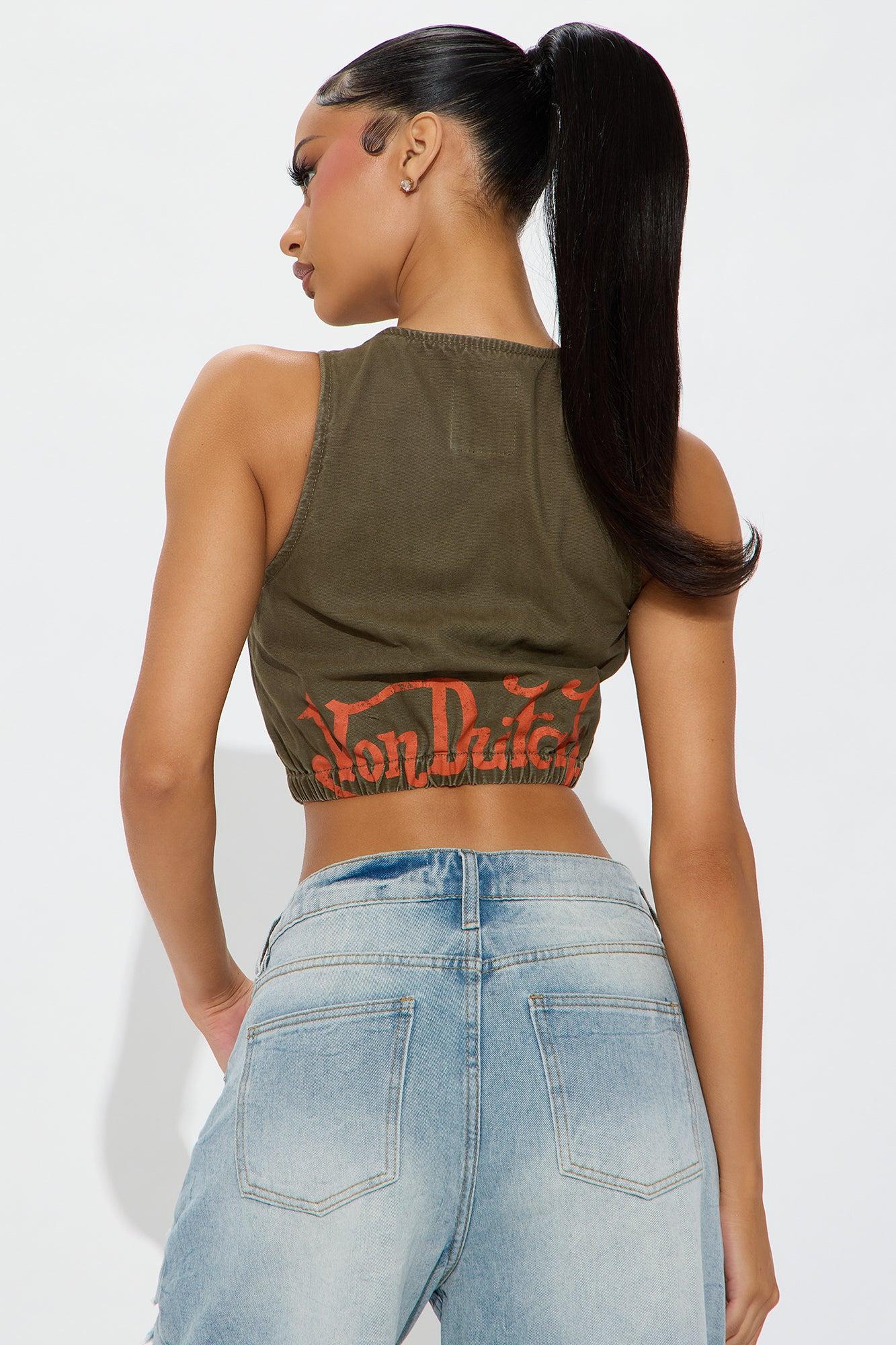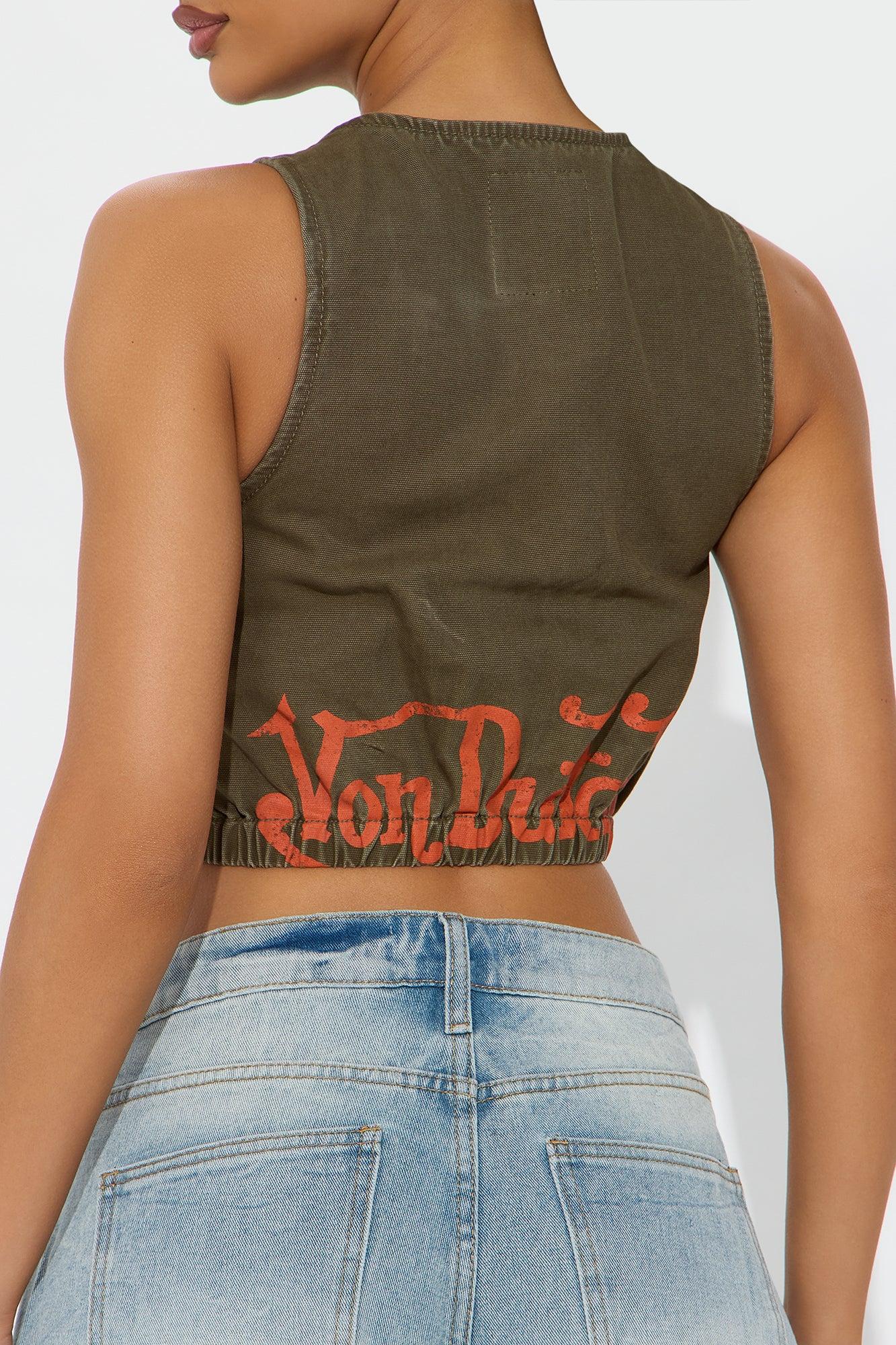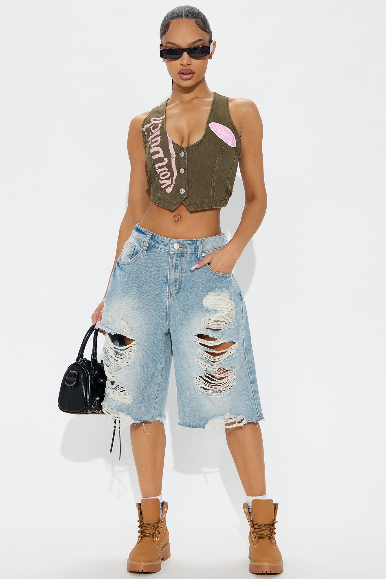 Available In Olive. Denim Vest Button Closure Screen Print Patch Detail Non Stretch Disclaimer: Due To The Specialized Wash Process, Each Garment Is Unique. 100% Cotton Imported California Proposition 65WARNING: Cancer and Reproductive Harm - www.P65Warnings.ca.gov.