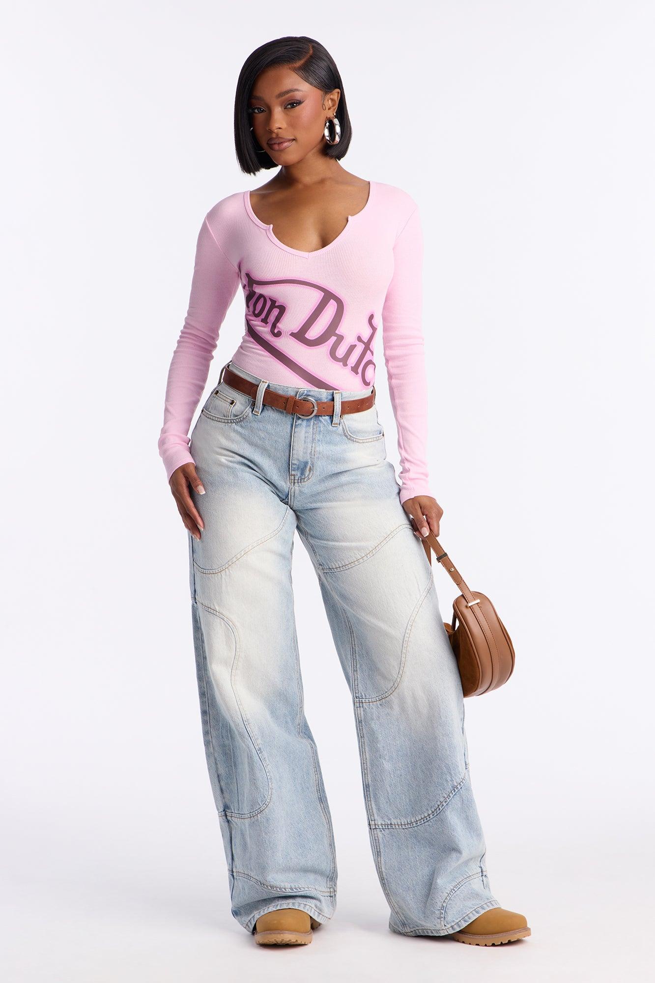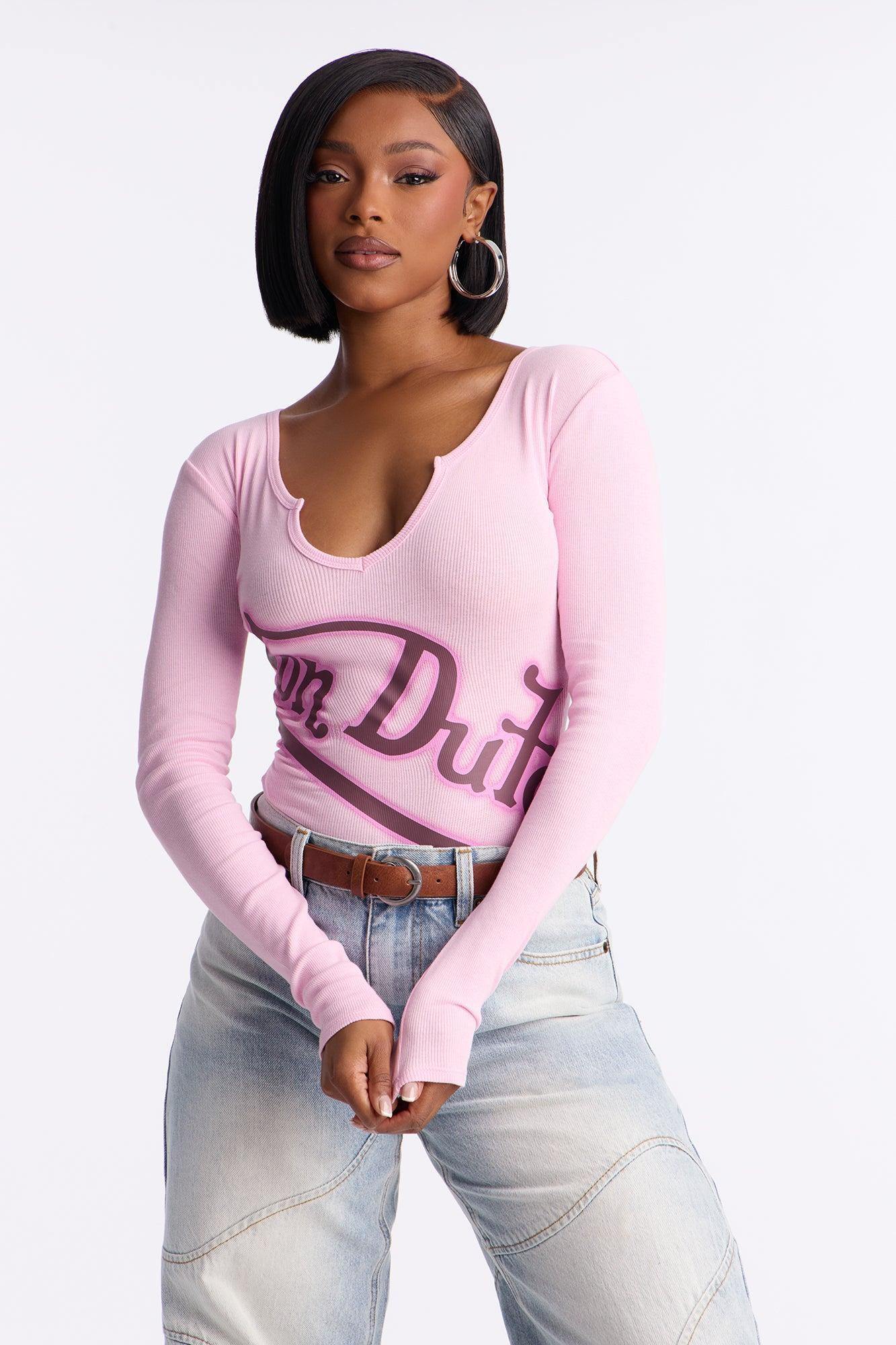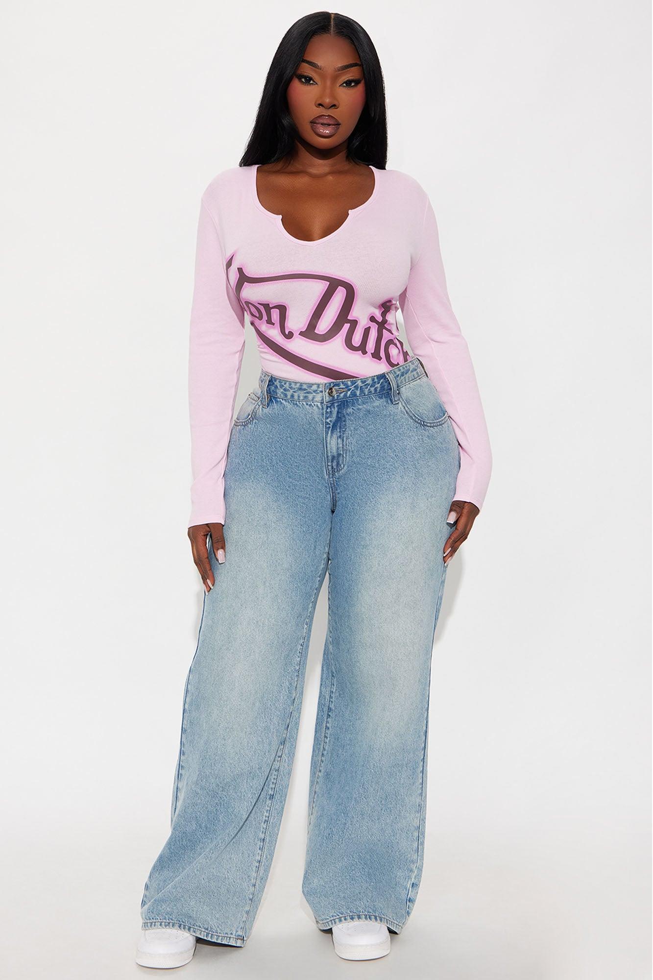 Available In Pink And Purple. Bodysuit Long Sleeve Notch Neck Snap Button Closure Von Dutch Graphic Final Sale Disclaimer: Due To The Printing Process A Difference In Saturation May Occur. Each Garment Is Unique. Self: 95% Cotton 5% Spandex Imported