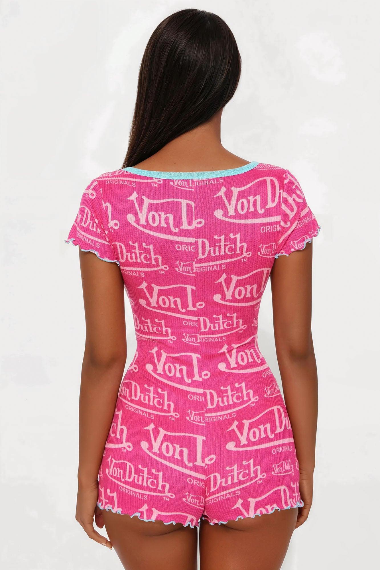 Available In Hot Pink/combo. PJ Romper Onesie Short Sleeve Von Dutch Graphic Logo Button Details Lettuce Trim Stretch Final Sale Disclaimer: Due To The Printing Process A Difference In Saturation May Occur. Each Garment Is Unique. Print Placement Will Vary. 95% Polyester 5% Spandex Imported