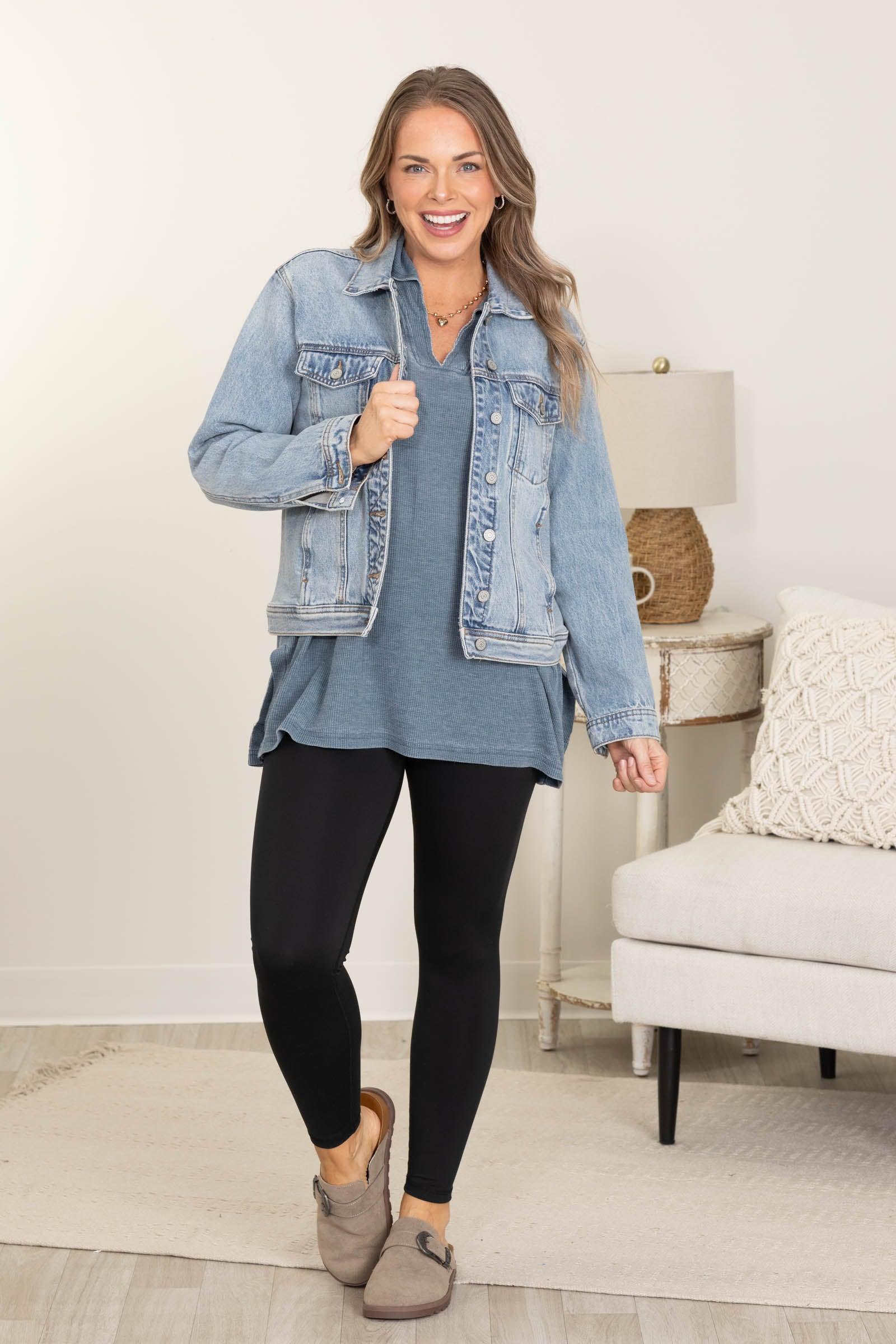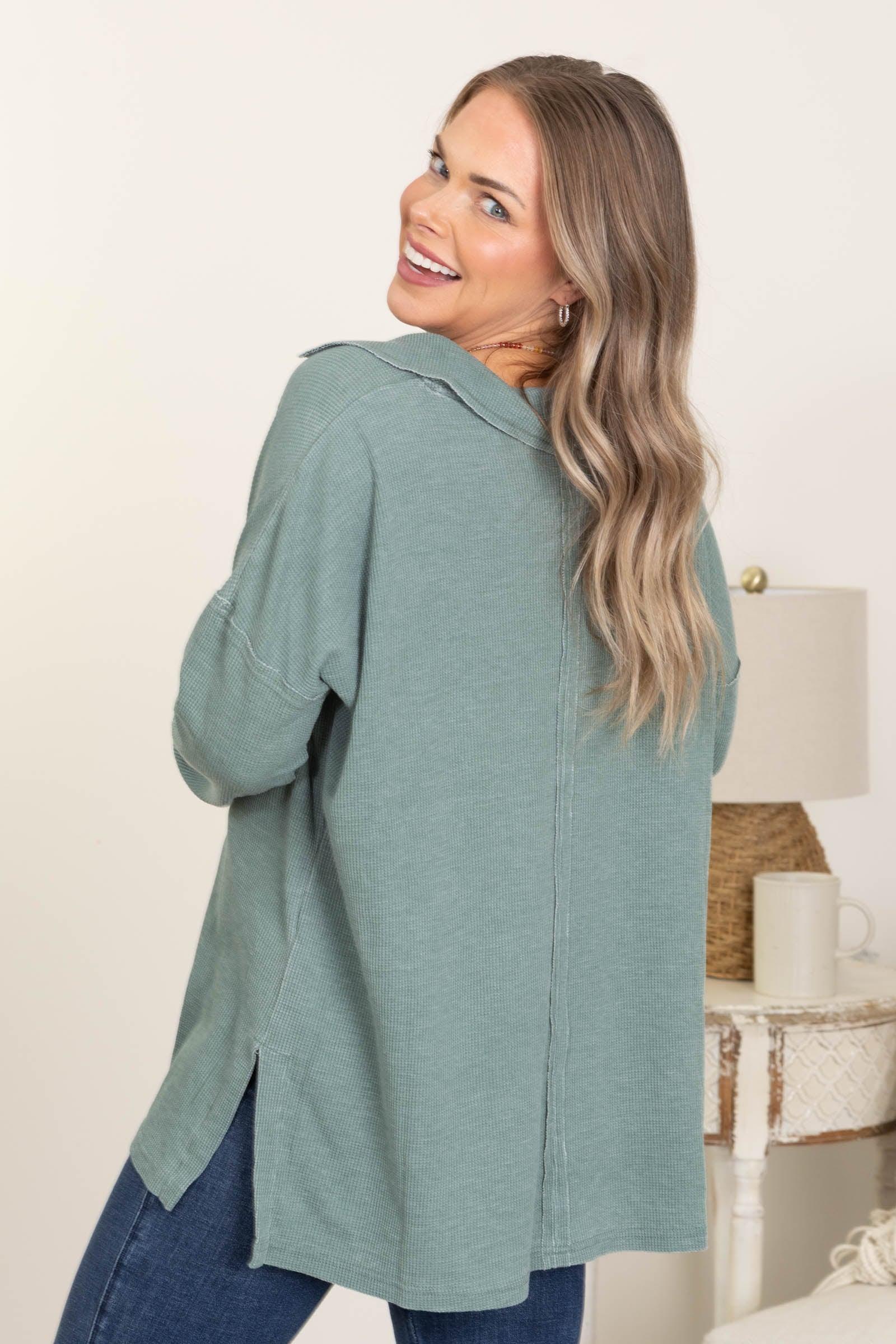 Product Details Colors: Orchid/ Navy/ Mauve/ Light Hunter Print: Washed Waffle Neckline: Notch Neck Sleeve: Long Sleeve Hemline: Straight Brand: Mono B Material and Care 60% Cotton 40% Polyester Machine Wash Cold Tumble Dry Low Size and Fit Small: Bust 56" Waist 52" Length 27" Medium: Bust 58" Waist 54" Length 27.5" Large: Bust 60" Waist 56" Length 28" Erica is 5’7” and wearing her true size small