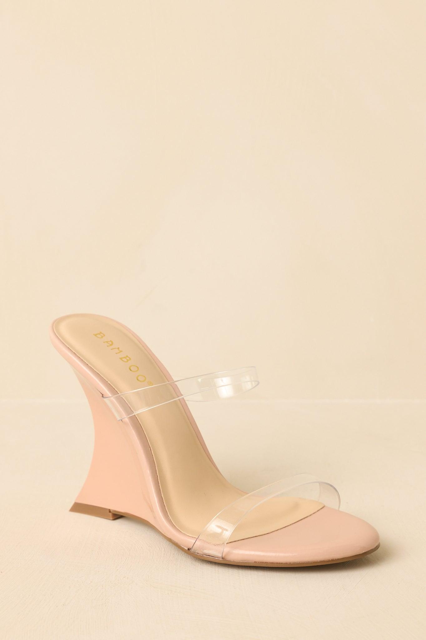 Statement-making in the most effortless way. The Walk of Fame Beige Clear Wedge Heels bring just the right amount of drama with a sculptural silhouette that still feels clean and wearable. Designed to elevate your look without overpowering it, this pair is made for moments when you want to stand tall and feel confident from every angle. These beige wedge heels feature an open-toe slide design with clear straps across the foot and a smooth, monochromatic wedge heel for modern structure. The contoured wedge provides stable height while maintaining a sleek profile. Finished with a slip-on construction and cushioned footbed for comfortable wear. Heel measures 4.25" Man made materials Non-skid sole Manufactured in China Designed in The USA True to Size, Not Wide Foot Friendly