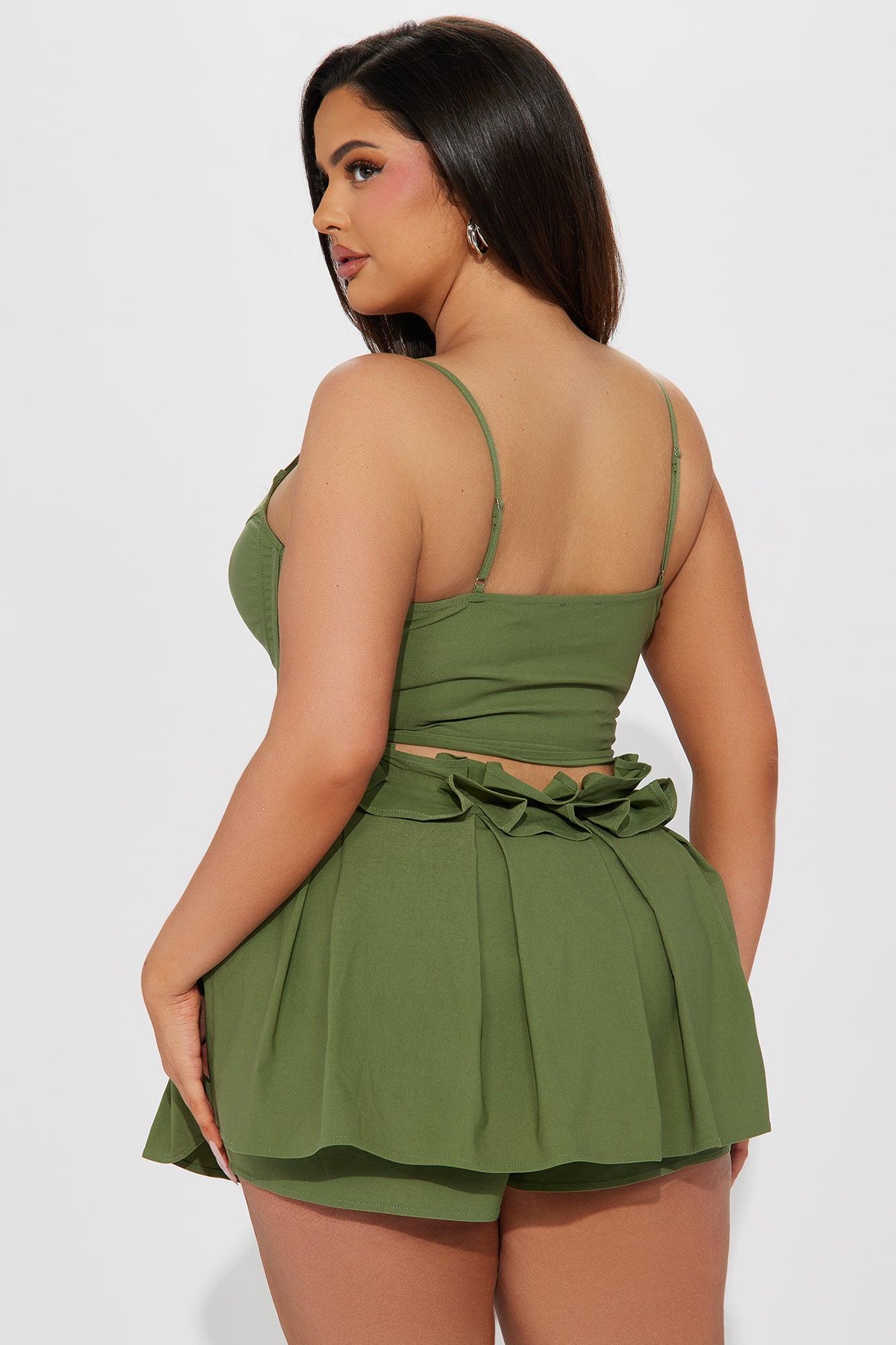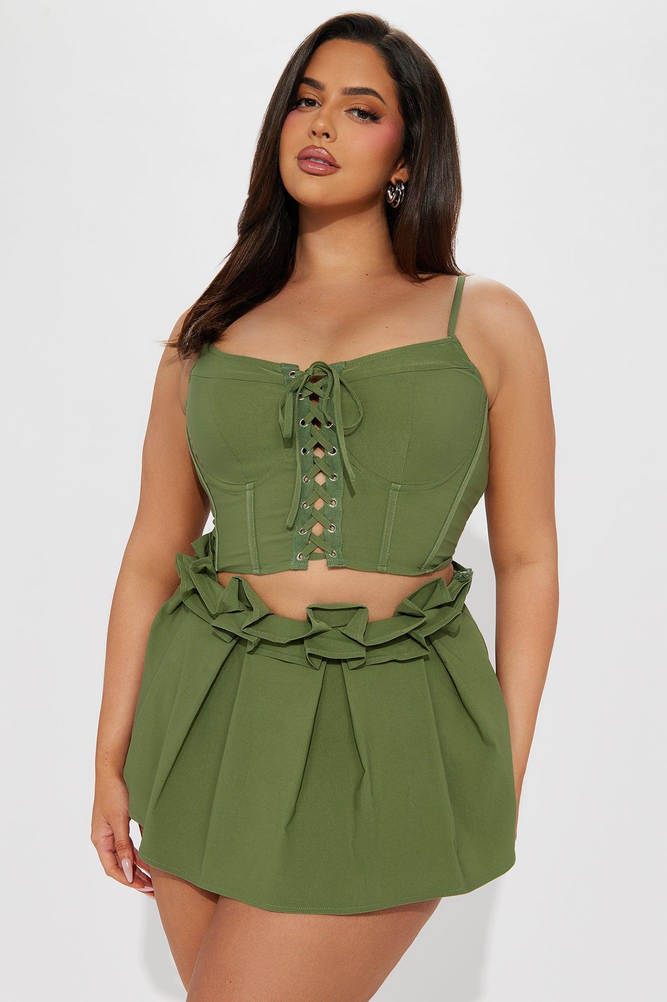 Available In Olive. Corset Top Adjustable Spaghetti Straps Sexy Front Lace Up Boning And Underwire Pleated Skort Invisible Zipper Stretch 14" Length 50% Rayon 45% Nylon 5% Spandex Imported California Proposition 65WARNING: Cancer and Reproductive Harm - www.P65Warnings.ca.gov.