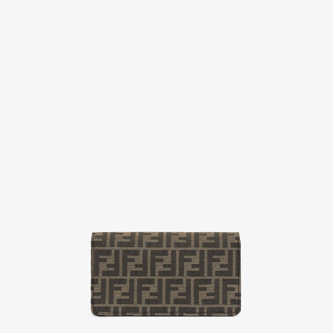 Compact Baguette wallet with flap and FF clasp. Interior compartment with six card slots. Double shoulder strap, an adjustable leather option and a detachable thin chain option: to carry the bag like a clutch, under the arm or wear it cross-body. Made of brown FF jacquard fabric. Gold-finish metalware. Made in Italy