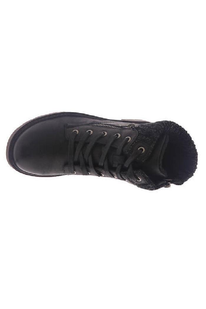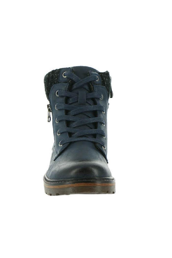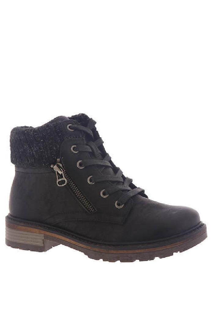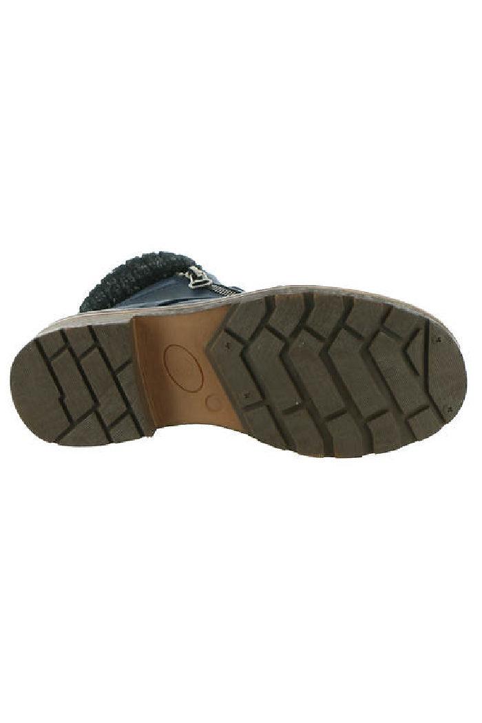 Distressed synthetic upper Ankle-high shaft with sweater detail on collar Burnished details on toe and heel Side zipper closure for easy on/off with additional decorative zipper Fleece lining Removable cushioned footbed 3/8" heel