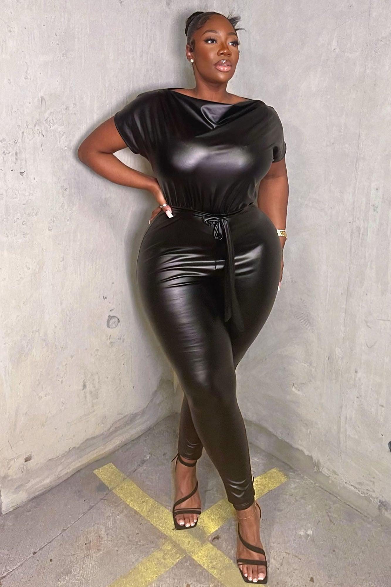 Available In Black. PU Leather Jumpsuit Off Shoulder Tie Waist Skinny Leg Stretch 29 Inseam Self 95% Polyester 5% Spandex Coating 100% Polyurethane Imported California Proposition 65WARNING: Cancer and Reproductive Harm - www.P65Warnings.ca.gov.