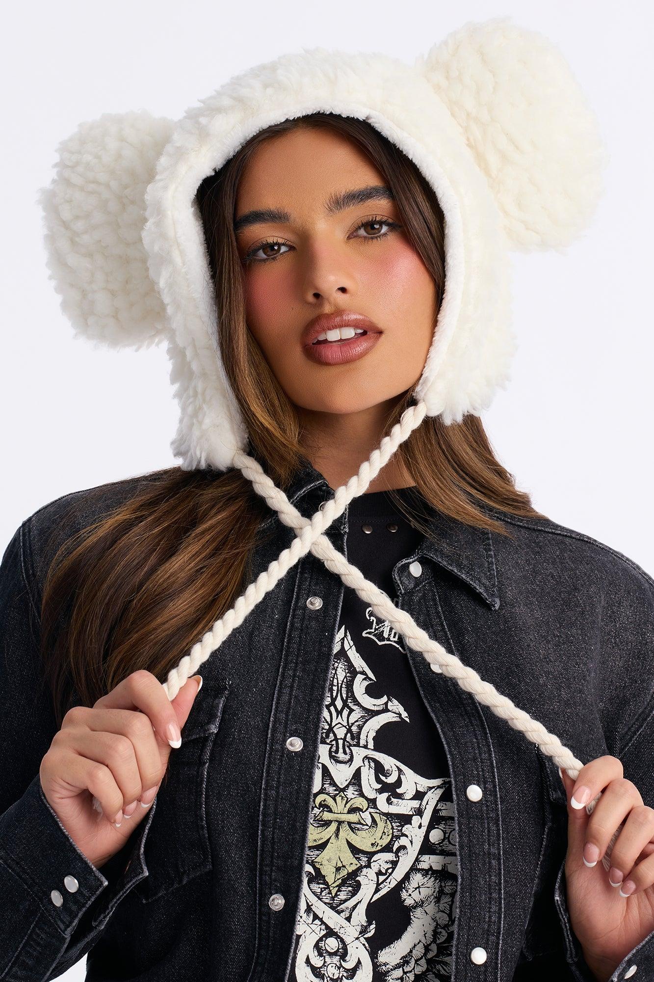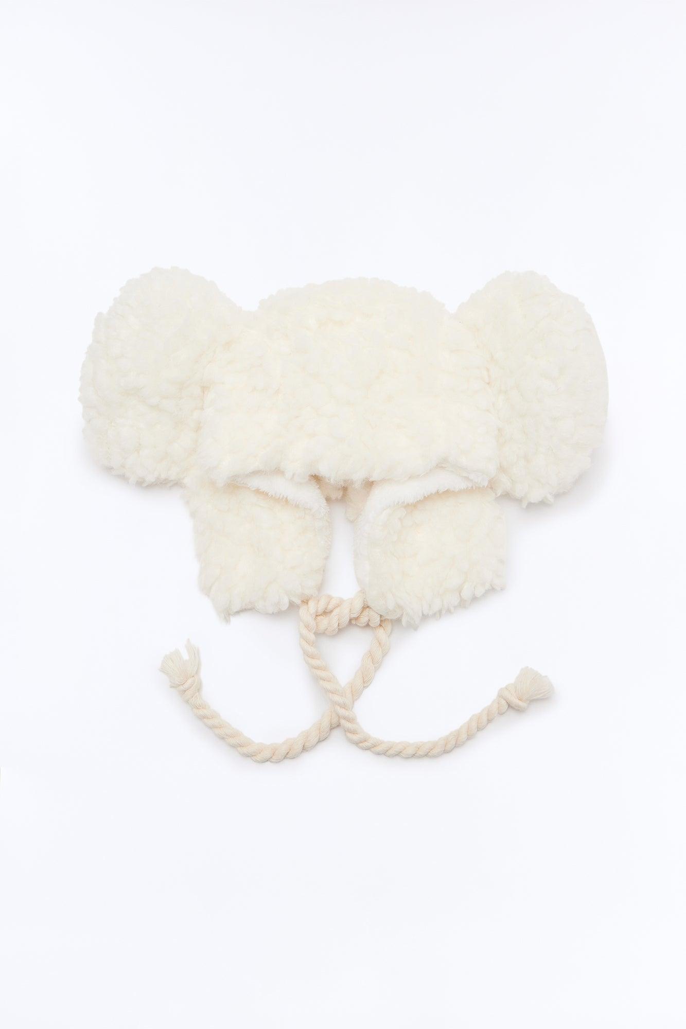 Available In Ivory. Beanie Bear Shape Design Tie Closure Sherpa Material Imported California Proposition 65WARNING: Cancer and Reproductive Harm - www.P65Warnings.ca.gov.
