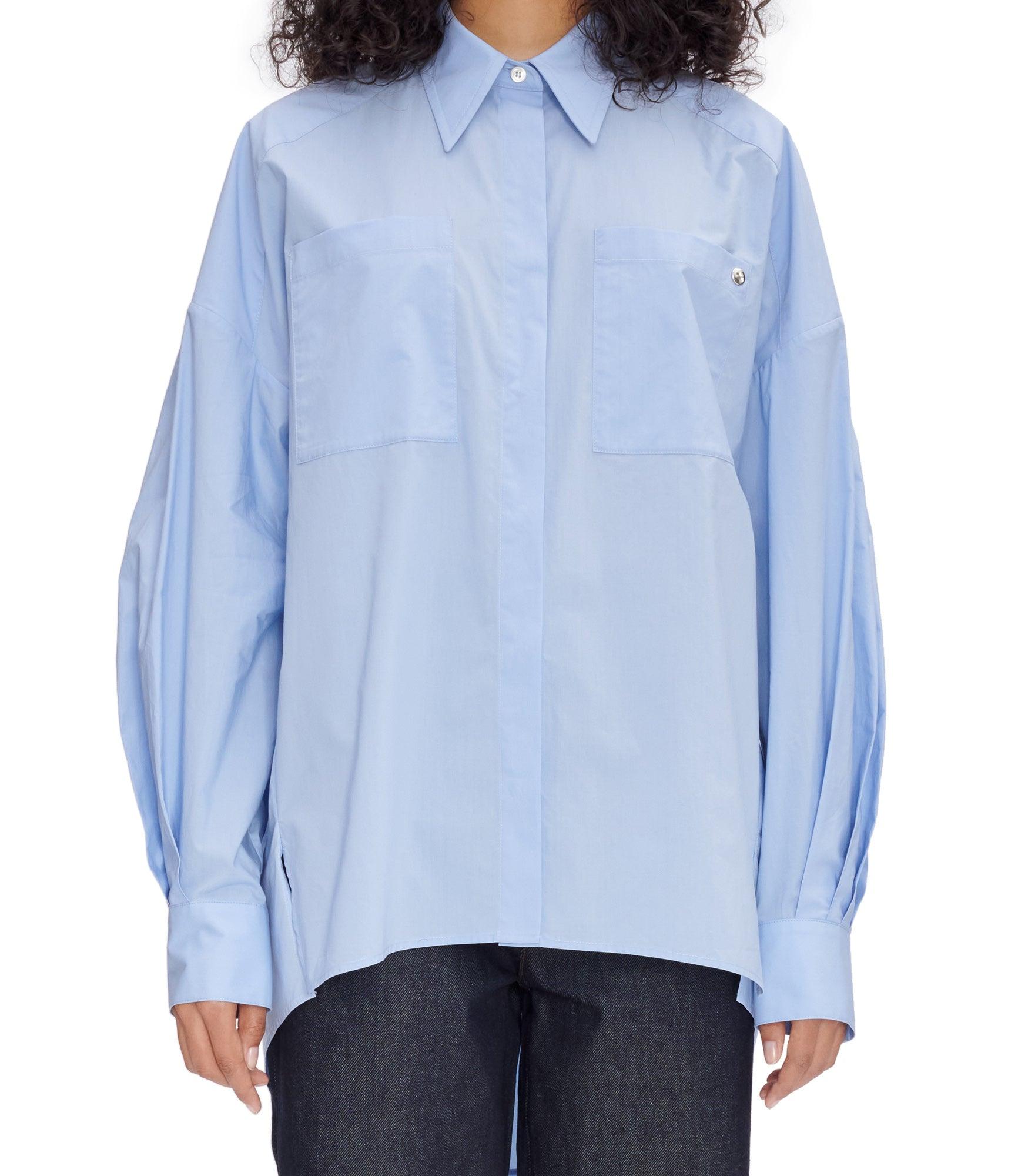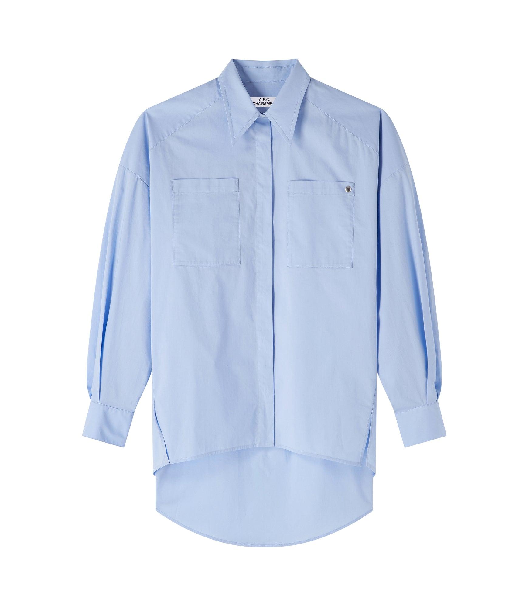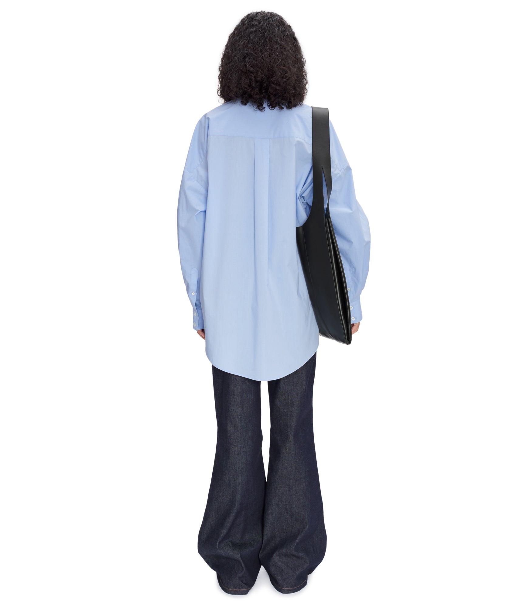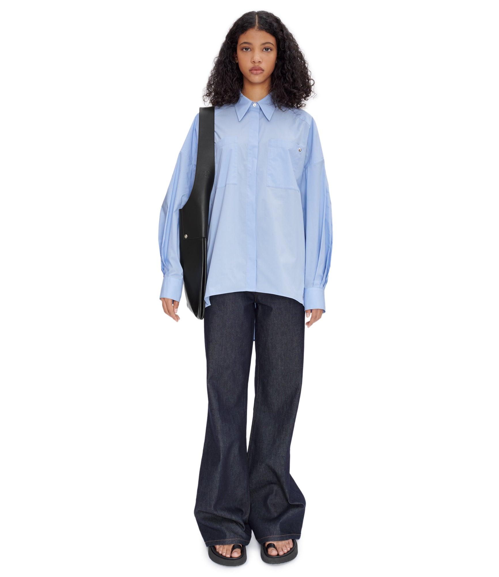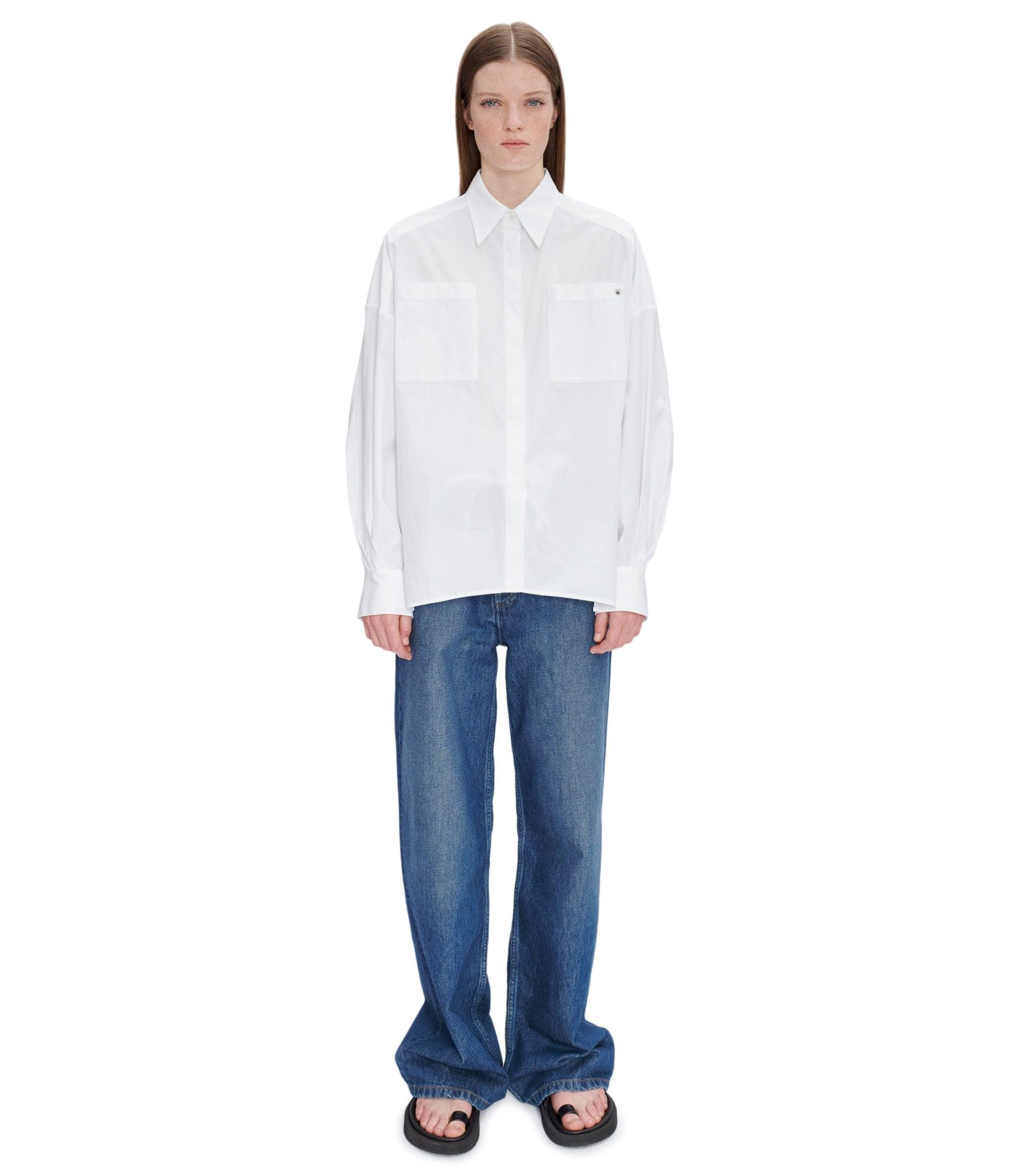 - Oversized cut. - Long and pointed classic collar. - Rounded hem with side slits. - Two chest pockets, one with a silvertone metal rivet, the signature of the line. - Hidden buttoning with first button visible. - Buttoned cuffs. - Mother-of-pearl buttons. - Box pleat on the back. - 100% cotton derived from organic farming.