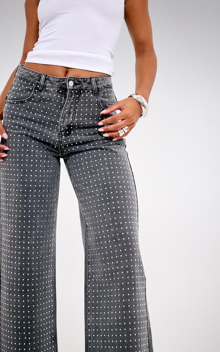 Elevate your off-duty aesthetic in these washed grey diamante front straight leg jeans. Made from wash grey denim, these jeans have shimmering diamente detailing and a straight leg fit. Wear them with a basic white top and silver slip on thong mule heels for a chic look. Length approx 76cm/30inch (Based on sample size US 4)Model wears size UK 8/ EU 36/ AUS 8/ US 4Model Height - 5ft 6inchp]:!mb-4inch>Brand: PrettyLittleThingCategory: DenimProduct type: Straight Leg JeansColor: Washed GreyMaterial: Rigid DenimOccasion: Day