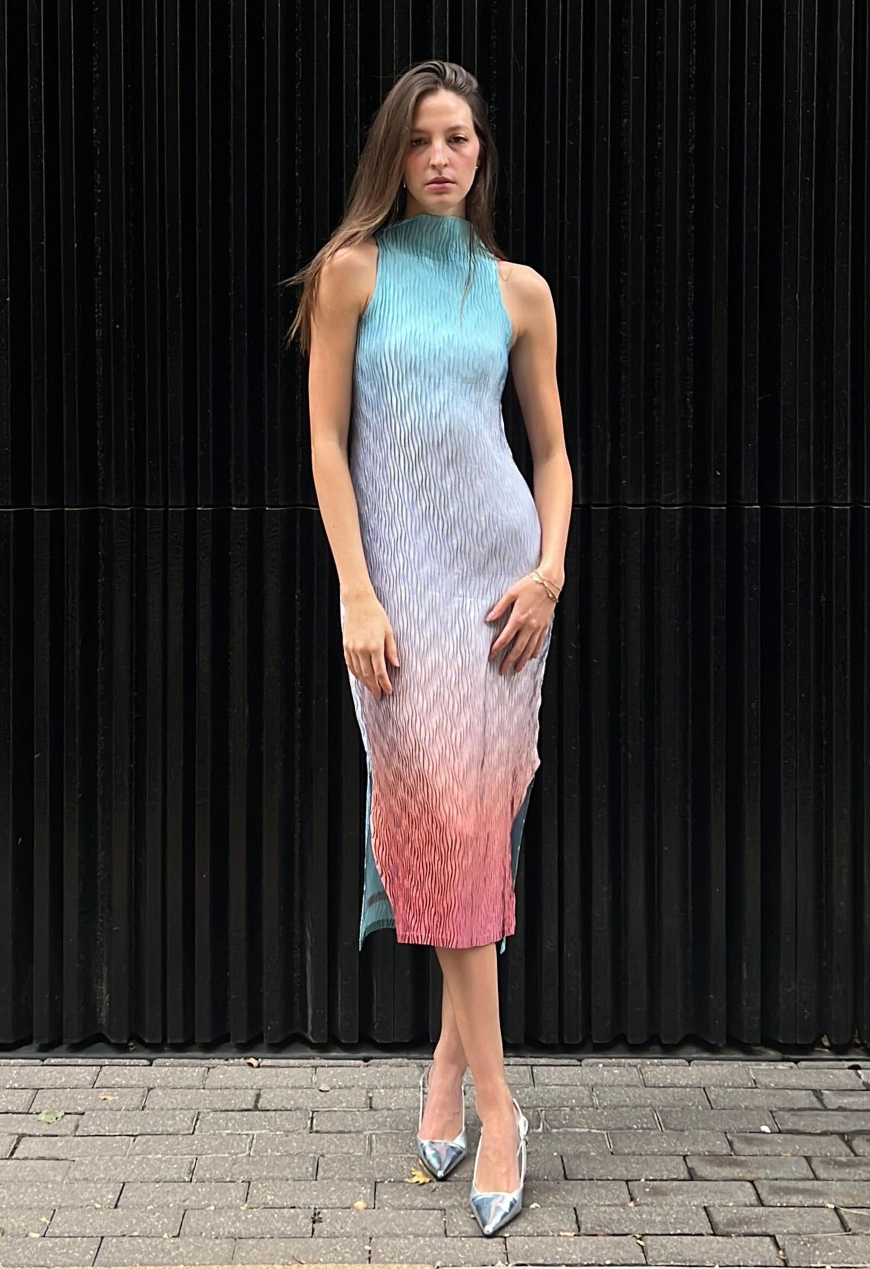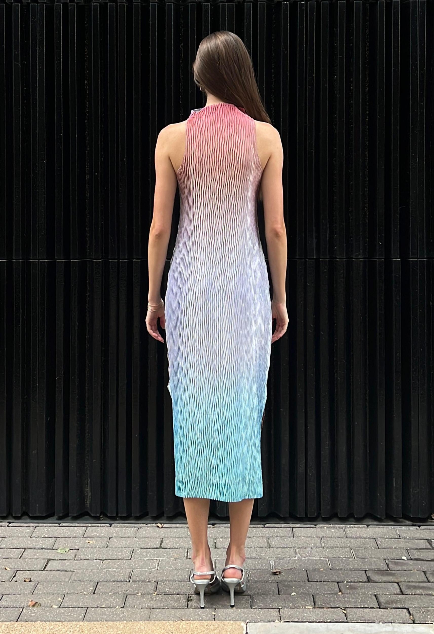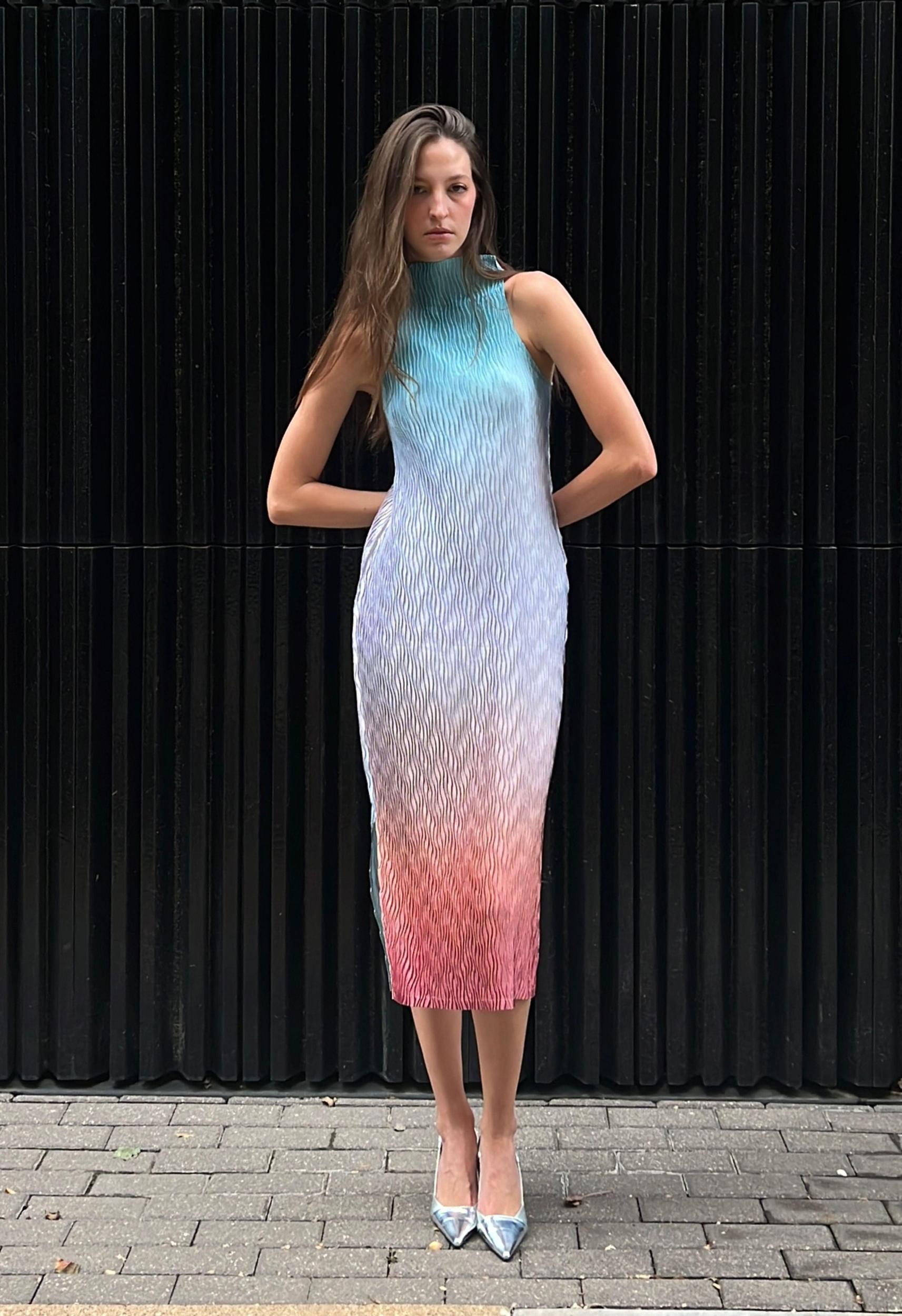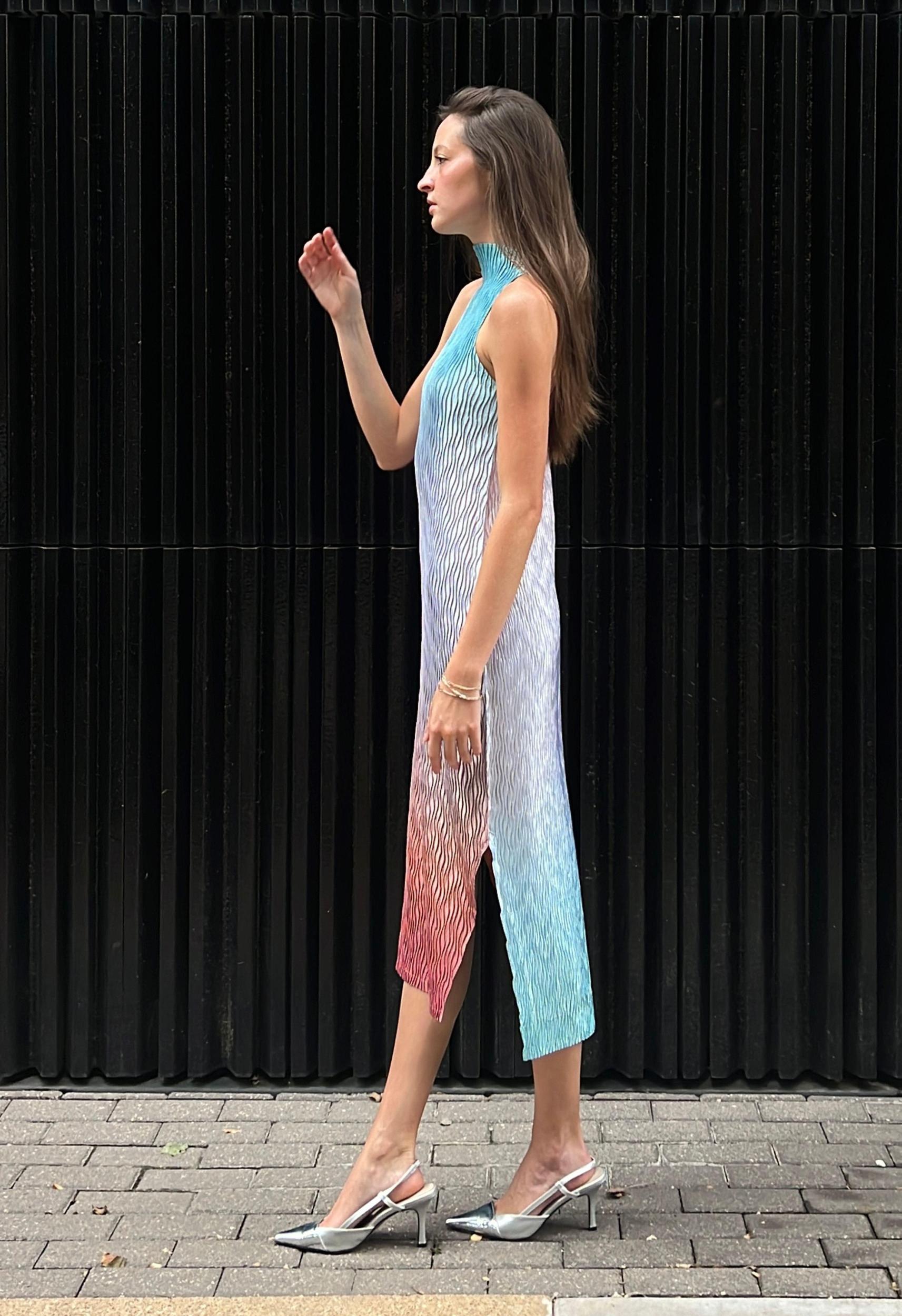 Size: XS-LColor: Gradient ShineMock Neck StyleTank Style DressSide open slits at bottom of dressLonger in back then in the frontPleated using a wave pleat styleHandmade in Mexico City100% PolyesterHand Wash Cold or Dry CleanBy Nin Studio
